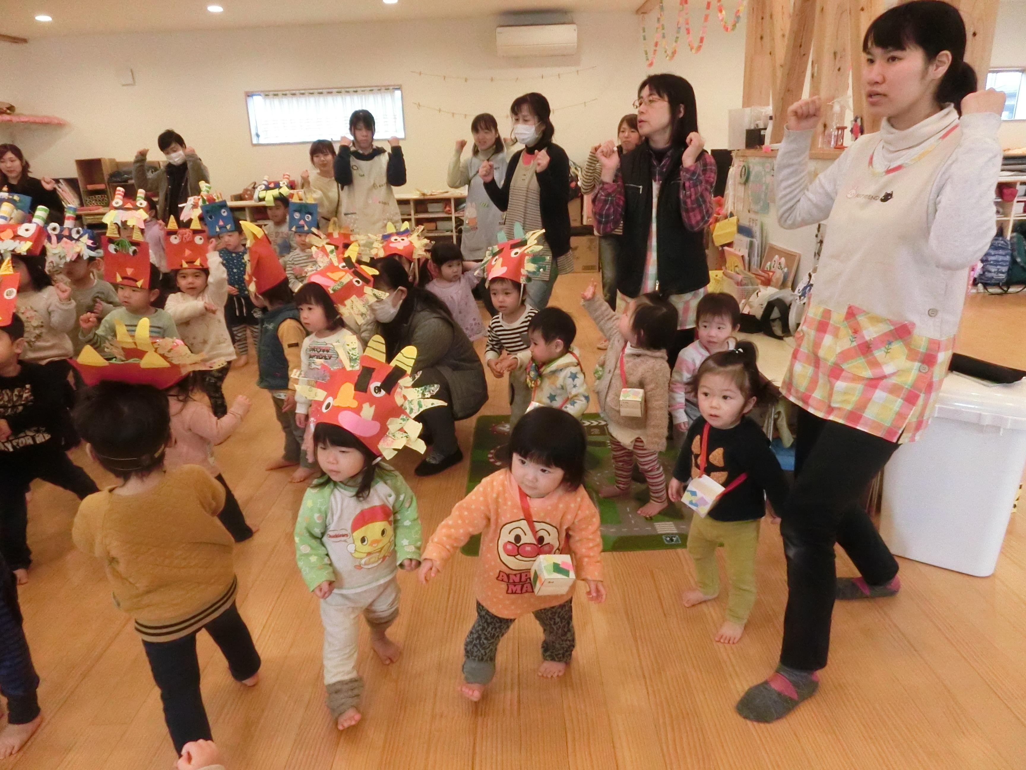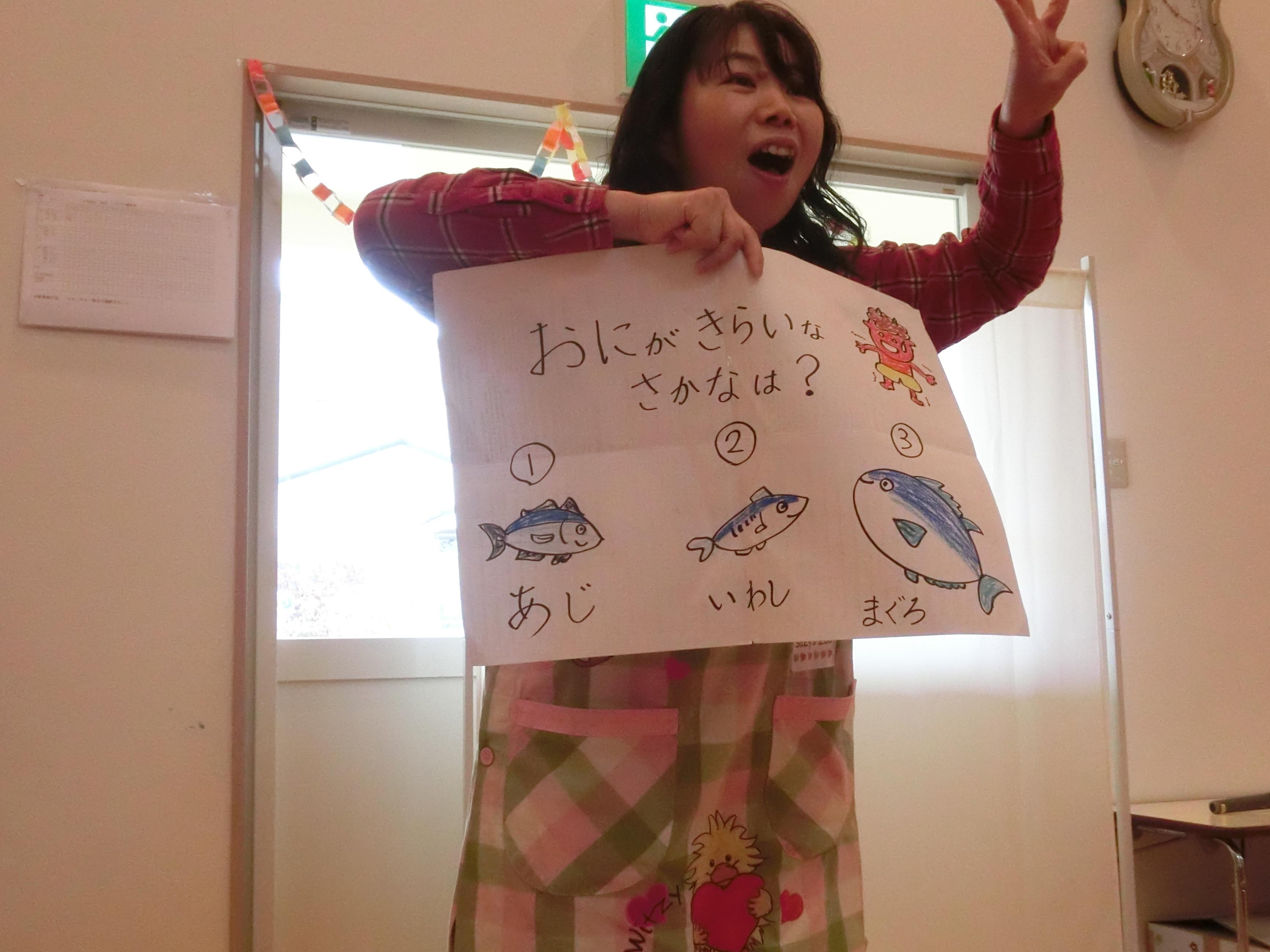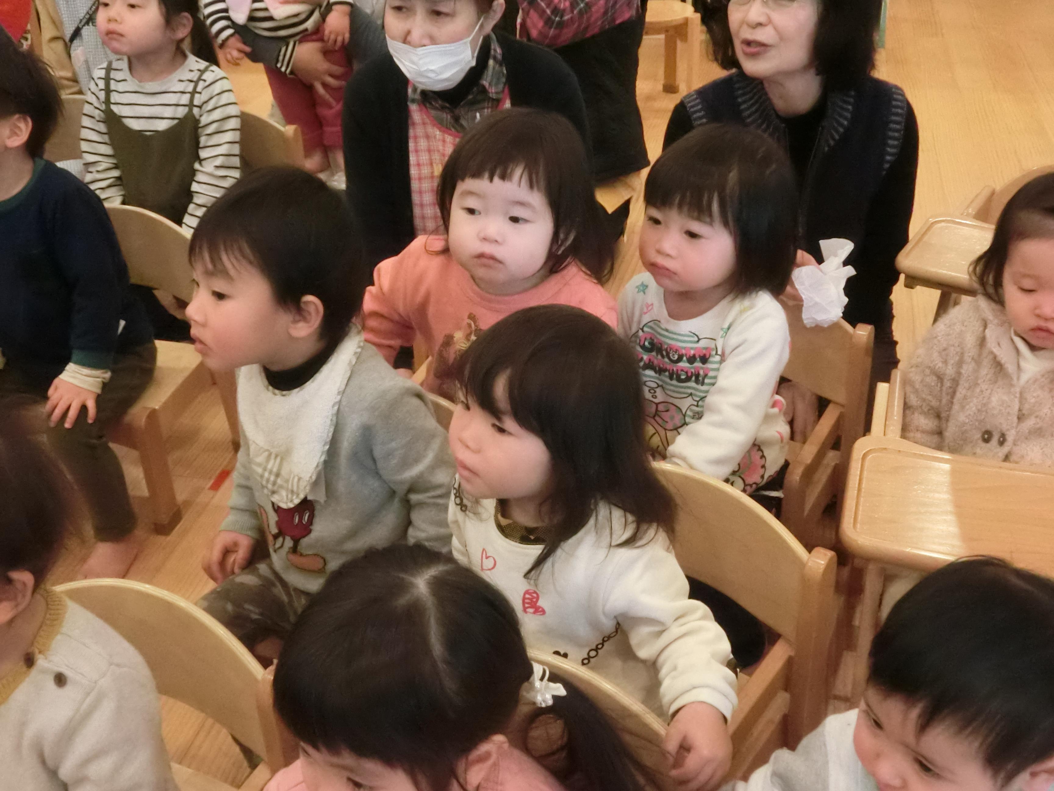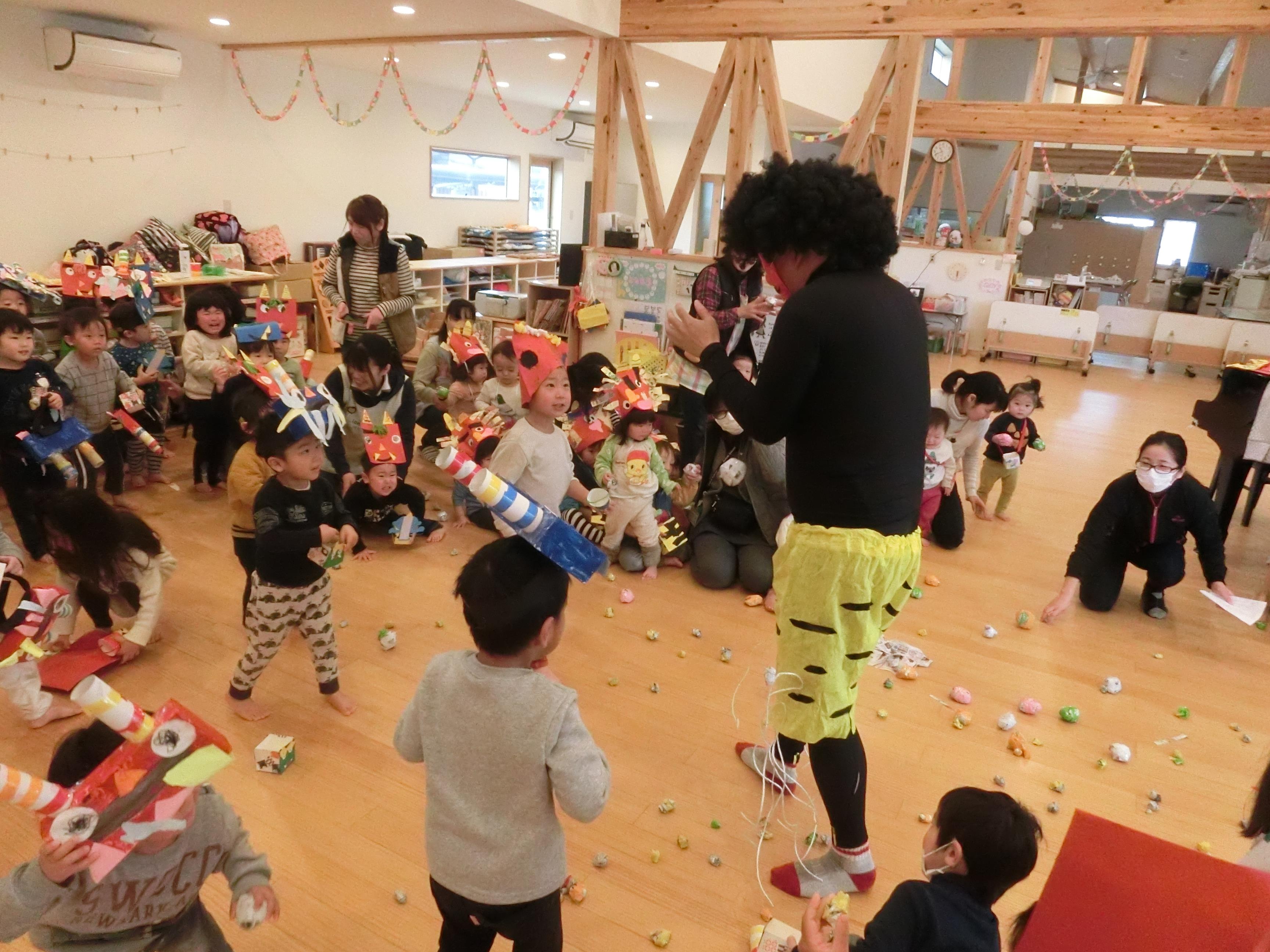季節行事とし、取り組んでいる2月の豆まき。それぞれの年齢によるお面や桝の制作をして参加しました。年長組の風船を使った「張りぼての面」隙間なく貼り合わせる事で、強度を増したりリアルになったり、一人ひとりが根気よく取り組んでいました。みんなの前に登場したぞう組の鬼さんは、「おにだぞ~」と恥ずかしそうでした。その鬼さんの優しさが伝わったのか、小さいお友だちもやさしく「おには~そと」と新聞豆を投げていました。これから園を巣立っていく年長さんもやさしく鬼をやっつけてもらったので”やる気満々”で頑張ってくれることでしょう。 先生から、鬼の苦手ないわしやヒイラギの話・豆まきの由来の話を聞き、体も心も強い人になれるよう、一斉に豆まきが始まりました。突然の黒鬼の登場には歓声が悲鳴に変わってしまいましたが、子ども達の力を合わせて無事鬼退治も出来ました。園児それぞれが作った鬼のお面はご自宅でも活躍したでしょうか? 健康で、良い春を迎えられますように・・・  |  |  | 「なになに?」 興味津々のりす組さん。 | 「さあ!くいずですよ」 「鬼がきらいなさかなはどれだ?」 | 「う~ん、むずかしいね」 「どのさかなかなあ・・」 |
