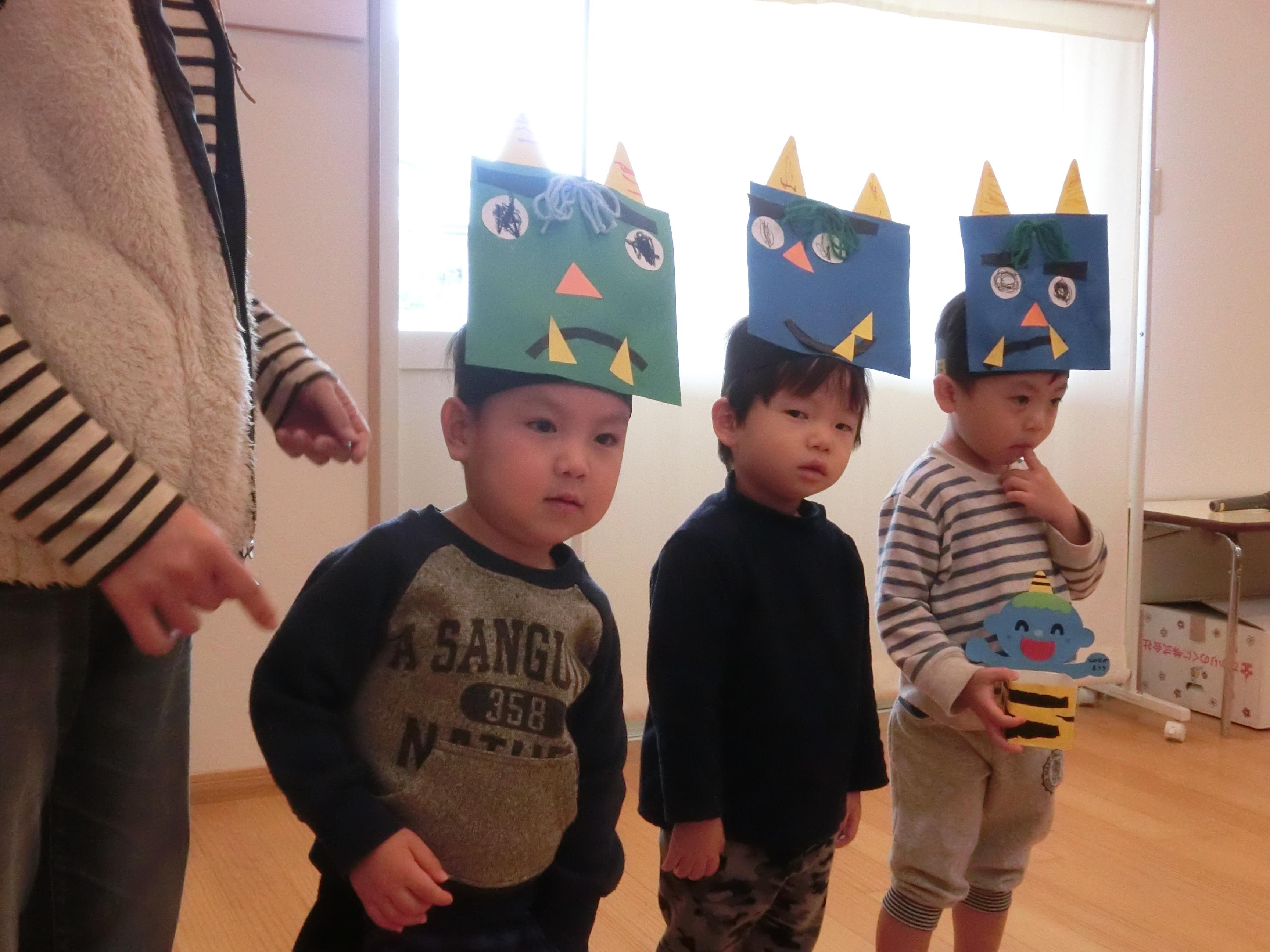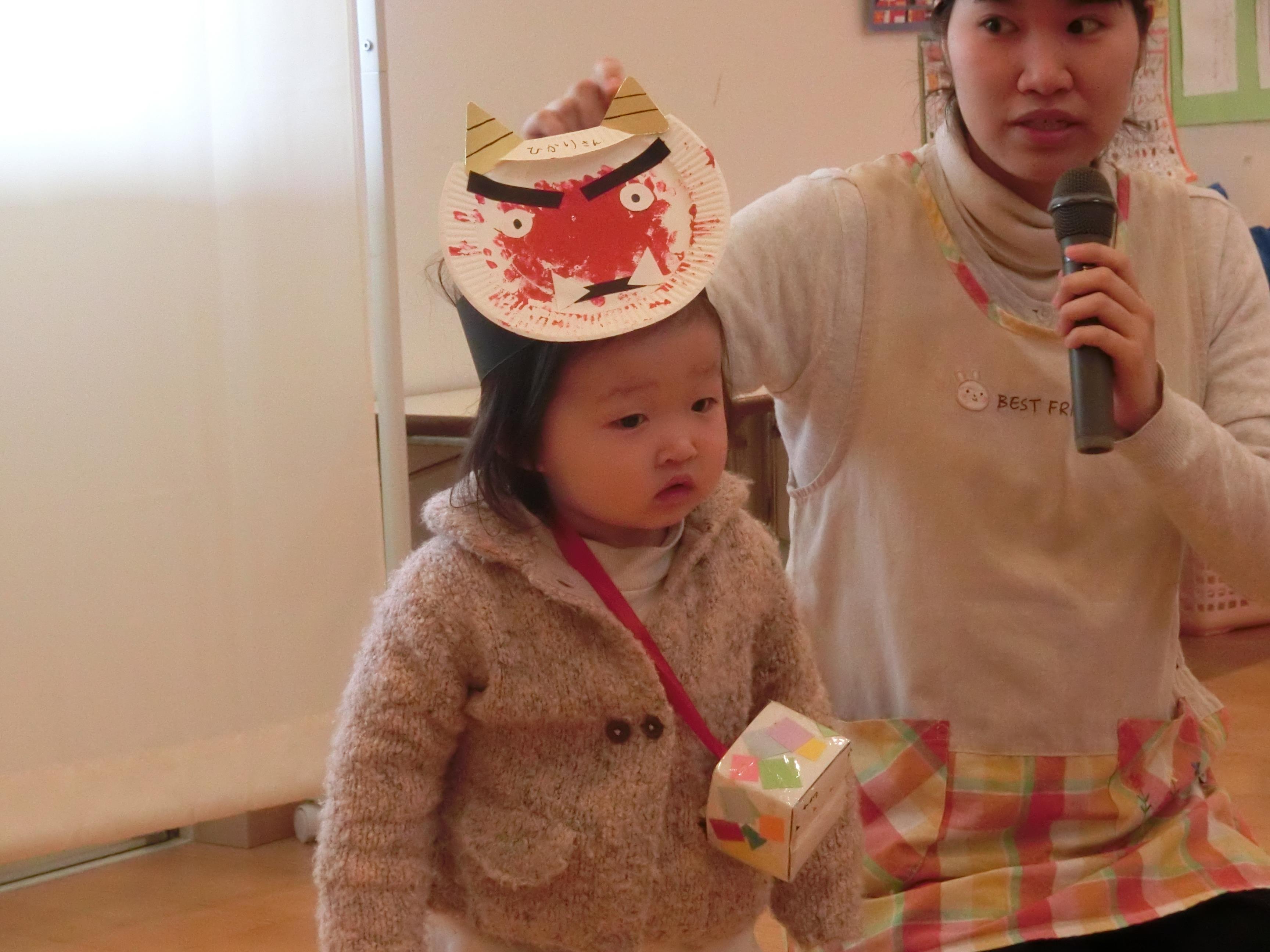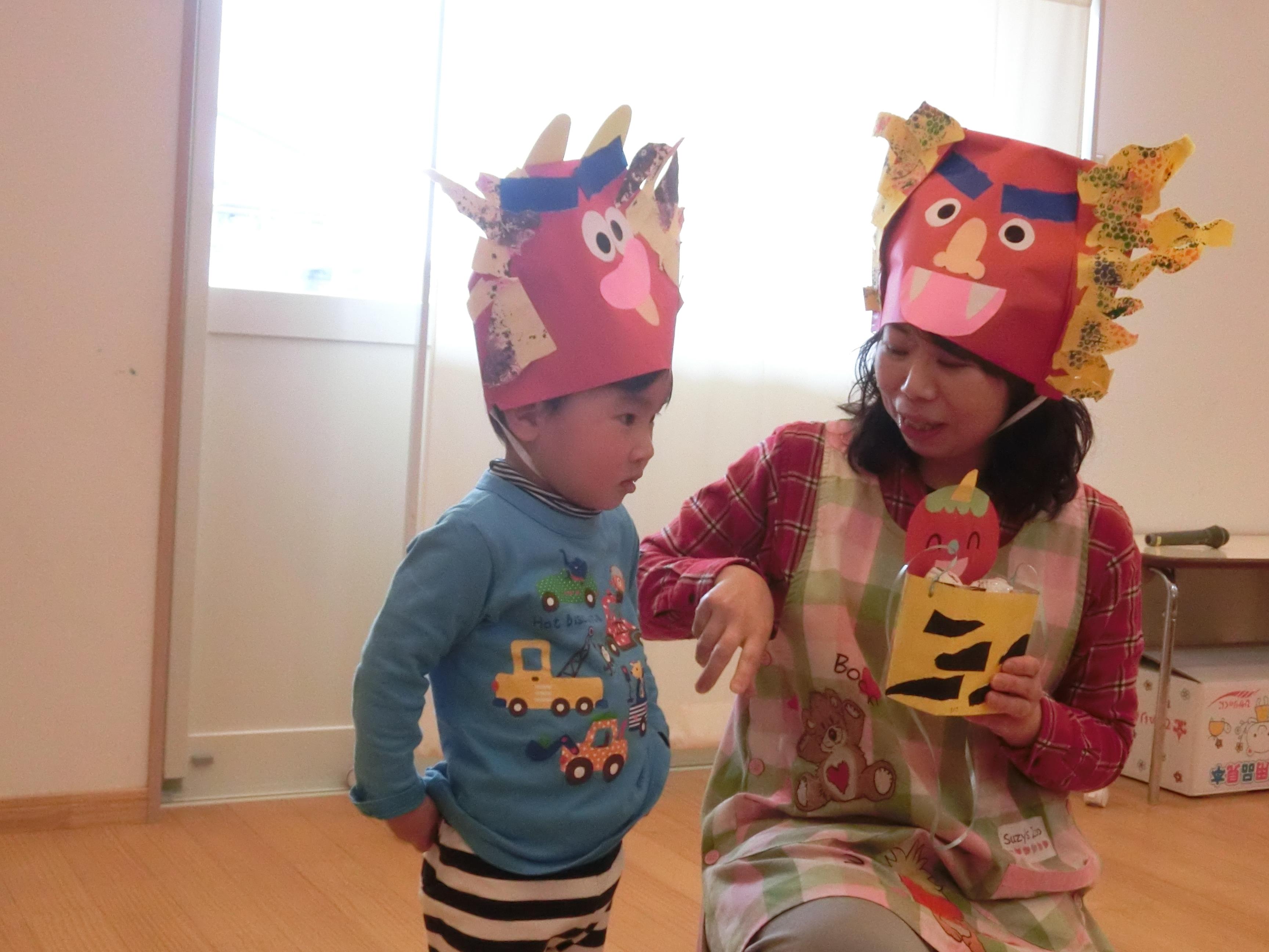 |  |  | 「おにのお面にあってる?」 「おにってこわくない?」 | 「おには~そと」 「ふくは~うち」 | 「えのぐぺたぺたしてつくったよ」「桝のバックもかわいいでしょ」 |