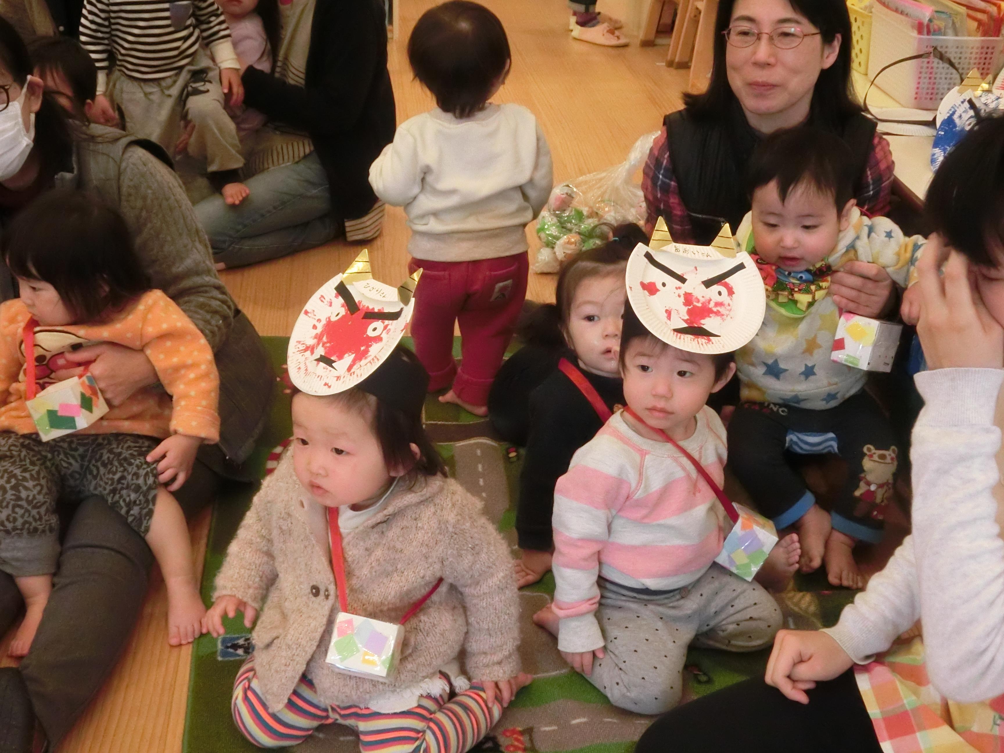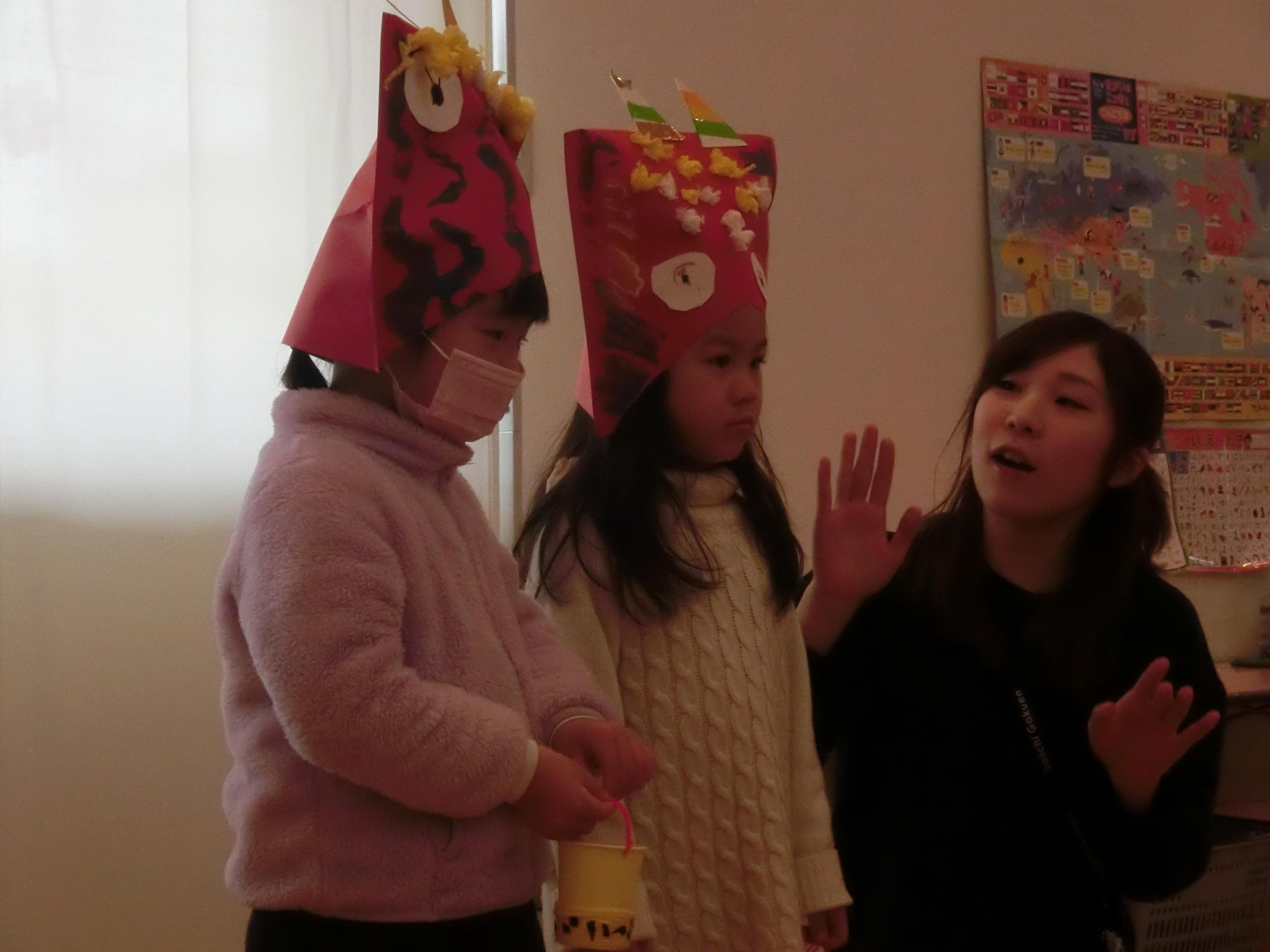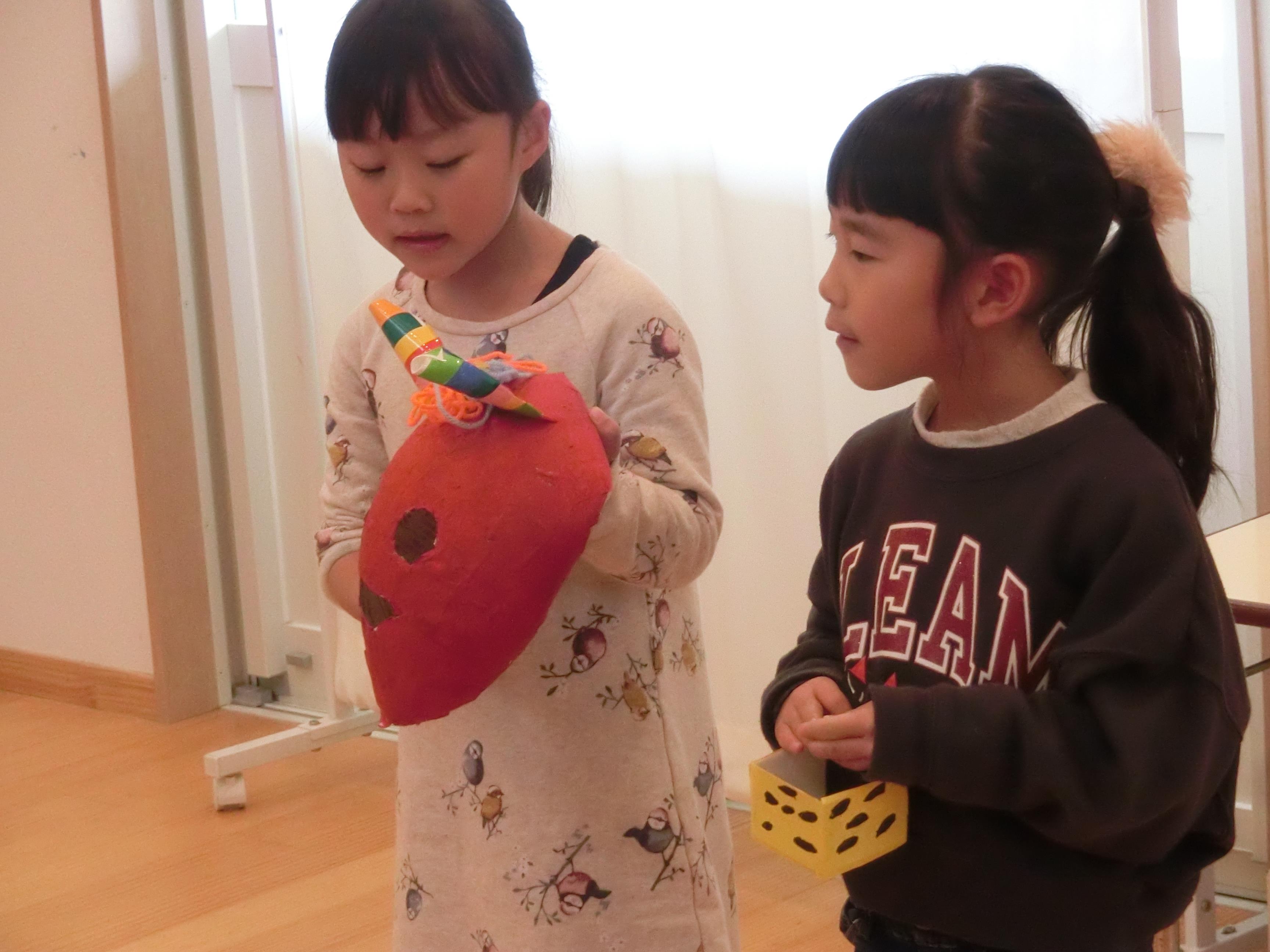|  |  | 「おにのお面にあってる?」 「おにってこわくない?」 | 「おには~そと」 「ふくは~うち」 | 「えのぐぺたぺたしてつくったよ」「桝のバックもかわいいでしょ」 |
