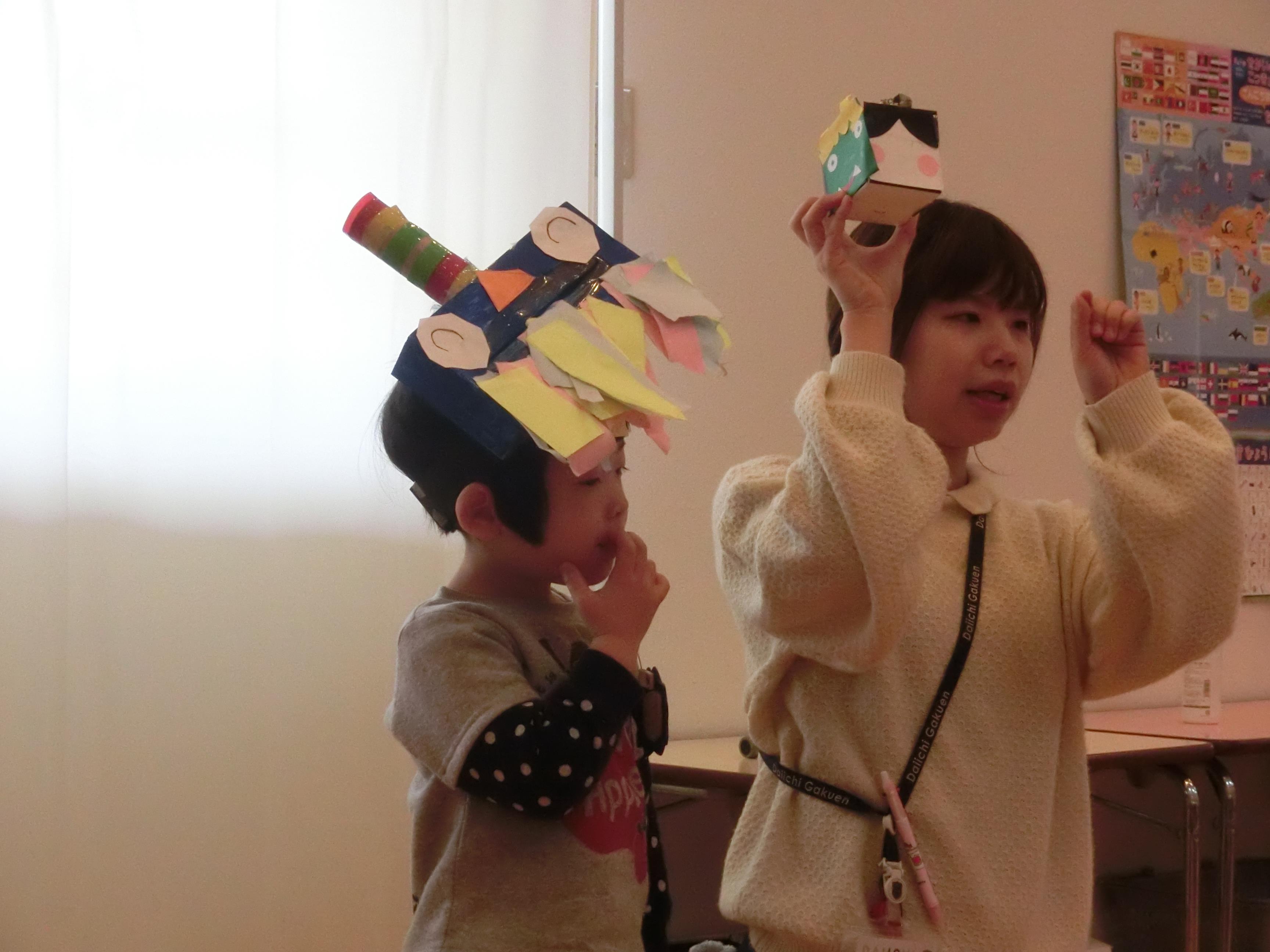 |  |  | | 「髪をびりびりにしてつけたらかっこよくなったよ」 | 「かおのぱーつを自分で考えて貼ったよ」泣き虫や怒りんぼ・笑い鬼が出来ました。 | 「テイッシュの箱を使って作ったよ」角をつけるのが難しかったな |
