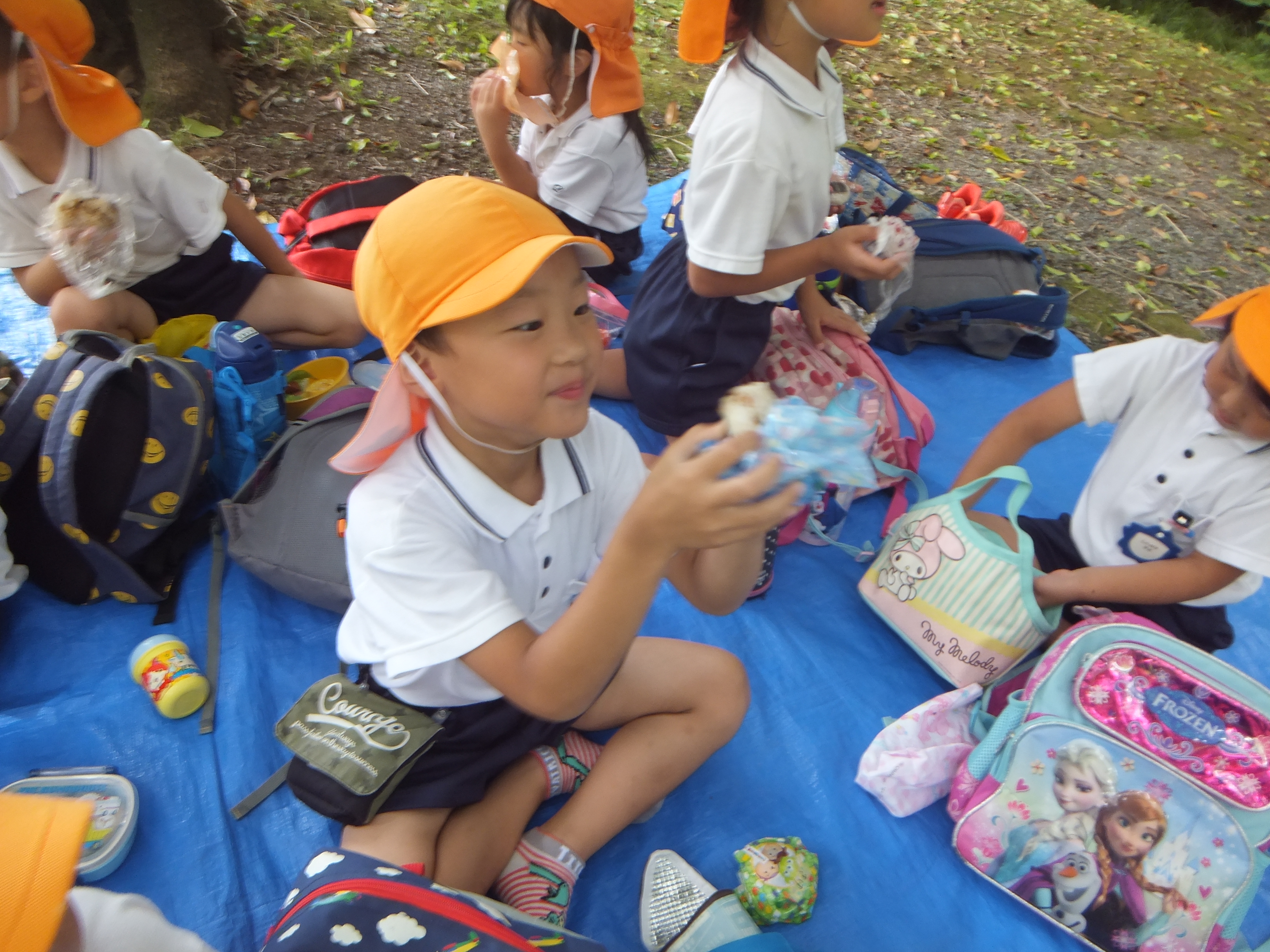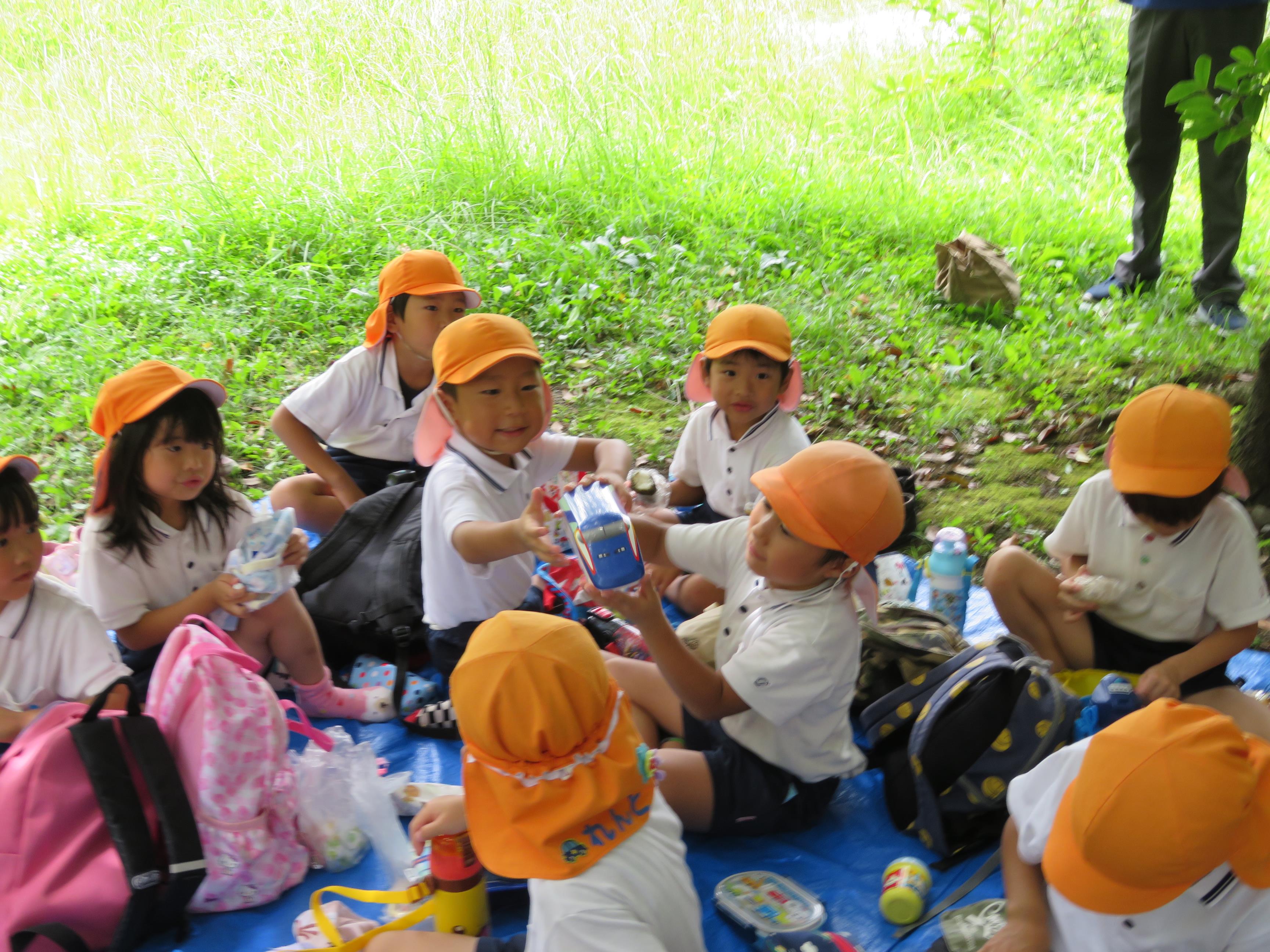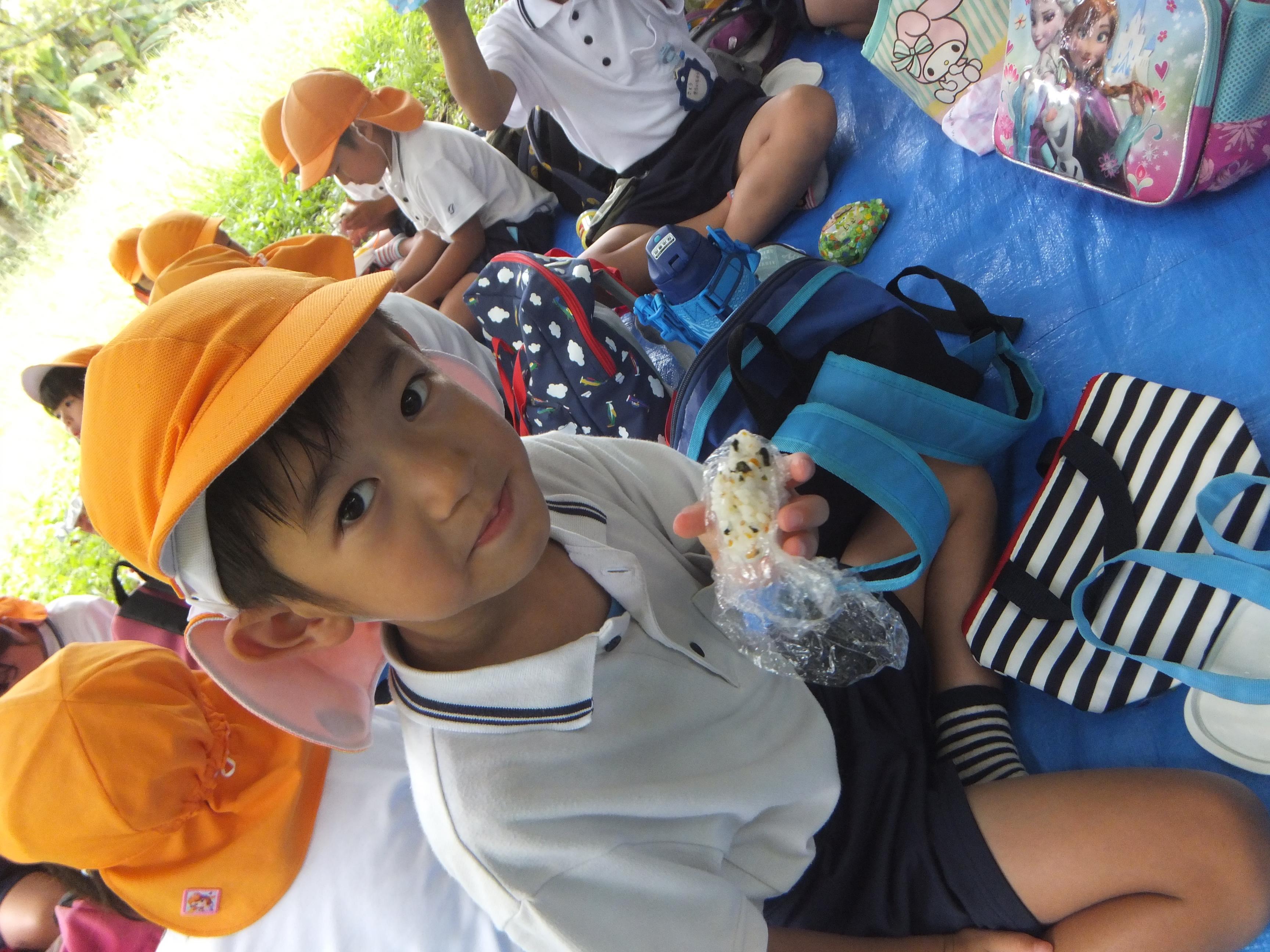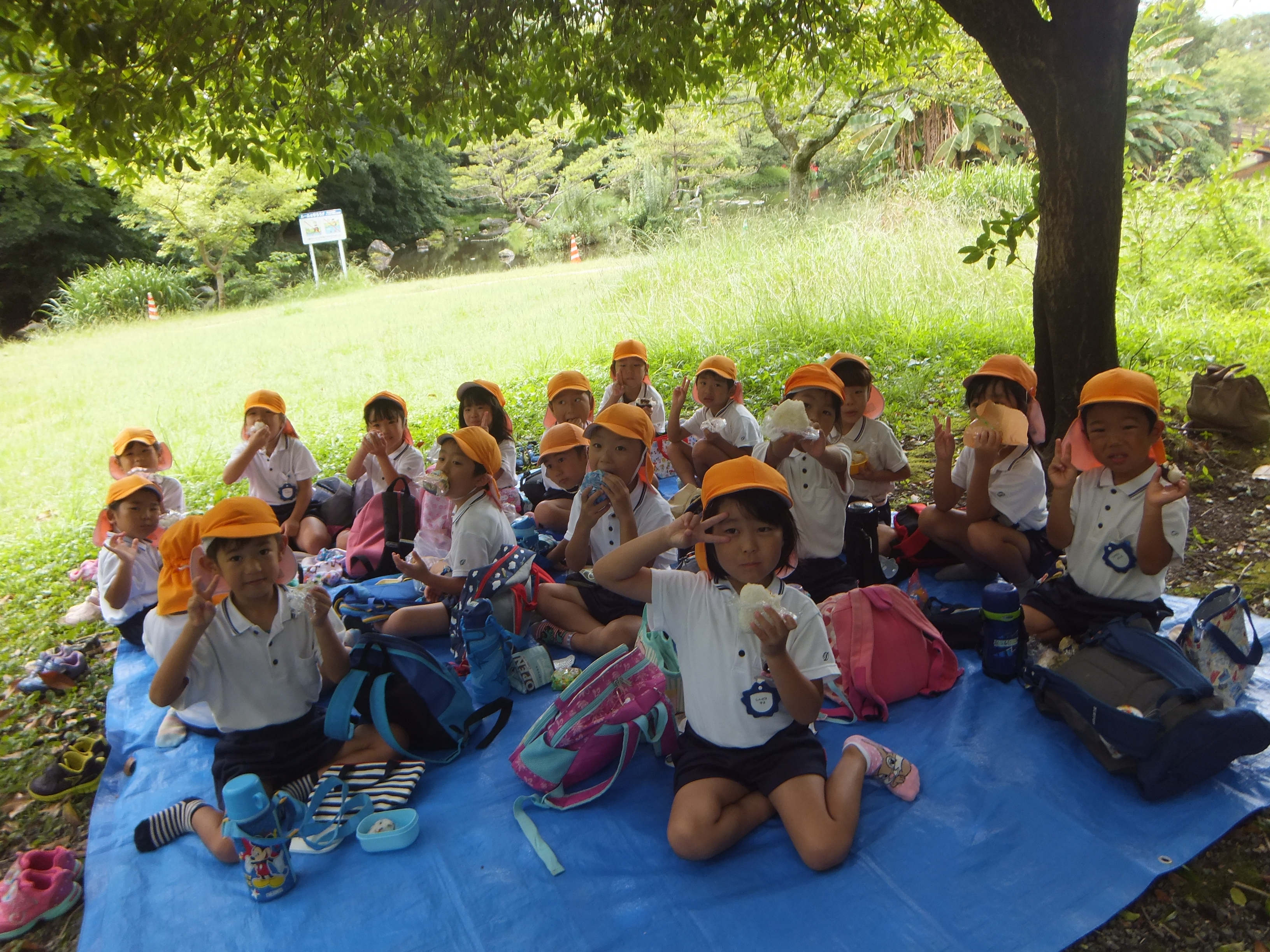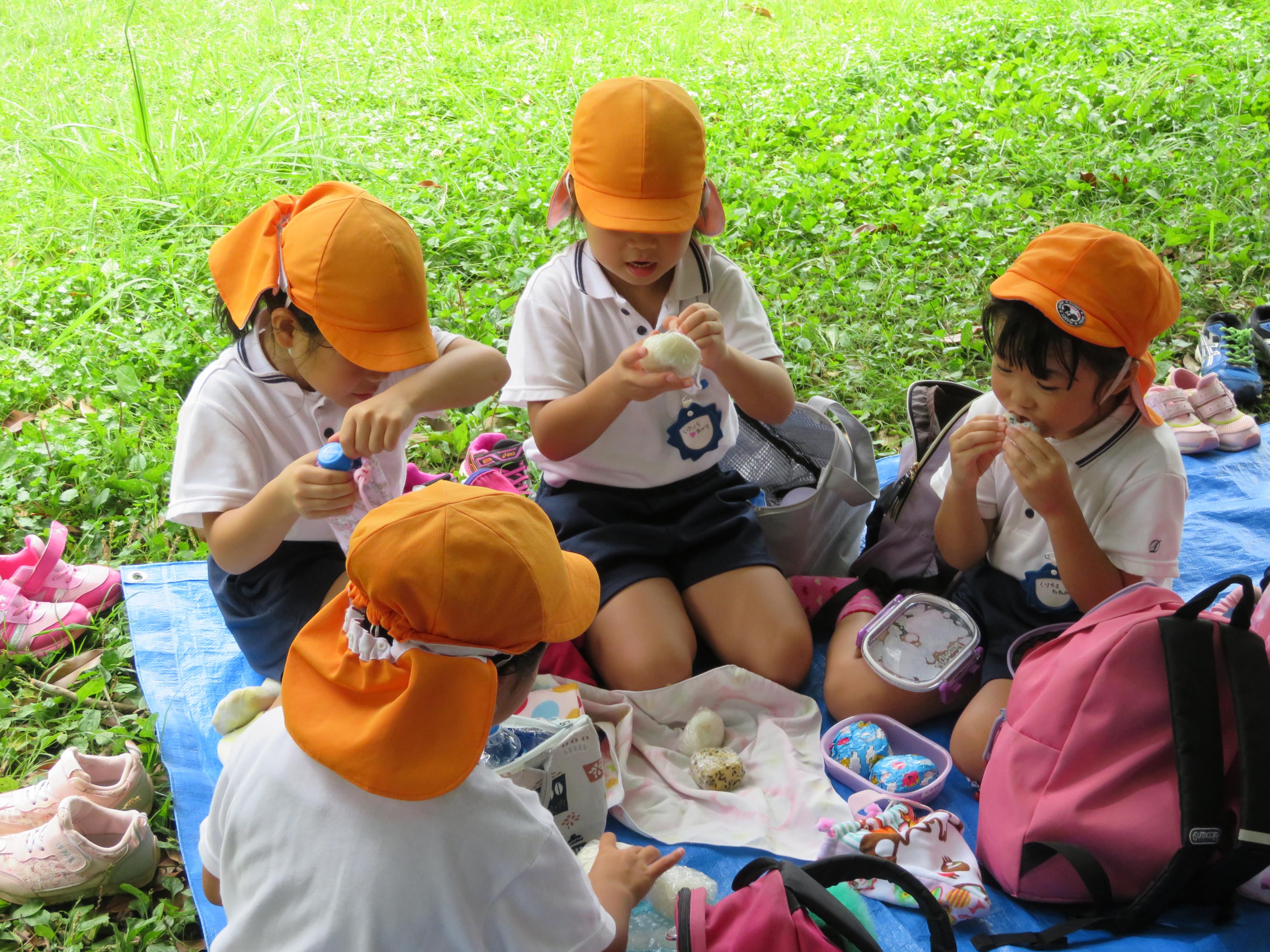 公園の木陰で昼食です。 お家の方の手作りおにぎりを前に「おなかがすいたね」と頂きますも待ち遠しいようです。 「ぼく。しゃけとこんぶ。」「わたしは三個あるよ」「おいし~い」 大きな木陰に「森みたいだね」と想像豊かに色々な体験をしています。子ども達の発想豊かな会話が楽しいひと時でした。  |  |  | 「こんぶ入ってた」 「おかあさんのおにぎり。ダだーいすき」 | 「みてみて!このおにぎり混ざってるんだよ」 | 「これ、二個目だよ」 パクパクと食べ進んでいました。 |