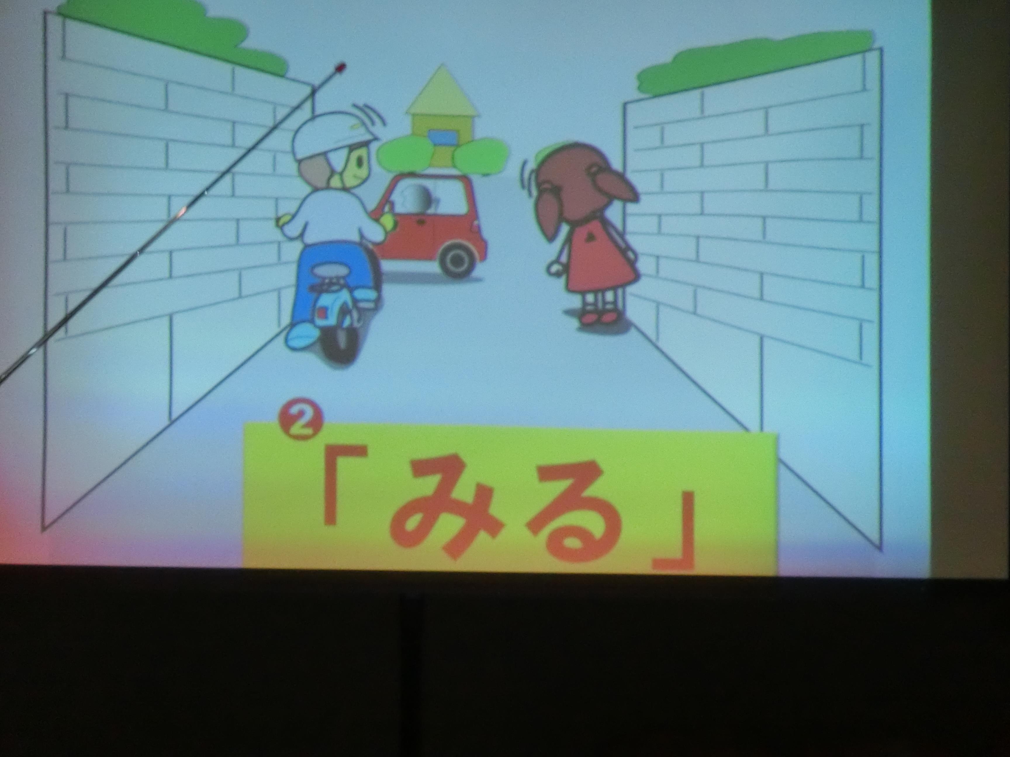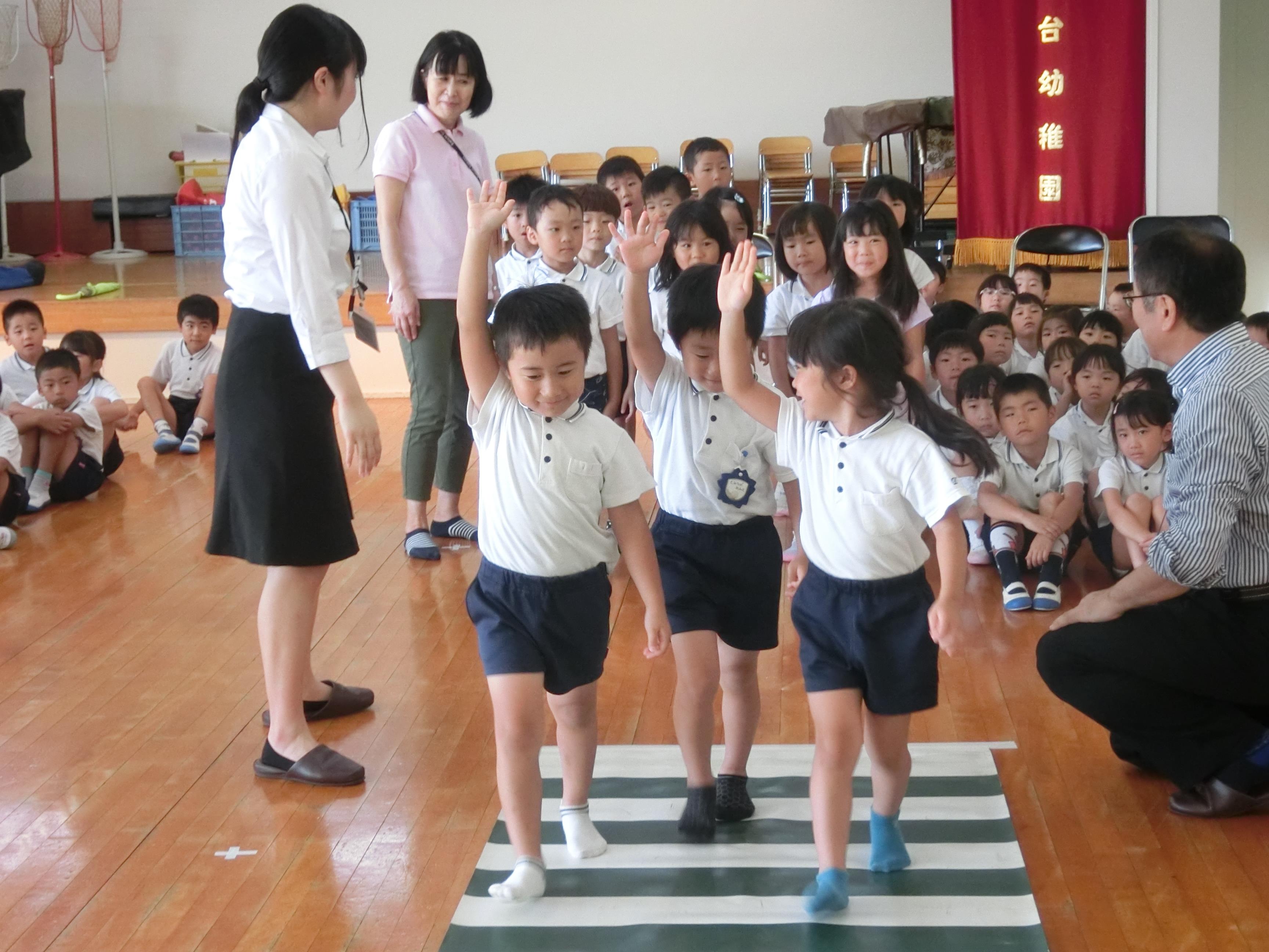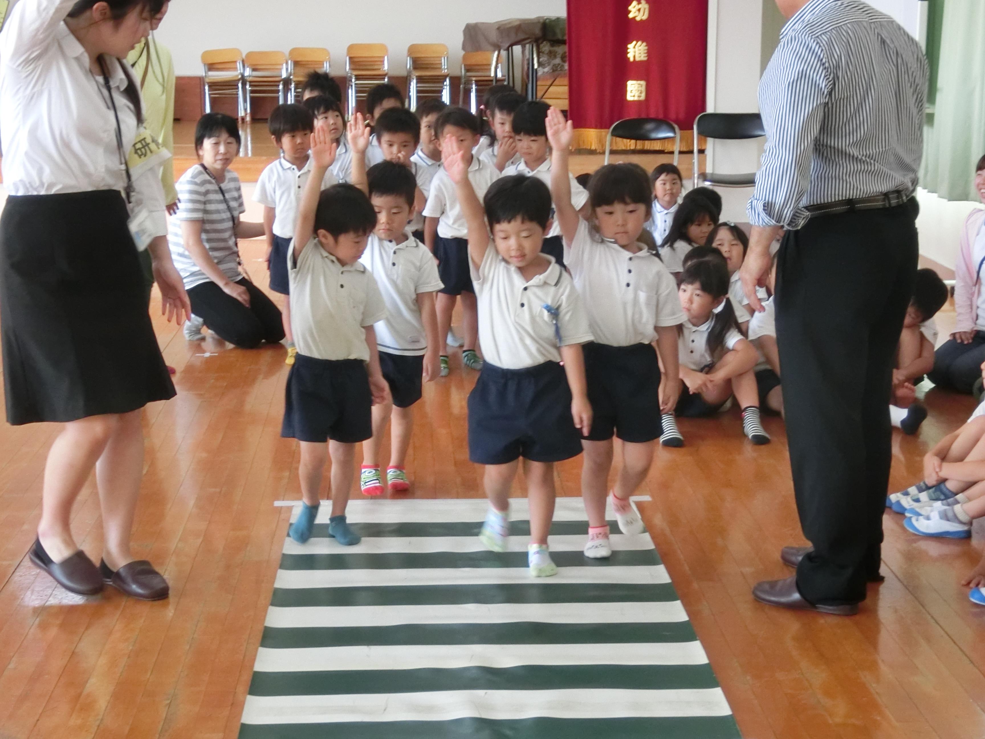 杉並台幼稚園のリズム室に、幼稚園・保育園・こども園のお友だちが集合して、大津交通安全協会・合志市交通安全課の方のお話を聞きました。映像と質問を織り交ぜた内容で、「命をまもる」大切さ・方法を分りやすく話して頂き、興味をもって聞き入ることが出来ていました。 間違い探しの場面では、食い入るように身を乗り出す様子を「横断するときの姿勢・関心」につなげていただいたので、子ども達も理解しやすかったようです。その後の横断練習時に発揮できていたように思います。 交通安全ルールの中で、大切な事は「止まる・見る」事です。遠くに見える車もあっという間に近づいてくる事を判断するためには、止まって見るが必要です。お子様と道路を渡る時、一緒に確認してみてください。それぞれ【行動に意味があること】を体感して頂きたいと思います。 こども園の子ども達は、散歩や幼稚園活動参加時において、先生と共に体験を繰り返しています。  |  |  | | 大津交通安全課の方の話をしっかり聞きました | スライドを見ながら、何を守ることが命を守ることとなるのか学びました。 | SKT年長児全員で渡り方の確認をしました。 手を上げて右左を良く見る! |