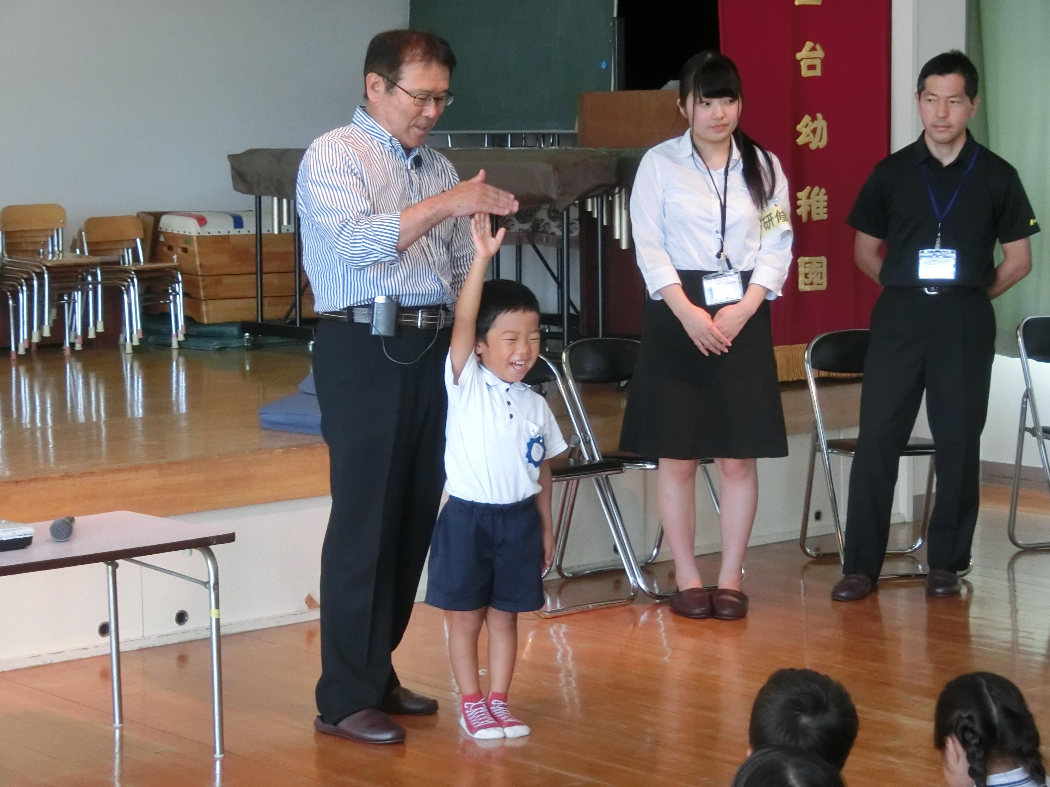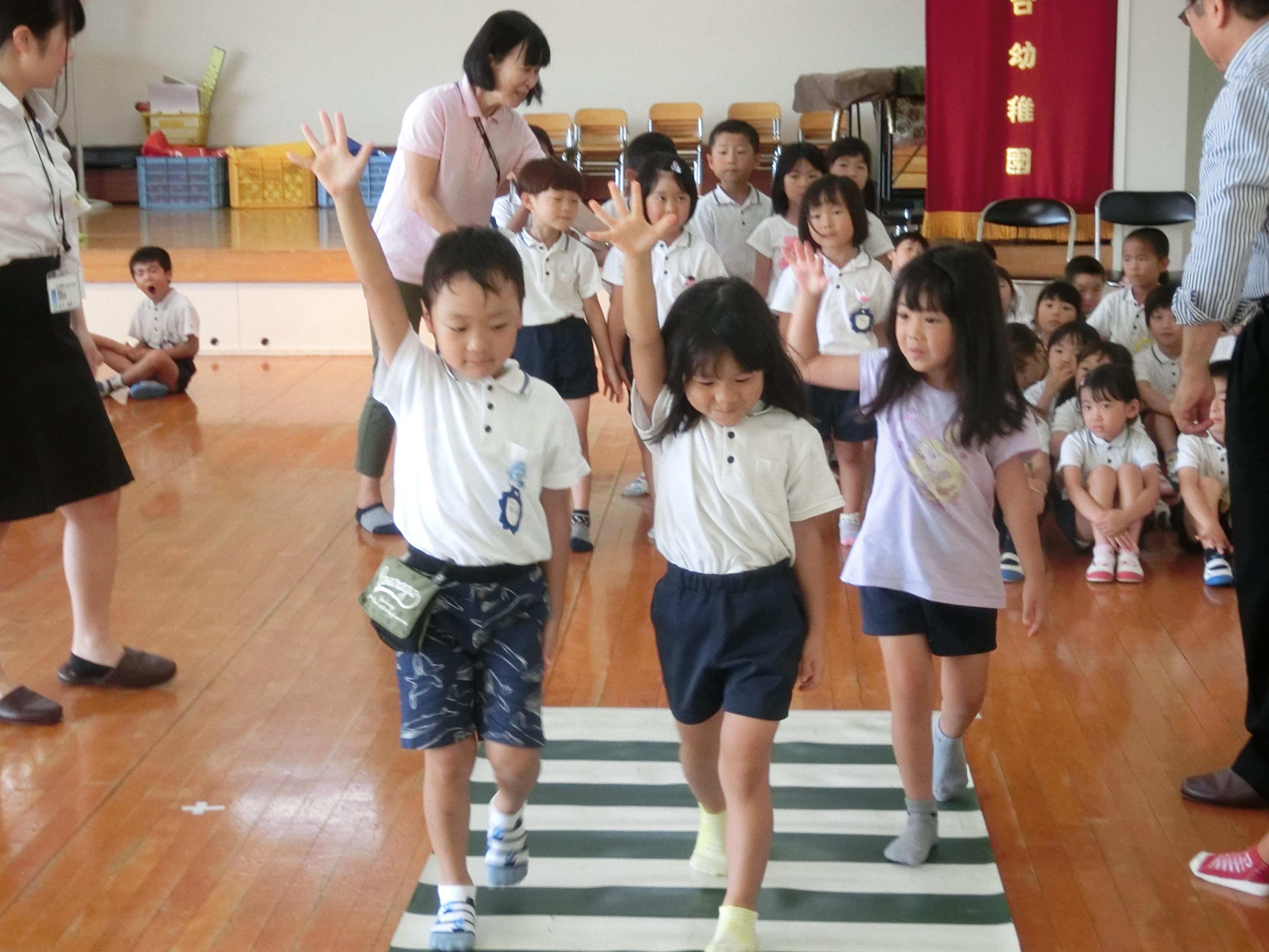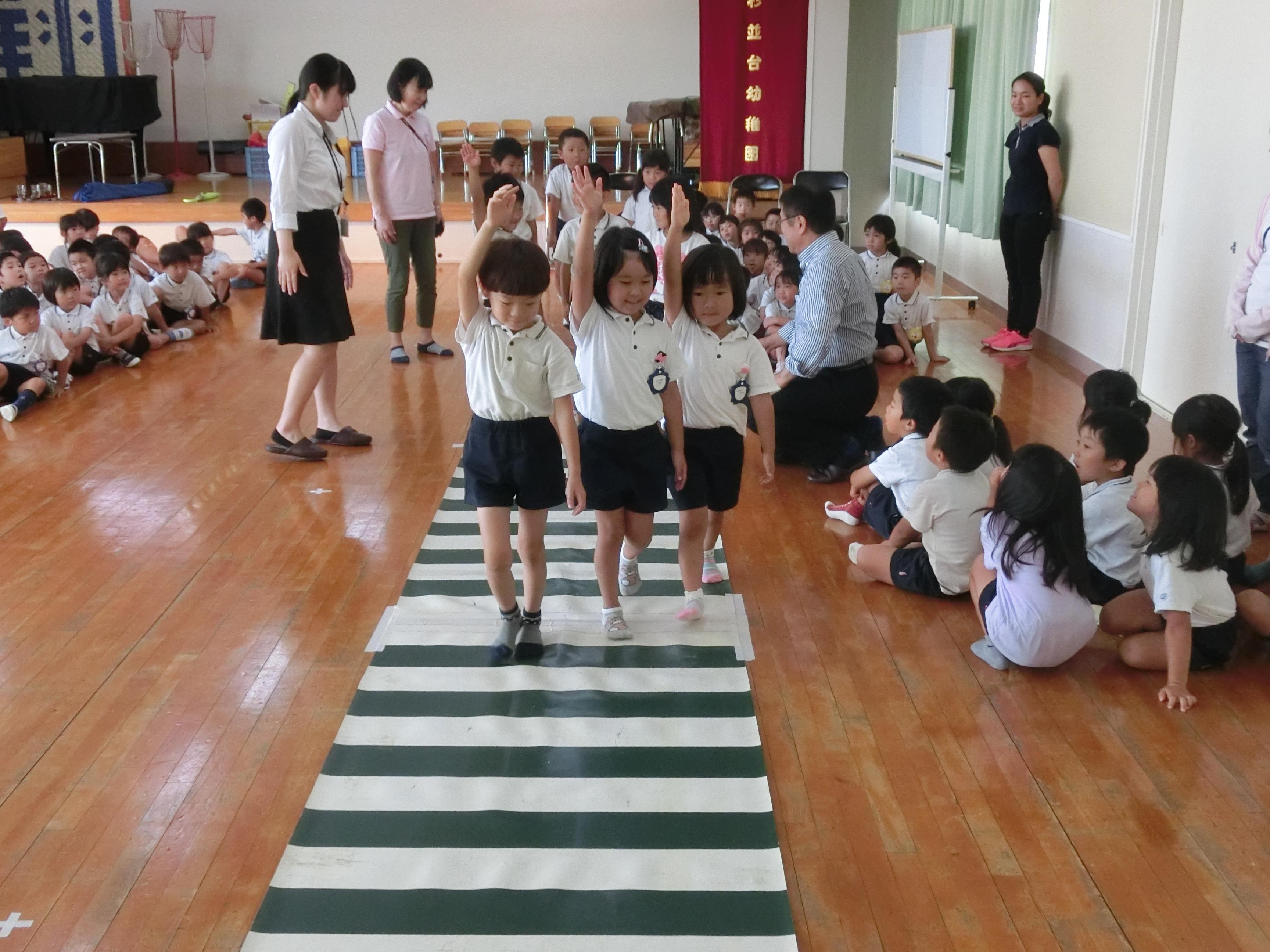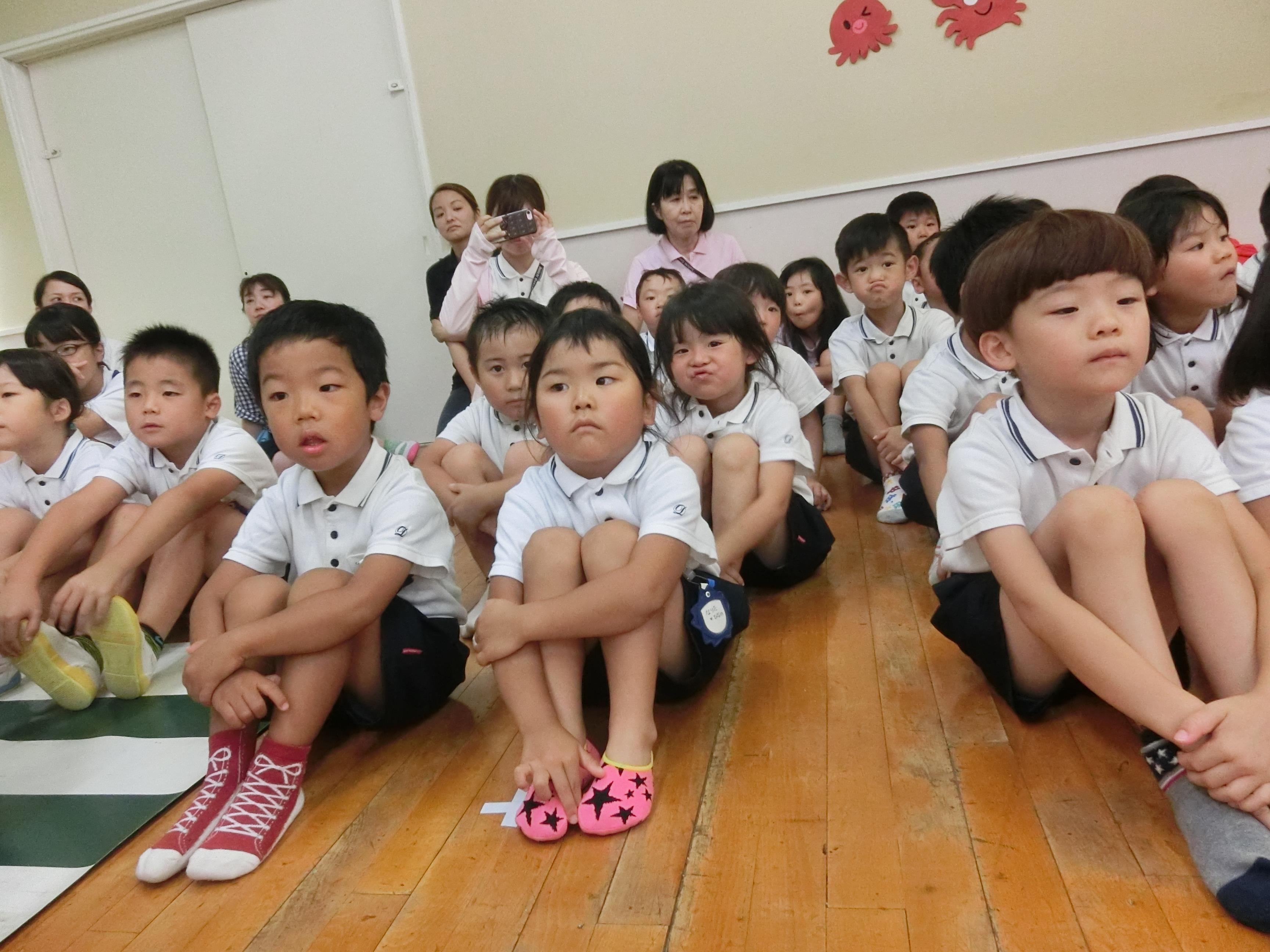 杉並台幼稚園のリズム室に、幼稚園・保育園・こども園のお友だちが集合して、大津交通安全協会・合志市交通安全課の方のお話を聞きました。映像と質問を織り交ぜた内容で、「命をまもる」大切さ・方法を分りやすく話して頂き、興味をもって聞き入ることが出来ていました。 間違い探しの場面では、食い入るように身を乗り出す様子を「横断するときの姿勢・関心」につなげていただいたので、子ども達も理解しやすかったようです。その後の横断練習時に発揮できていたように思います。 交通安全ルールの中で、大切な事は「止まる・見る」事です。遠くに見える車もあっという間に近づいてくる事を判断するためには、止まって見るが必要です。お子様と道路を渡る時、一緒に確認してみてください。それぞれ【行動に意味があること】を体感して頂きたいと思います。 こども園の子ども達は、散歩や幼稚園活動参加時において、先生と共に体験を繰り返しています。  |  |  | | 大津交通安全課の方の話をしっかり聞きました | スライドを見ながら、何を守ることが命を守ることとなるのか学びました。 | SKT年長児全員で渡り方の確認をしました。 手を上げて右左を良く見る! |