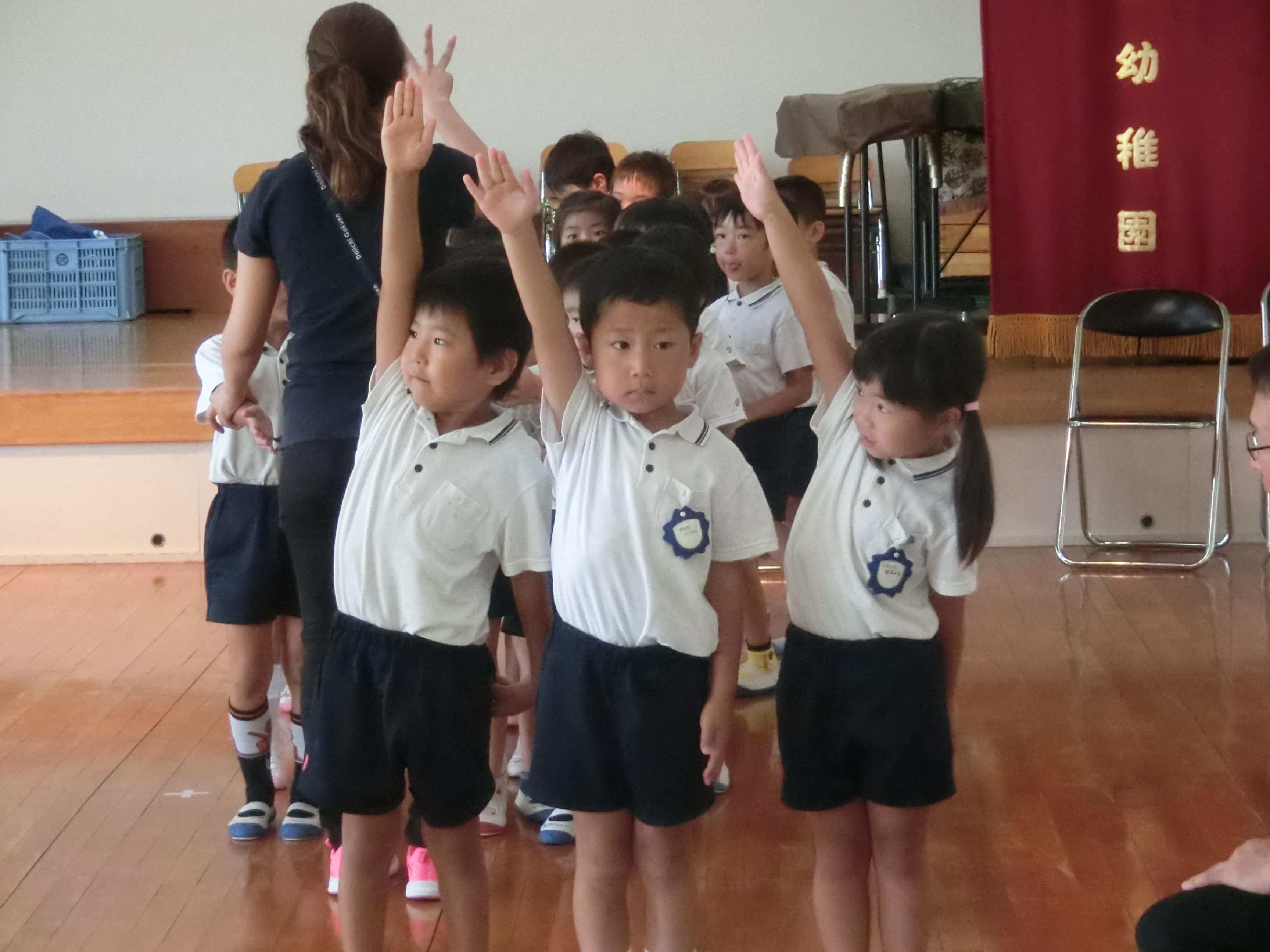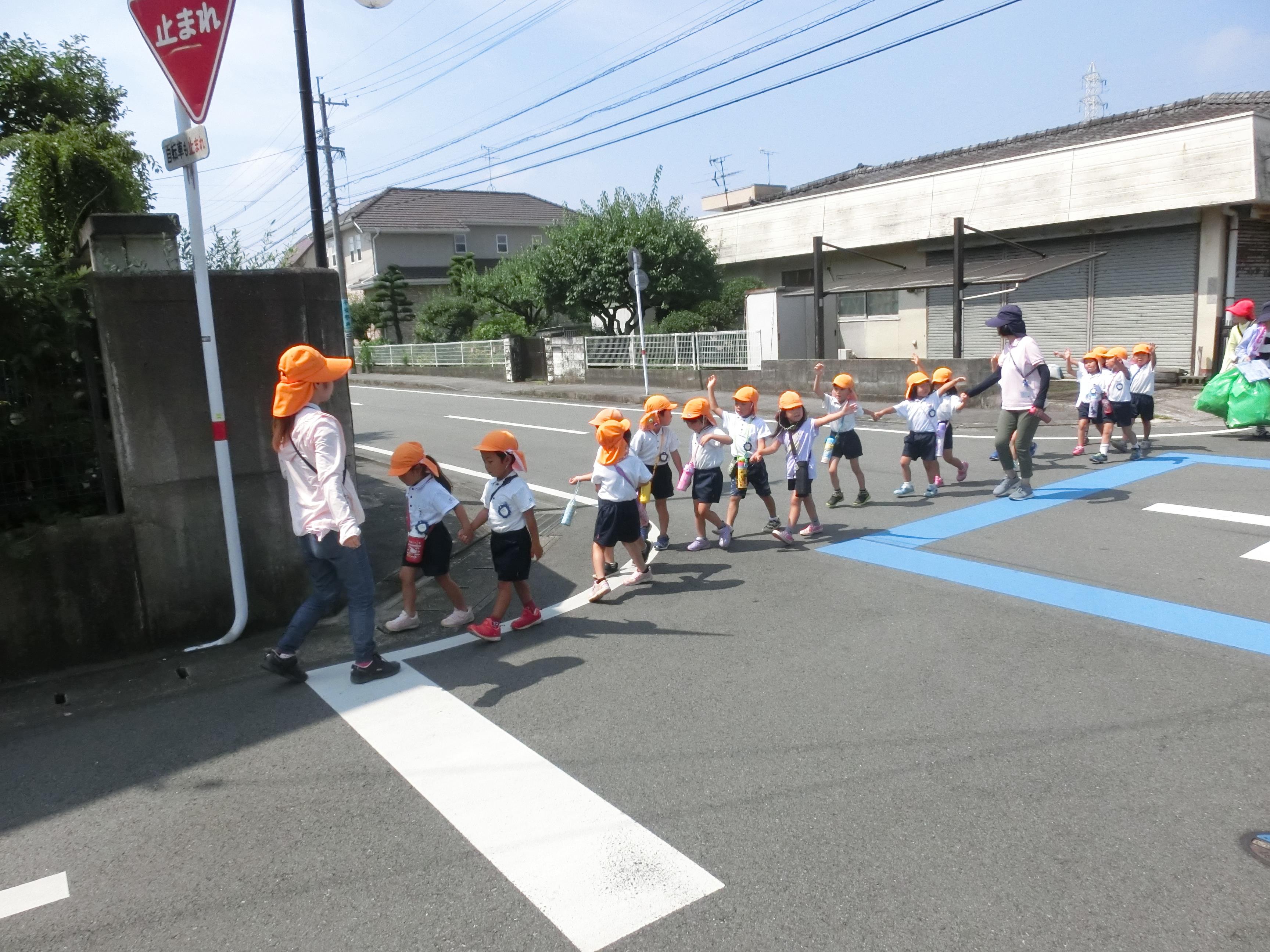|  |  | | 右を見て!左を見て!もう一度右を見て!! | きりん組さんも挑戦 うまくできました。 | 幼稚園に行くときはいつも「手を上げて・・・・」をみんなでやっているよ。 自分の命は自分で守る!! |
