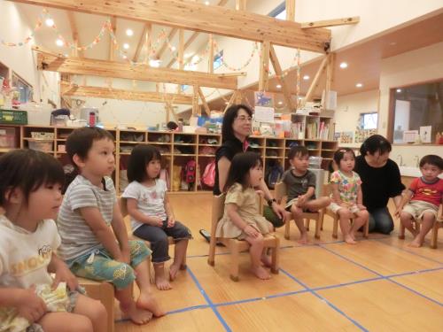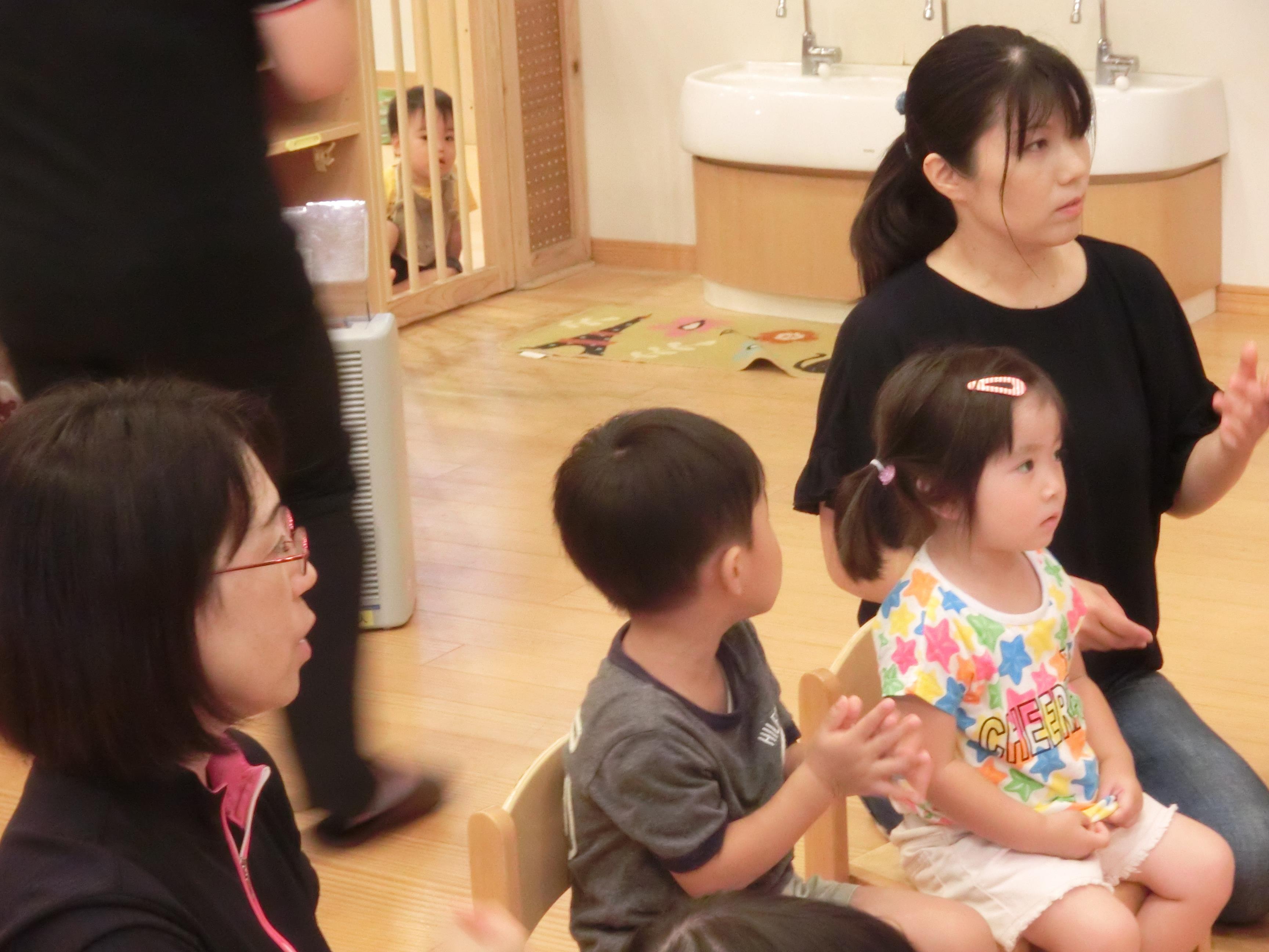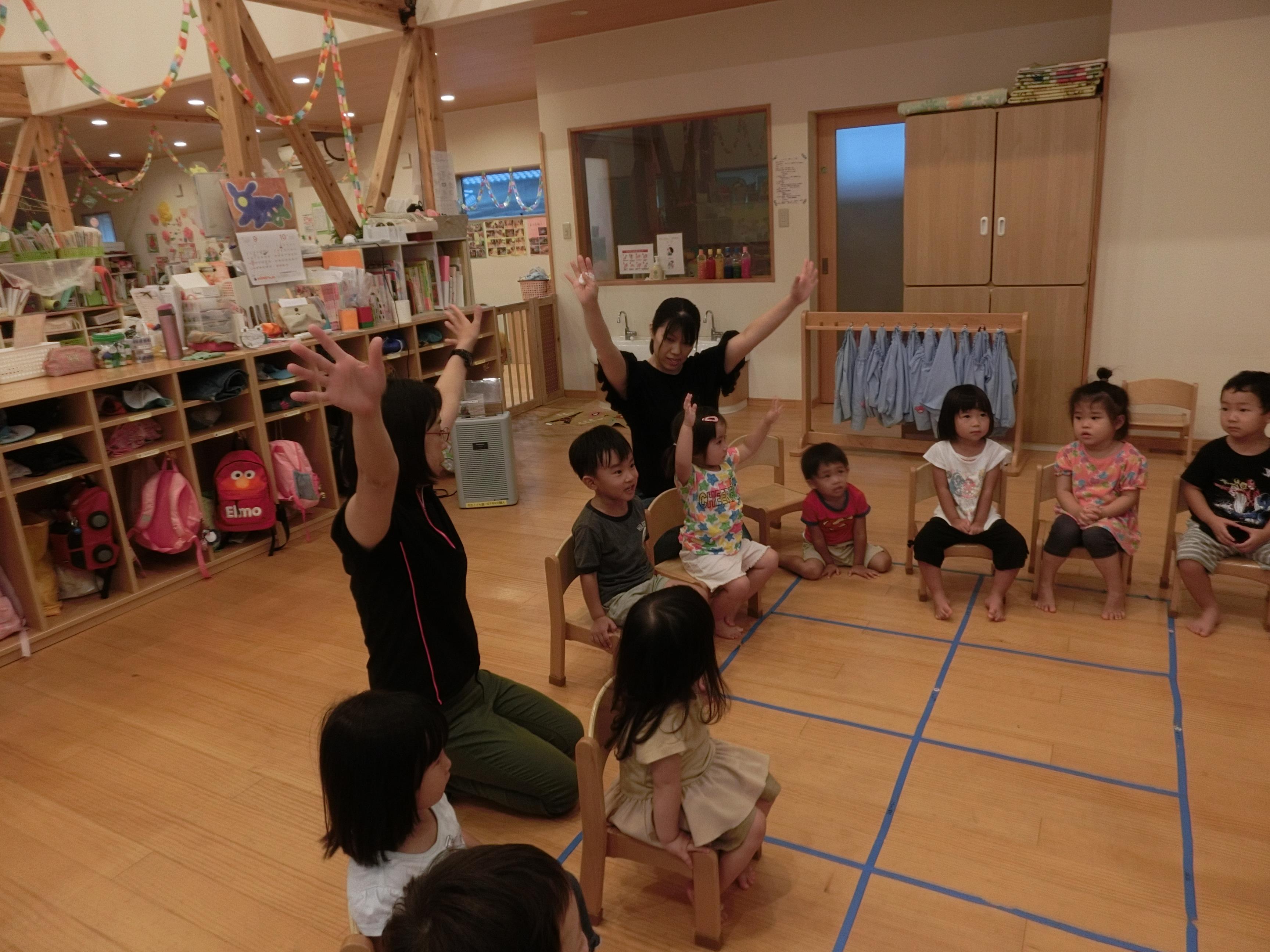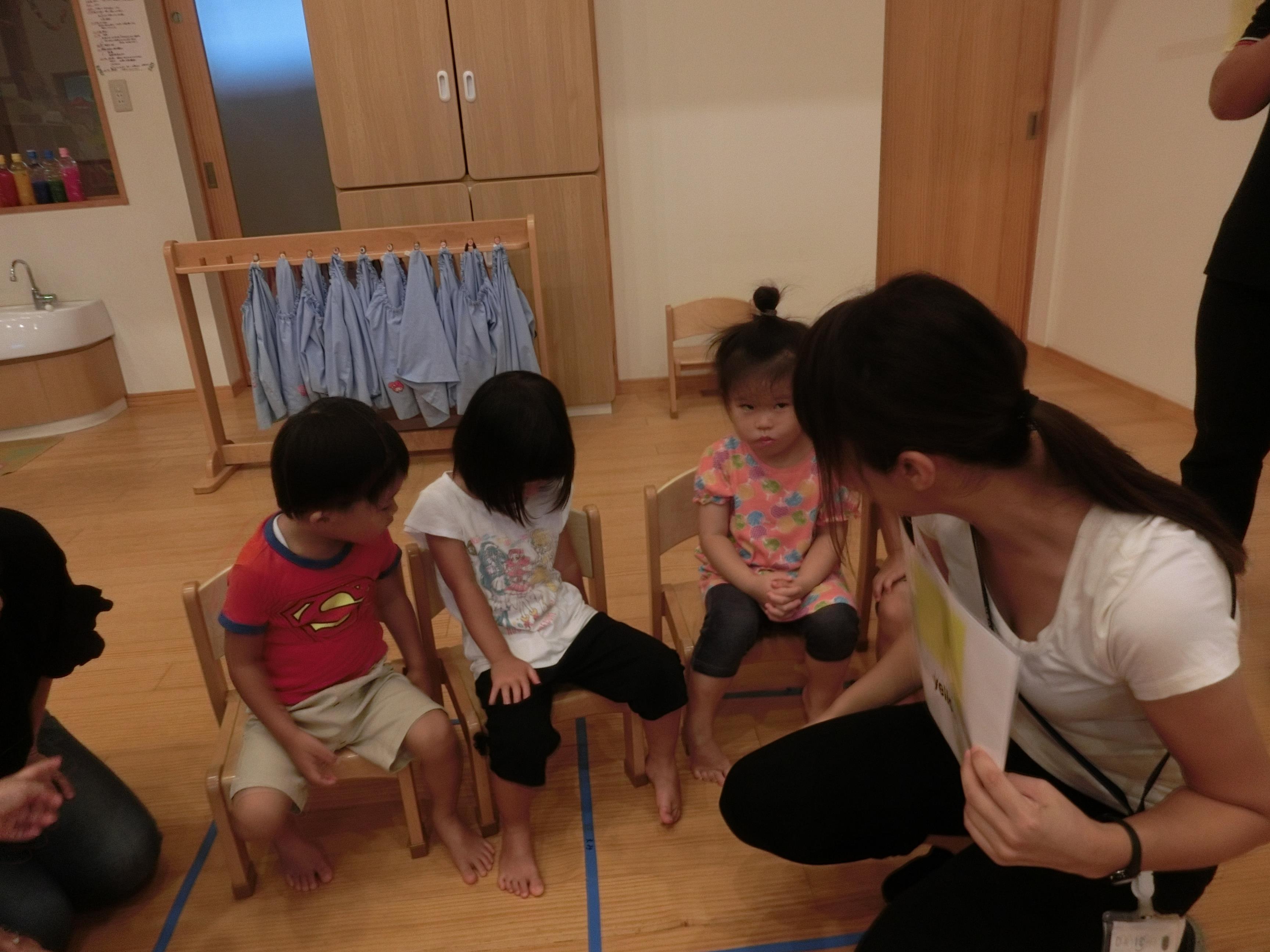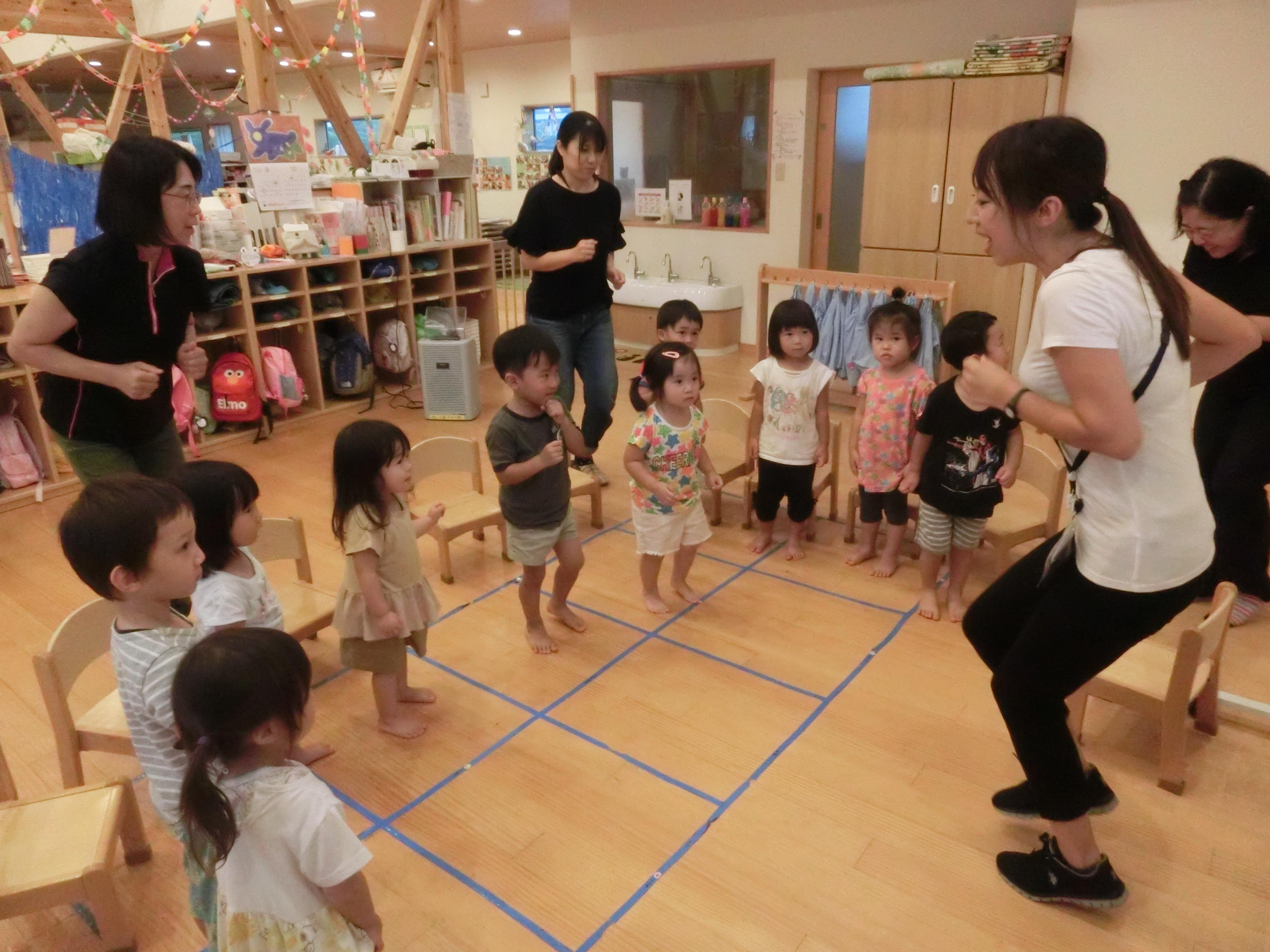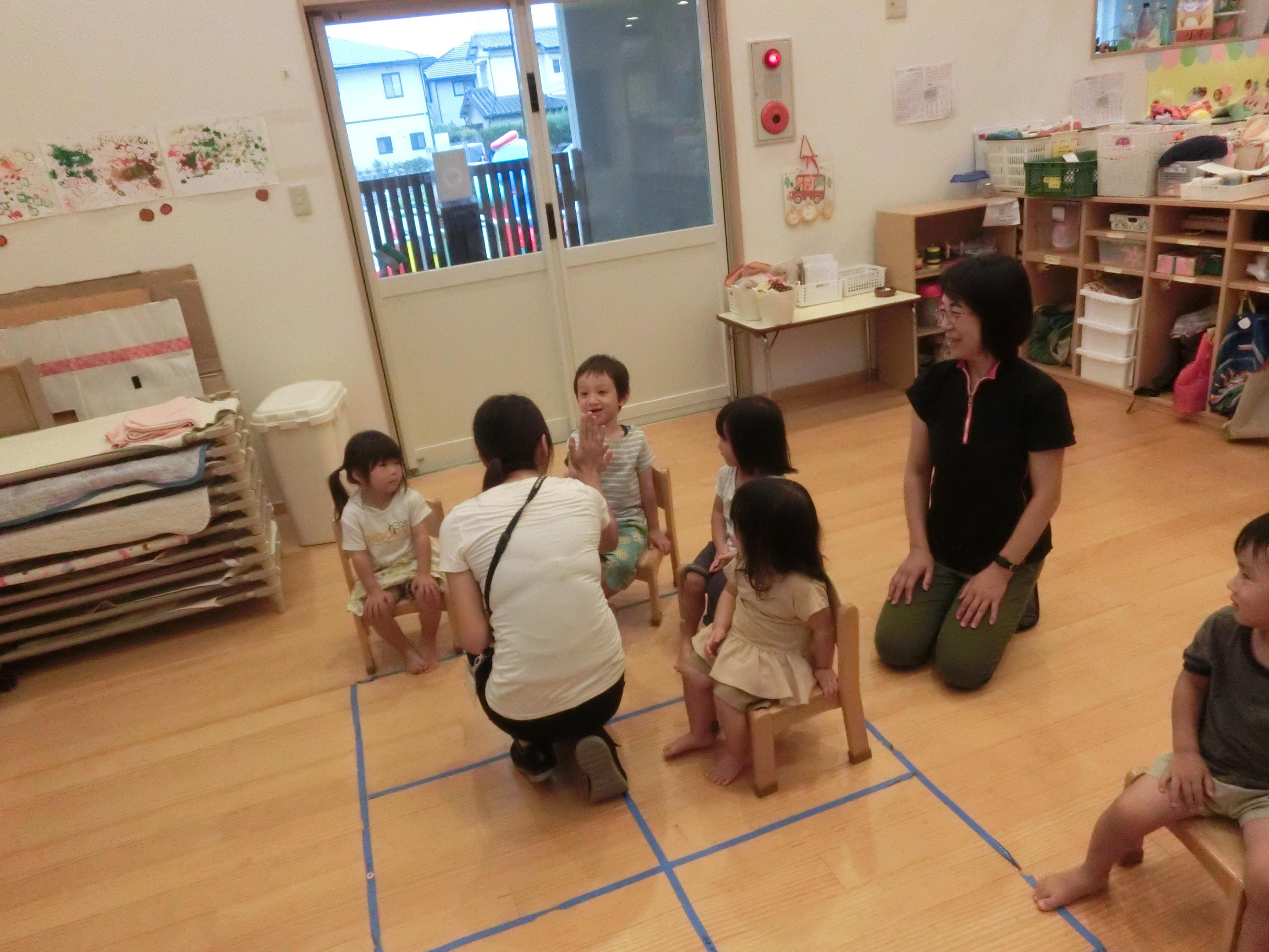 |  |  | 先生も真剣に取り組んでいますね。 あらあら!りすぐみさんの お友だちもそーっと覗いています。 | 音楽+動く+発音 聞きなれた音楽に振りをつけて思いっきり動いて楽しかったね。 | 「See you~」タッチは子どもたちのお気に入りです。「またきてね~ばいば~い」と次回を楽しみにしながらさよならをしました。 See you~と会話する姿が待ち遠しいですね。 |
