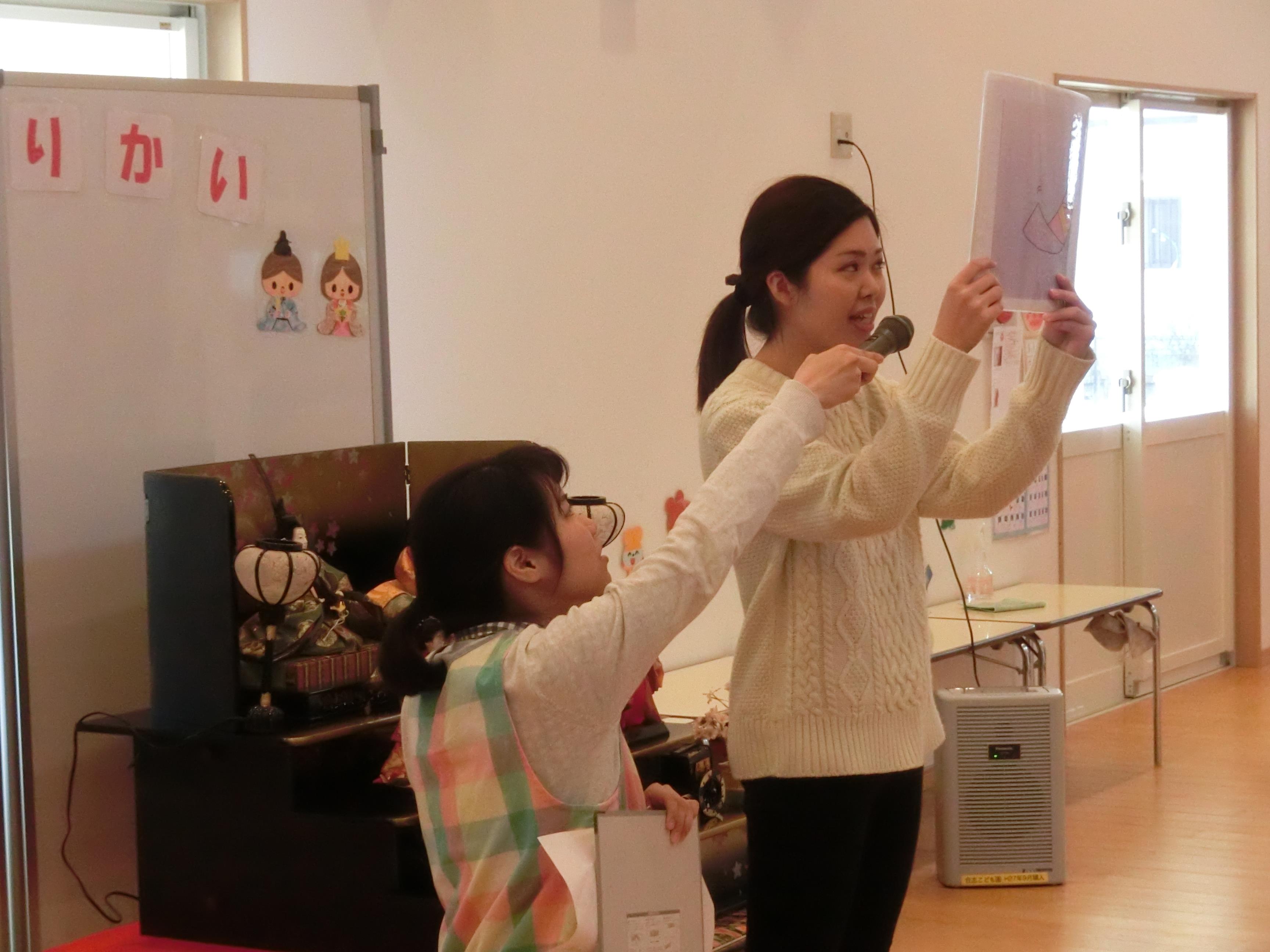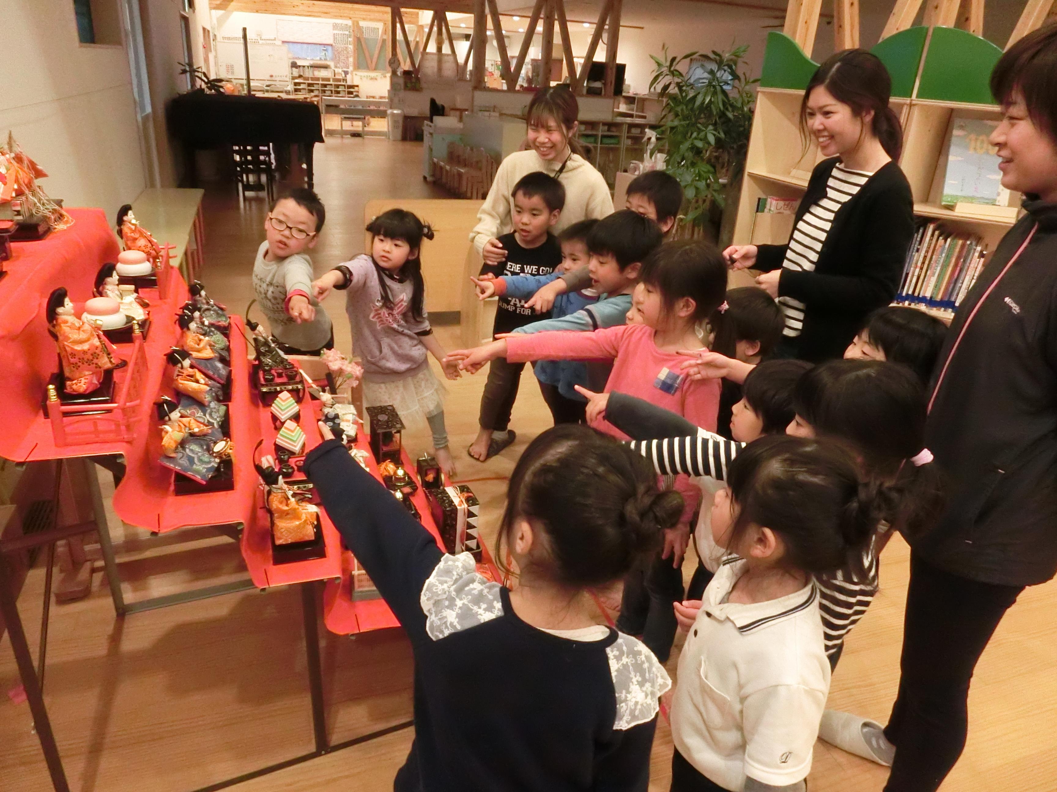 3月1日。年長組はこども園で経験する最後のひな祭り会に参加しました。 毎年ひなまつりを迎える時期は特に全職員で「子ども達の健やかな成長とこれからも誰にでも優しくできる人でいられますように」と願い過ごしています。 子ども達に「ひな祭りはどんなことをしているでしょう?」と聞くと「お雛様のお祝い」「綺麗な着物をきてること」等色々な返事が返っていきます。「実は・・・結婚式の様子なんだよ」と話すとより一層興味深く”由来”や”人形の紹介”を聞いてくれました。 会では由来の紙芝居をみたり、人形の説明を聞きました。各クラス制作した雛人形をみんなに紹介してくれると「かわいい」「上手だね」とお友だちの頑張りを認め合う姿が見られました。帰りには、保護者会で準備していただいた「ひなあられ」を大事そうに持ち帰っていた子ども達です。ご家庭でも、お子様の健やかな成長を願いお祝いをされた事でしょう。 おひなさま!また一年後お会いしましょう。  |  |  | | むかしは、人形を流して・・・先生手作りの紙芝居で由来を聞きました | こども園開園の時、方から譲っていただいたお雛様。今年も温かく見守ってくれます。 | 未満児さんもしっかりお話を聞くことが上手になっています。お雛様もきっと嬉しいはずです |