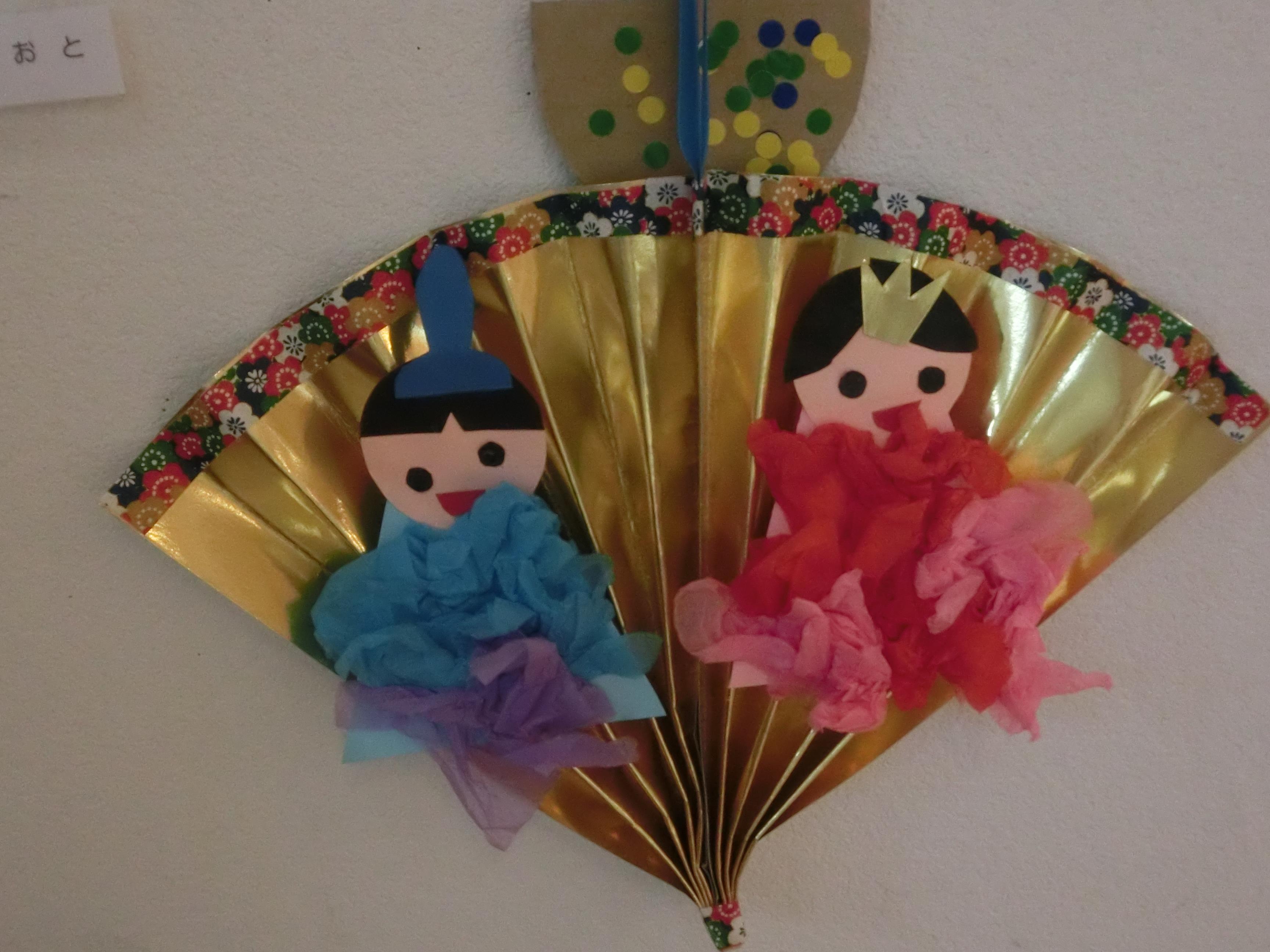 |  |  | | 以上児さんはお話を聞きながら、手具に興味津々でした。今の道具に照らし合わせイメージしている様子も伝わってきました。 | 0歳児。かわいいお顔つきの雛人形。世界でひとつのできばえに喜んでいました。 男の子はお内裏様になっていましたよ。 | 金の屏風に映る灯を~♪ 1歳児。屏風風の扇子に飾られたお雛様。ふわふわ花紙の着物が豪華ですね。ドレスのようです |
