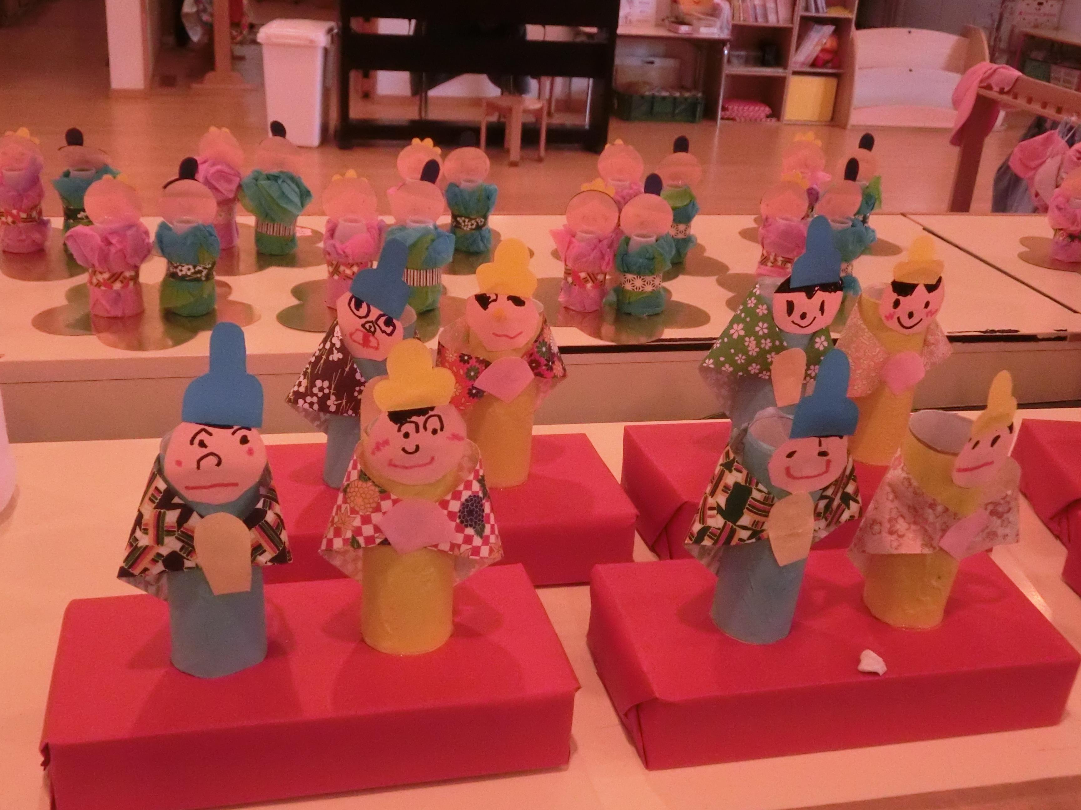 |  |  | | 2歳児。顔をどこに貼ったらいいかな?と構成を考えながら作っていました。上手に並んでいます。 | 3歳児。ヤクルトに花紙を巻きつけました。金のももの花に写るお雛様もなかなか風情があります。いろいろな表情のお雛様です | 4歳児。着物をふっくらとするところが難しい!といいながら作りました。着物の感じが出ています。 |