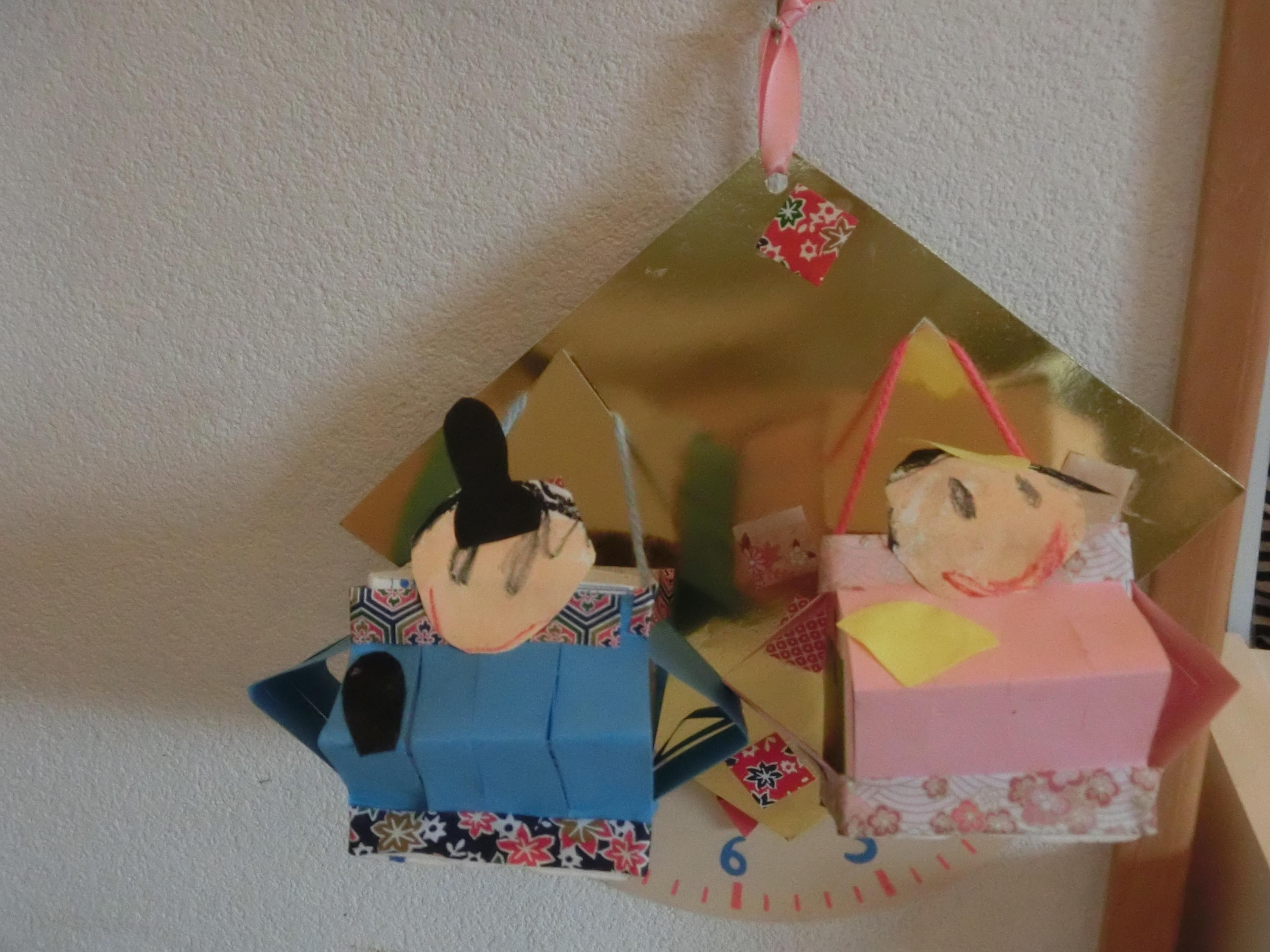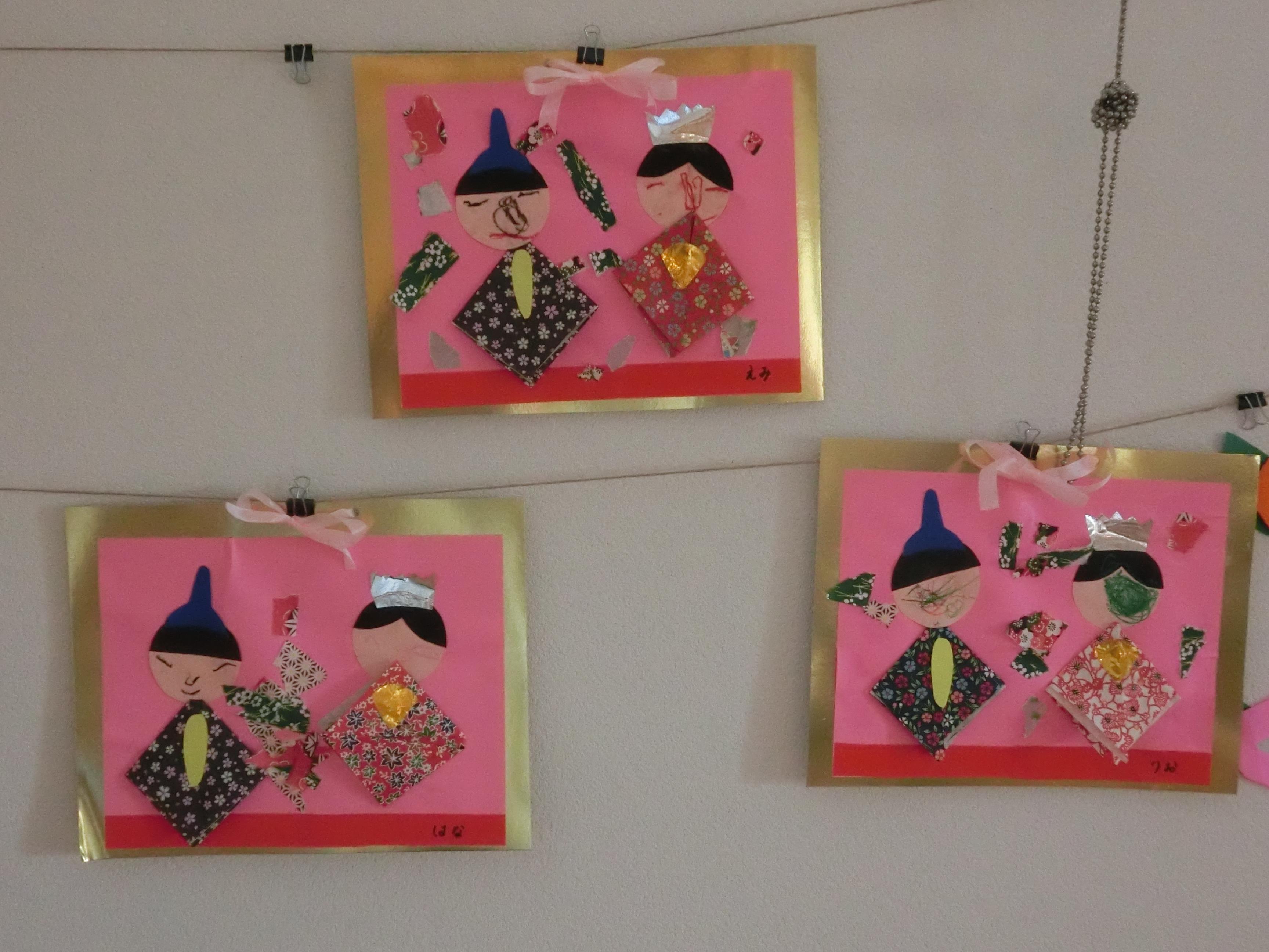 |  |  | | 5歳児。切り込みをいれて、ふくらみを持たせた着物です。結構難しかったようで苦戦していました。 | 姉妹園(第二幼稚園)の保護者様から、譲っていただいたお雛様。段飾りの立派な人形に子どもたちの目は釘付けでした。 | こども園に仲間入りした、お雛様たち。これからずっと子ども達の成長を見守ってください。 よろしくお願いします。 |