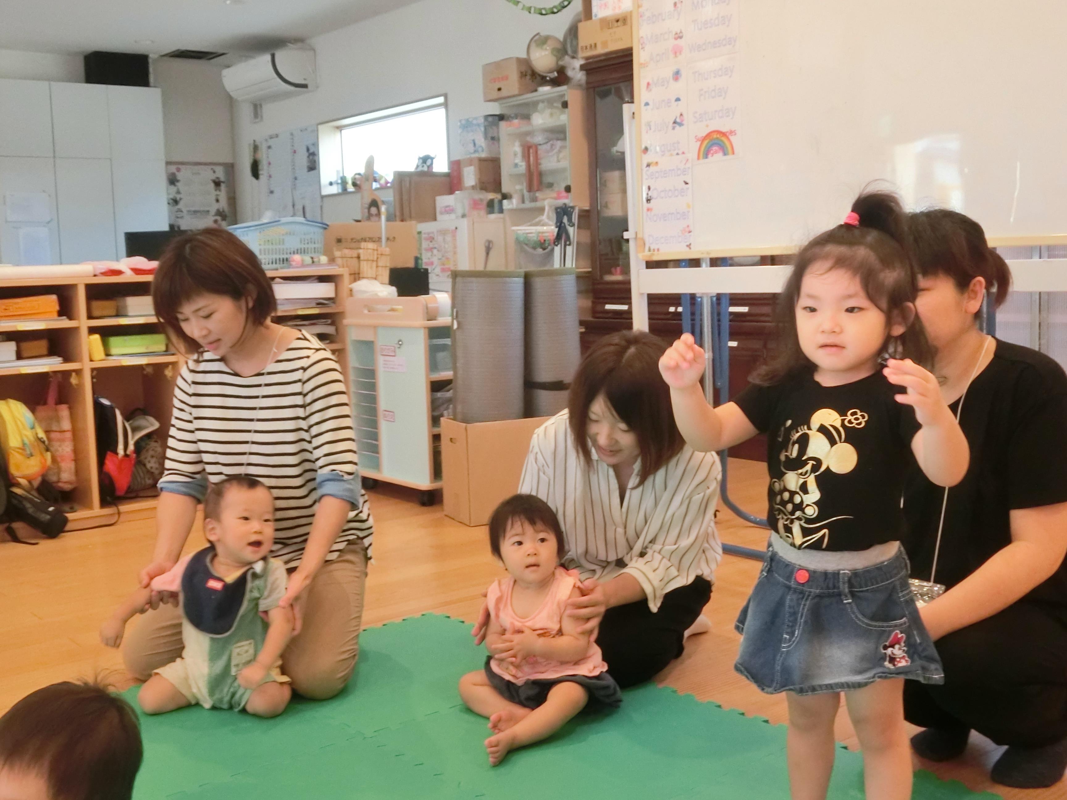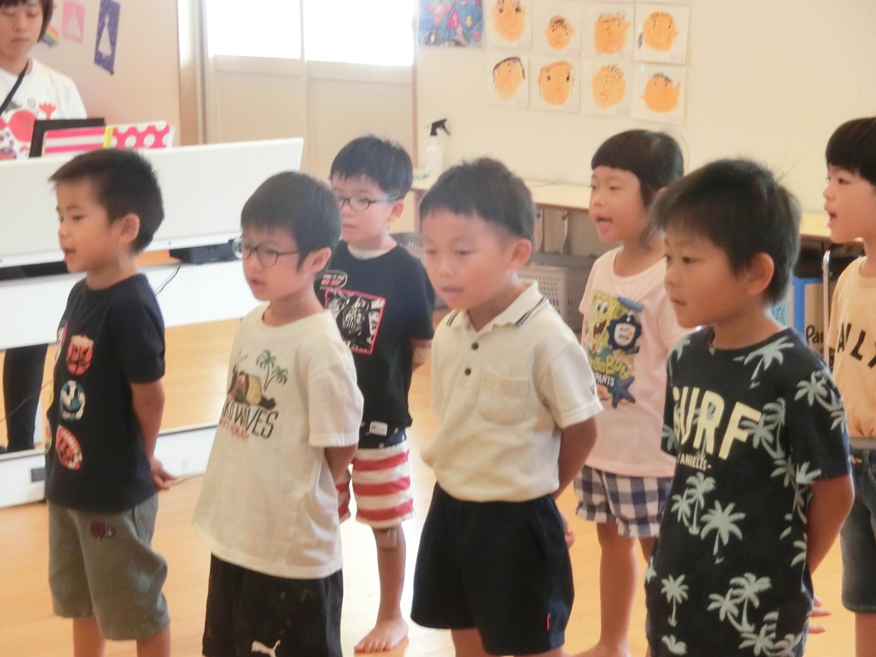 |  |  | 「せんせいとおともだち」をおねえちゃんと一緒にしたよ。 「たのし~い」 | 最後は、いつも頑張っているイングリッシュ活動から歌のプレゼントをしました。 ちょっぴりドキドキしたね | いちごくらぶのみんなも、しっかり聞いてくれて嬉しかったね |