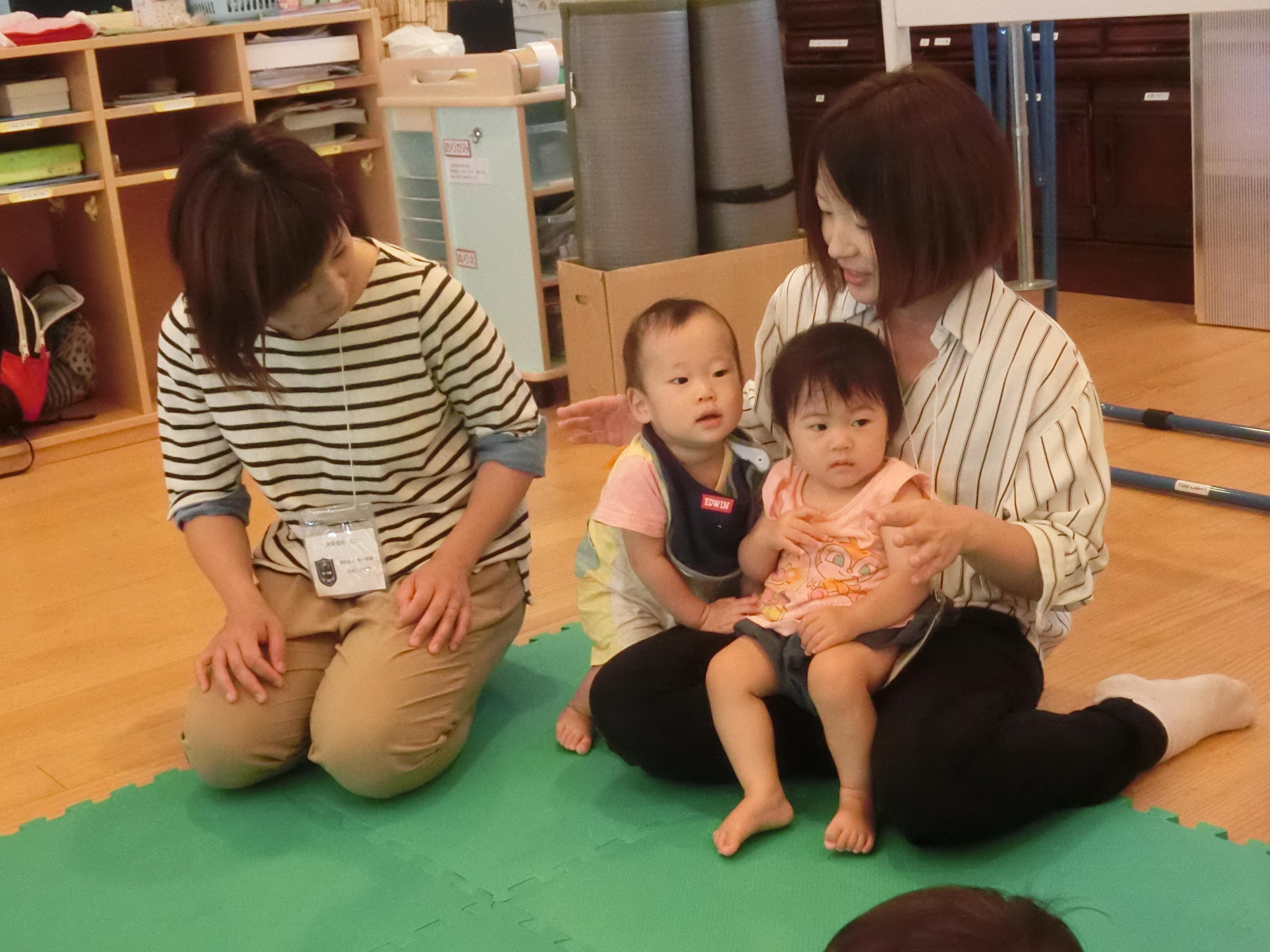| 1歳から3歳児のお友だちが参加してくれた、今回のいちごくらぶは、「年長さんと遊ぼう」という計画です。 緊張の面持ちの年長さんも小さなお友だちを目の前にして、思わず笑顔が溢れていました。 朝の集まりから始まり、動物体操や朝の歌を一緒に取り組み、「こども園の一員」を体験して頂きました。 いちごくらぶのお友だちも、おにいちゃん・おねえちゃんの真似をして楽しむ姿が見られました。 今日の活動は「運動会ごっこ」です。未満児さん競技の「もりのさんぽ」を一緒に体験しました。そっと声を掛けたり、やさしく手を添える姿には「思いやり」の心の育ちも感じられ、楽しい一時を過ごしました。 「また、あそぼうね」とさようならを惜しみながら、くらぶを終了しました。年長さんこれからも、優しい心をずっと持ち続けてくださいね。  |  |  | | 3歳児さんは、年長さんに合わせて体も使って、朝の歌を歌っていました。 | お友だちのママも、すっかり仲良しです。 | 年長さんのおなまえよびをみて、上手にお返事が出来ました。 |