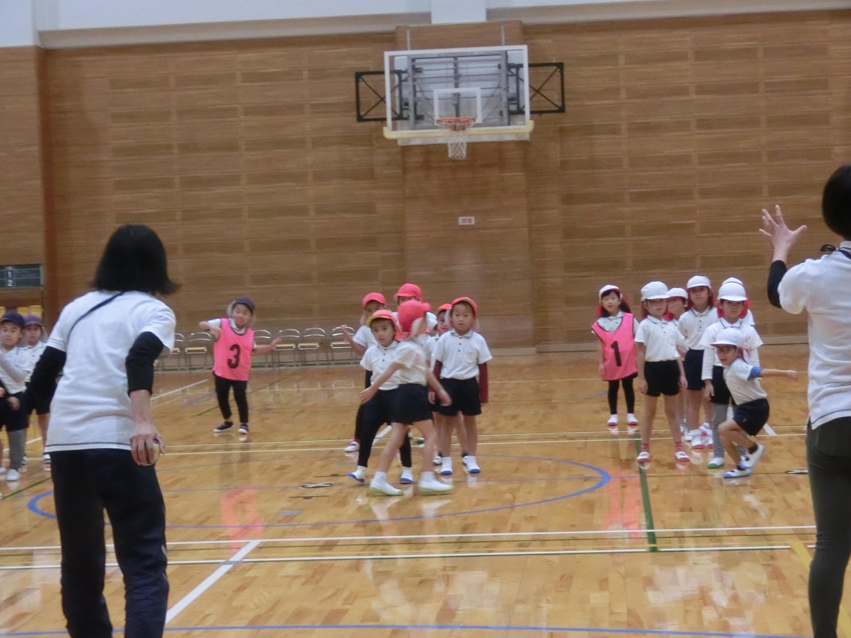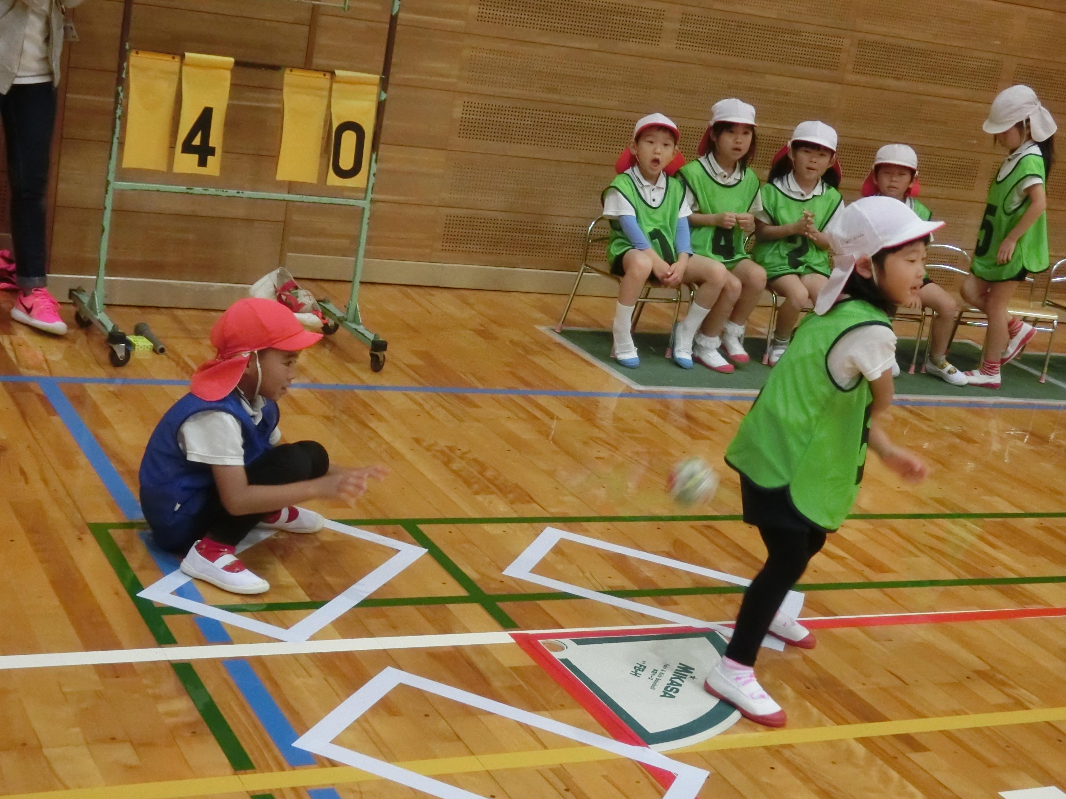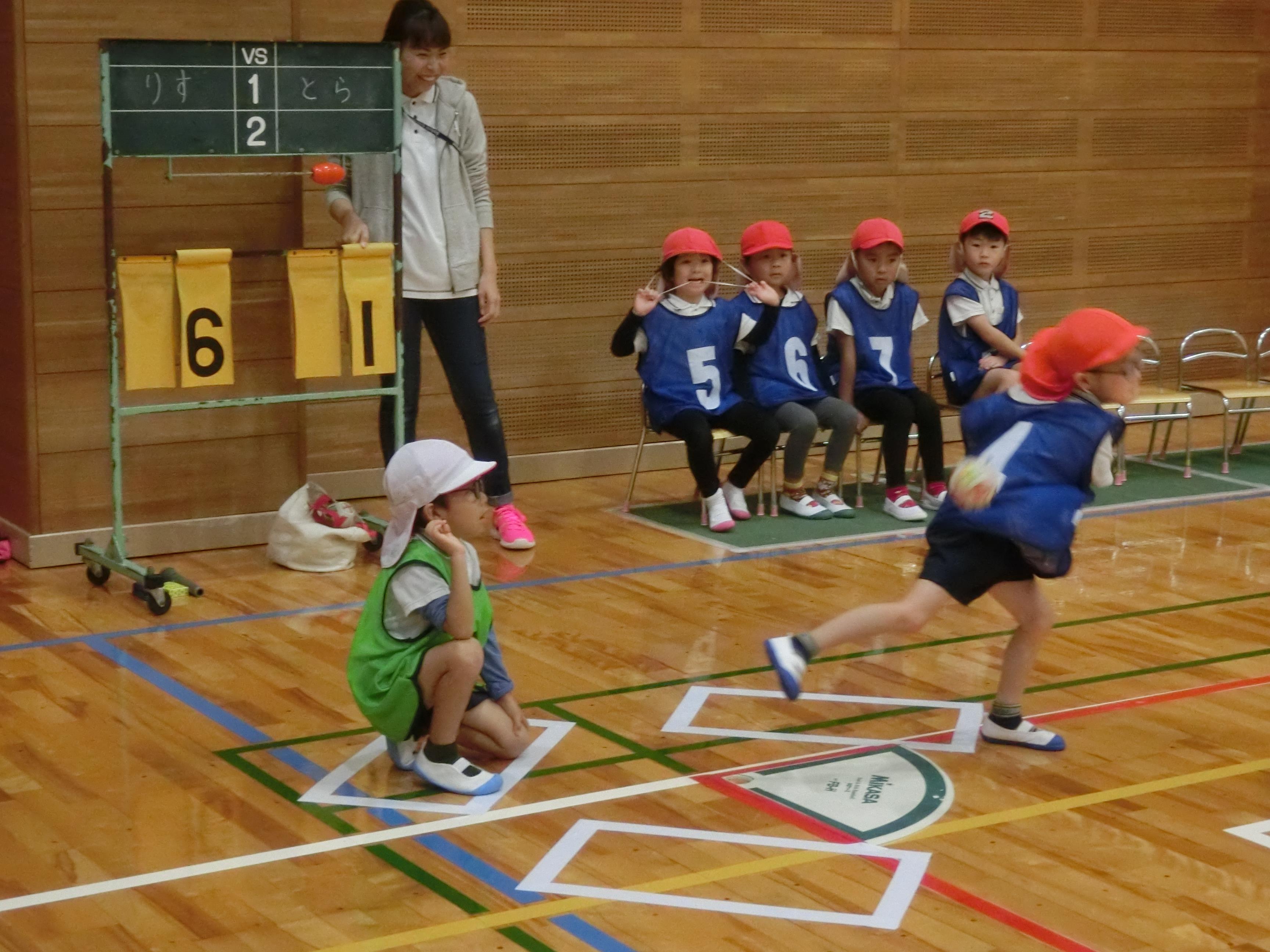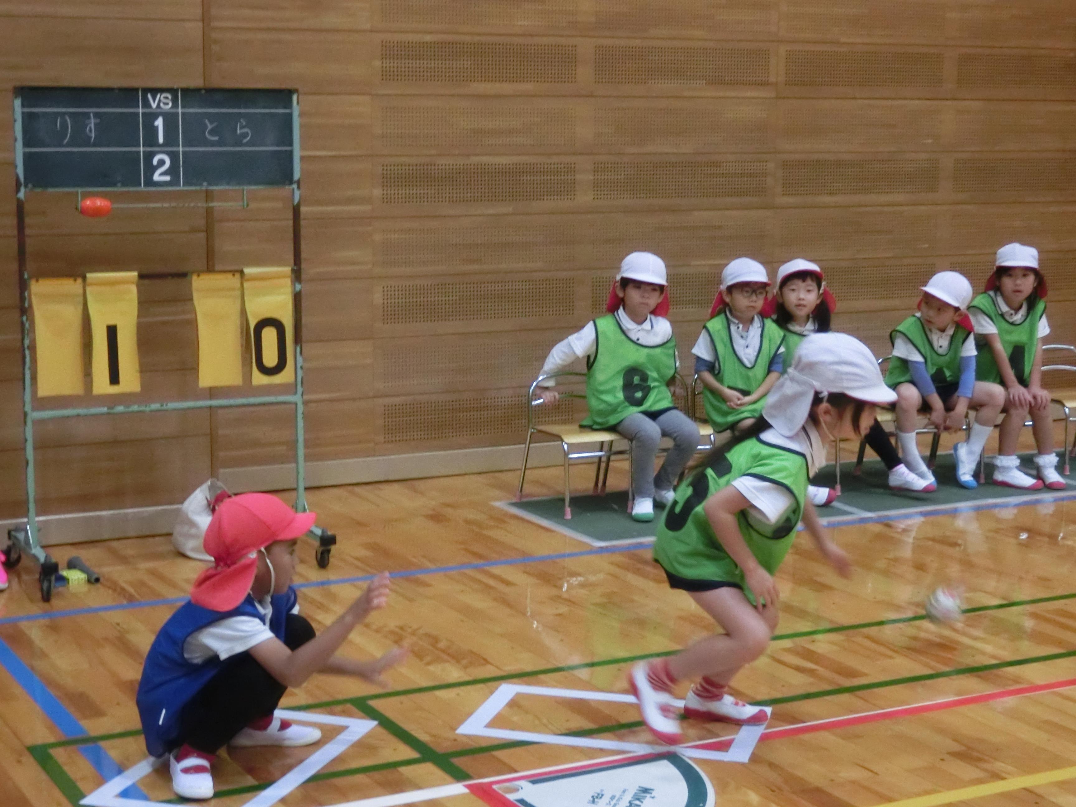体育活動で「投げる」「走る」「とる」「協力する」を目的とし、ヒットボールという競技にチャレンジしました。最初は、キャッチボールも色々な方向へ投げてしまい、難しかったのですが、「どのように投げ合うと相手が取れるか」「力加減は必要なのか」を経験を重ねる中で、子ども達と共に考えて取り組んできました。体育活動の時も、石橋先生やオデイン先生からヒントをもらって方法を見つけ試してみることで、要領やタイミング・声かけ等自分達で見つけて練習を重ねてきました。 いよいよ、大会当日!幼稚園バスで、ヴィーブルサブアリーナに杉並台保育園のお友達と一緒に集合しました。ベースの位置、開・閉会式やウオーミングアップの場所を確認しました。いつもと違うところでの活動時には、普段どおりの力が発揮できるように確認するようにしています。試合を進める中で、確認する姿も見られました。とっさの状況判断する力は、これから進学し、毎日の通学時にとても大切な力となります。自分で行動する中で、どっちかな?と考え、答えを導き行動する事は命を守ることにもつながります。 これからも、色々な活動・経験を通して、「判断する力」を培っていけるよう、関わってまいります。試合の結果に、一喜一憂しましたが、仲間と力を合わせる体験が出来、子どもたちも満足そうな笑顔を見せてくれていました。応援ありがとうございました。  |  |  | | ホームベースを踏むと、1点入るんだよ | ベースラン。 目標に向かって走り、折り返すことで、調整力も育ちます | ベースをしっかりみて、足タッチするといいんだよ。 |