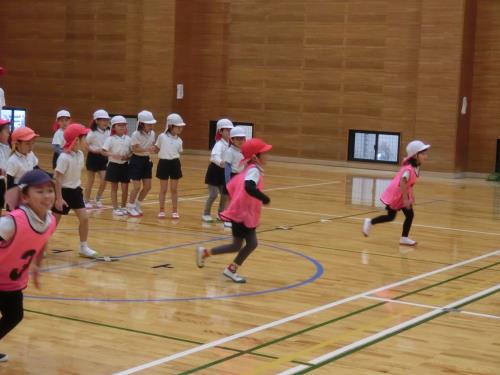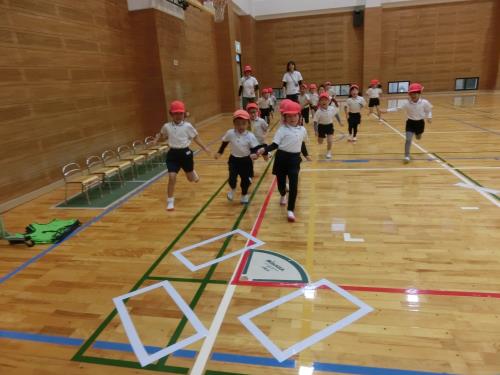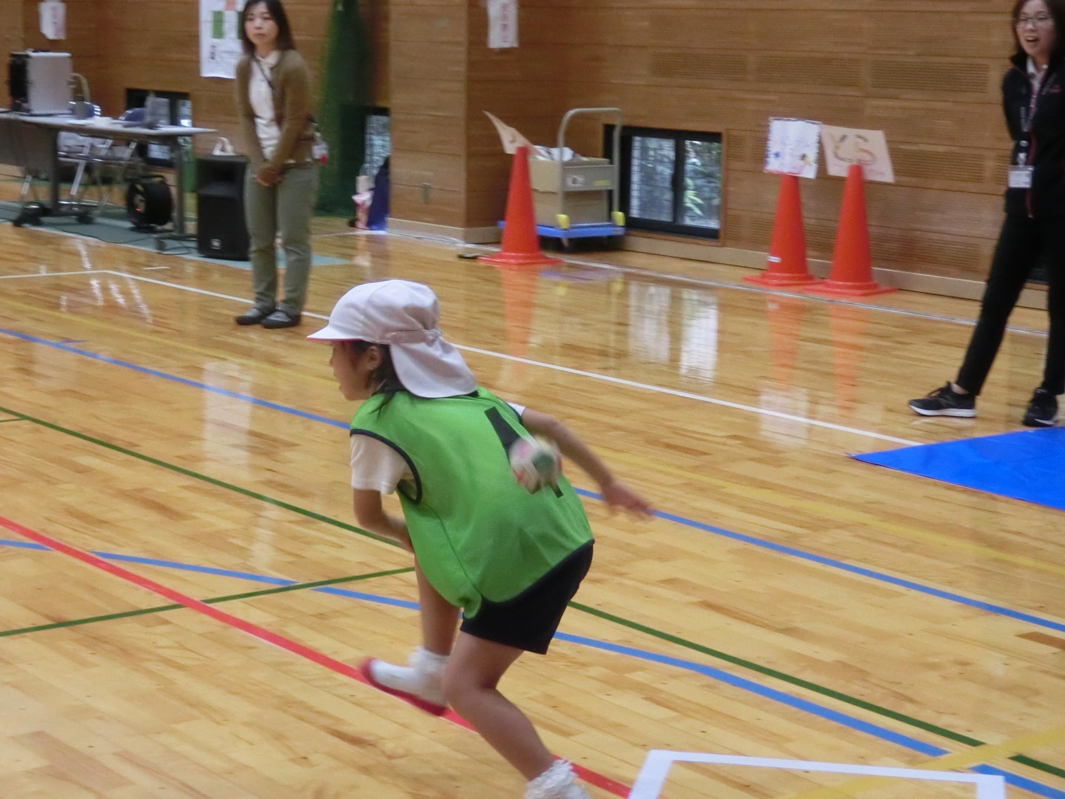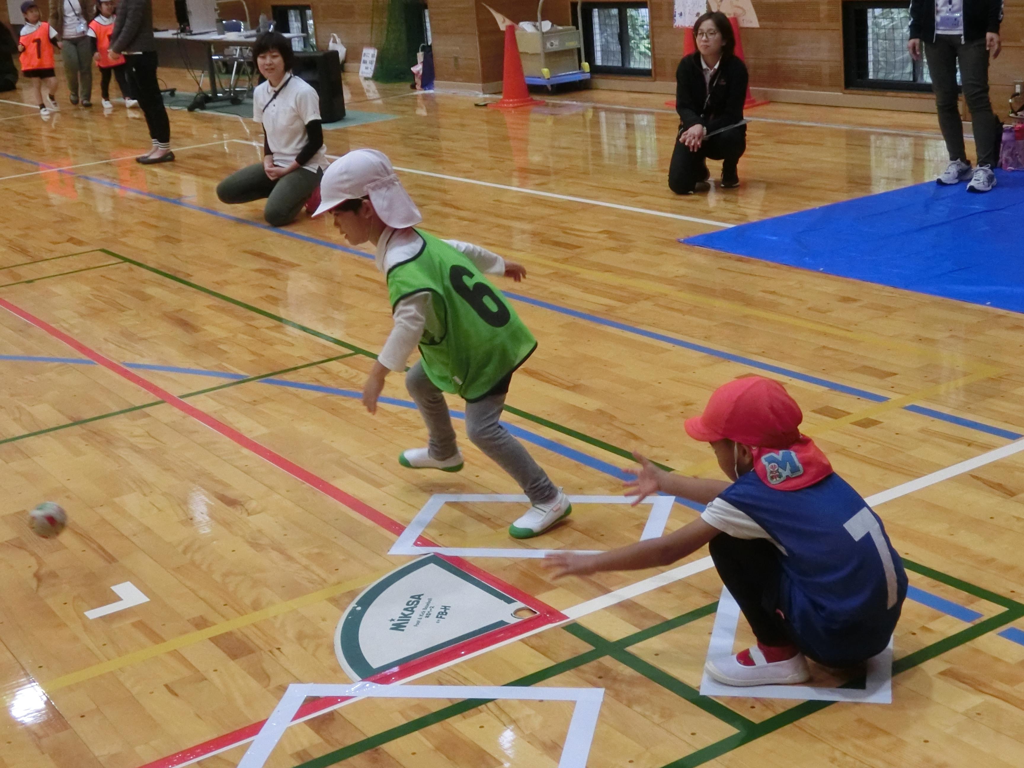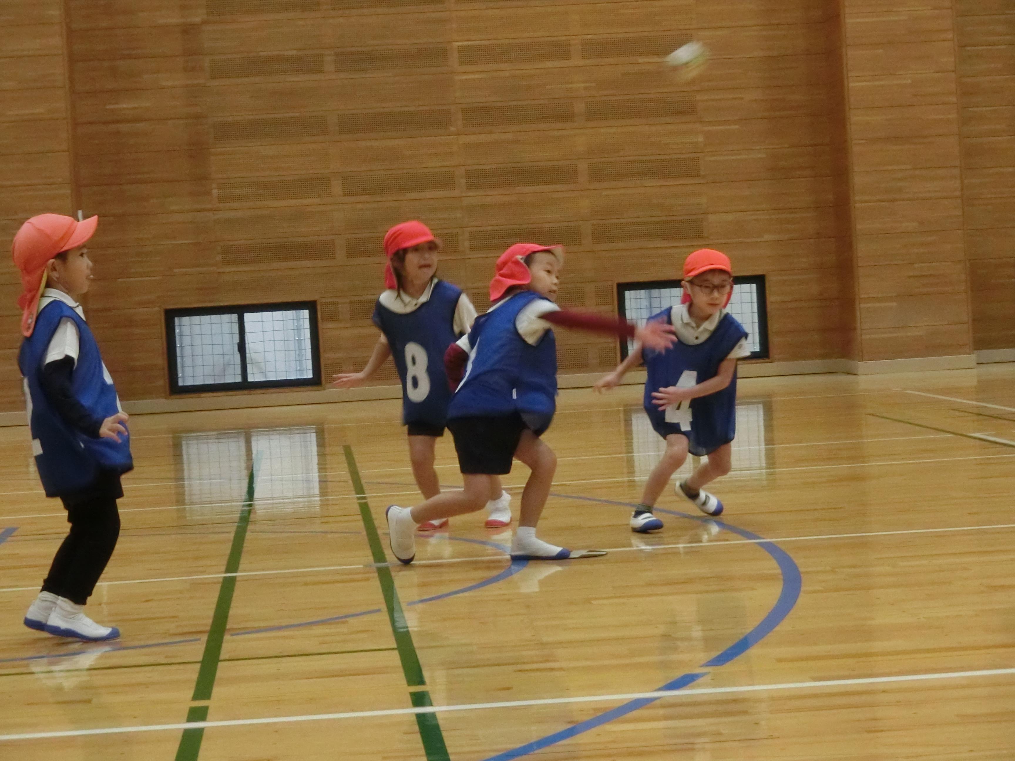 体育活動で「投げる」「走る」「とる」「協力する」を目的とし、ヒットボールという競技にチャレンジしました。最初は、キャッチボールも色々な方向へ投げてしまい、難しかったのですが、「どのように投げ合うと相手が取れるか」「力加減は必要なのか」を経験を重ねる中で、子ども達と共に考えて取り組んできました。体育活動の時も、石橋先生やオデイン先生からヒントをもらって方法を見つけ試してみることで、要領やタイミング・声かけ等自分達で見つけて練習を重ねてきました。 いよいよ、大会当日!幼稚園バスで、ヴィーブルサブアリーナに杉並台保育園のお友達と一緒に集合しました。ベースの位置、開・閉会式やウオーミングアップの場所を確認しました。いつもと違うところでの活動時には、普段どおりの力が発揮できるように確認するようにしています。試合を進める中で、確認する姿も見られました。とっさの状況判断する力は、これから進学し、毎日の通学時にとても大切な力となります。自分で行動する中で、どっちかな?と考え、答えを導き行動する事は命を守ることにもつながります。 これからも、色々な活動・経験を通して、「判断する力」を培っていけるよう、関わってまいります。試合の結果に、一喜一憂しましたが、仲間と力を合わせる体験が出来、子どもたちも満足そうな笑顔を見せてくれていました。応援ありがとうございました。  |  |  | | ホームベースを踏むと、1点入るんだよ | ベースラン。 目標に向かって走り、折り返すことで、調整力も育ちます | ベースをしっかりみて、足タッチするといいんだよ。 |