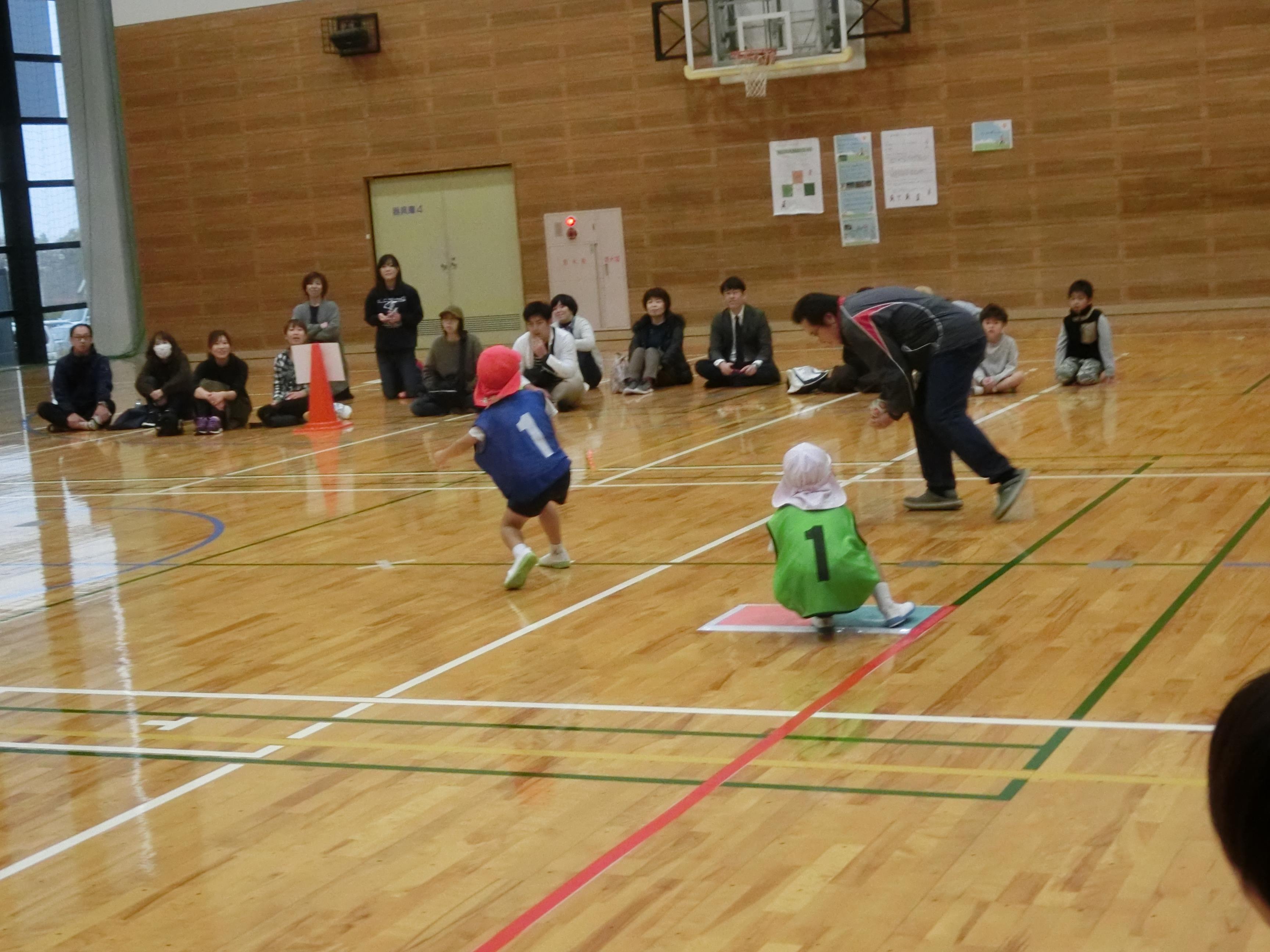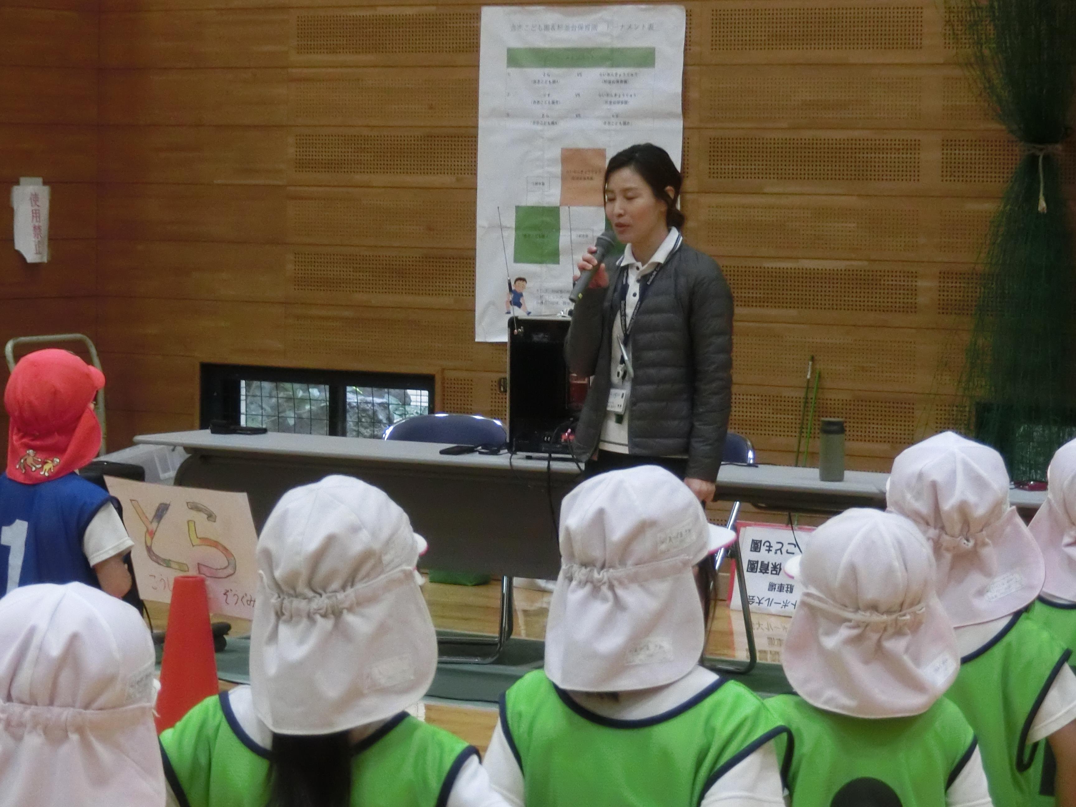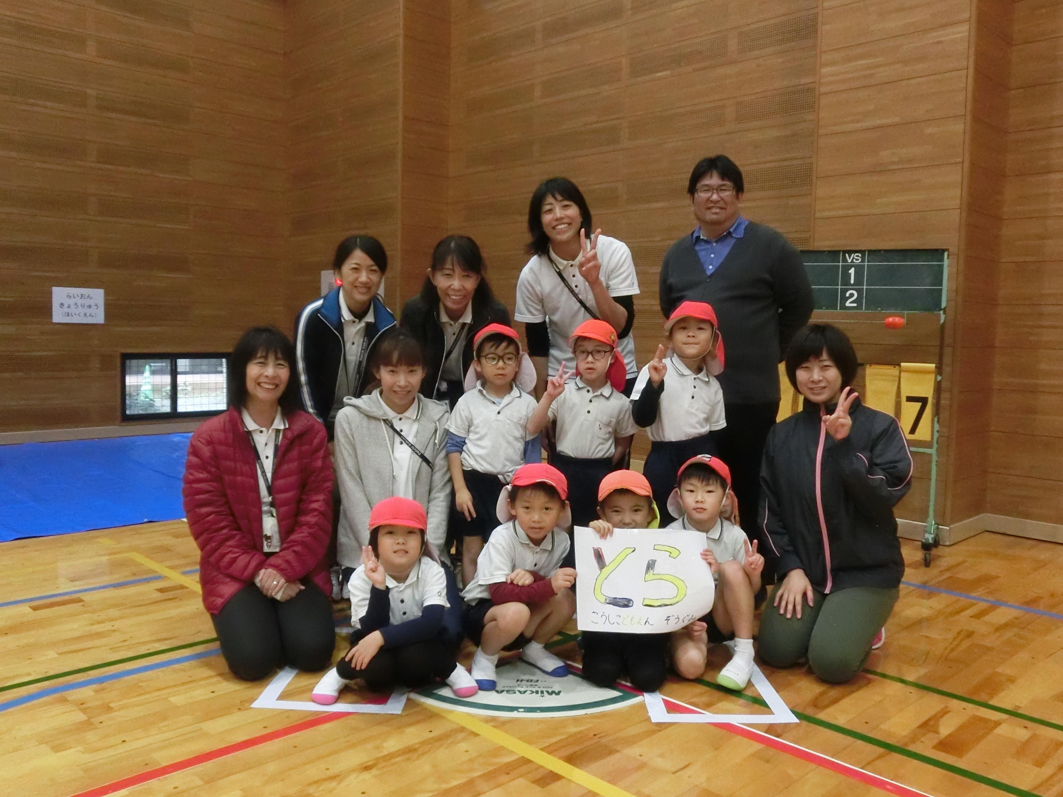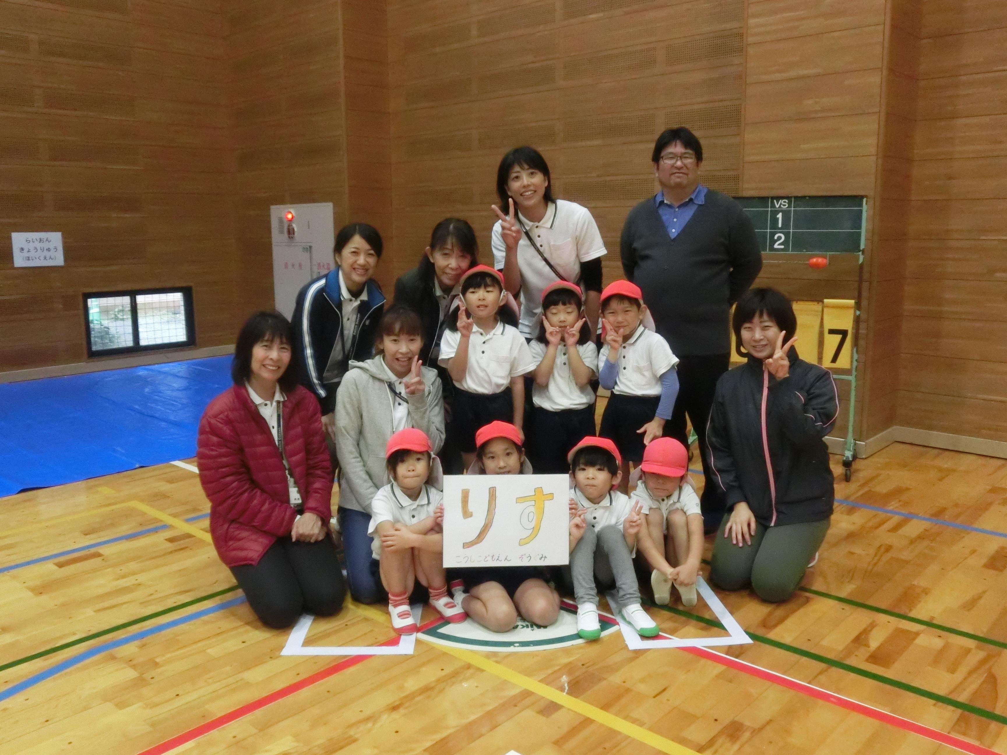 |  |  | | 閉会式。保育園の園長先生に「チームで力を合わせてがんばっていることが伝わってきました」と話していただきました。どのチームが勝っても楽しい大会でした。 | 沢山の先生も参加していただきました。 とらチームは練習の時から、勝つことが多かったのですが、一試合一試合を全力で戦うメンバーでした。 | りすチームの目標は「必ず1つ勝つ」でしたね。 勝つためには力を合わせたり、声を出し合ったり、一人ひとりが役割を考え、頑張るメンバーでした。 |