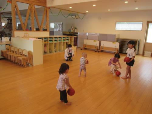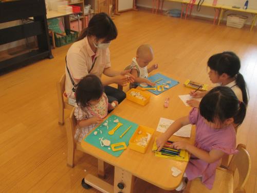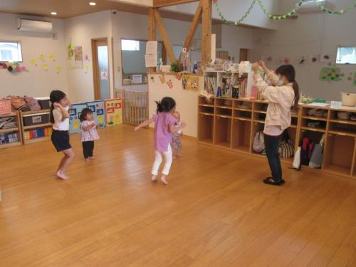 5月最後の土曜日は、「未満児参加型保育参観」の予定でした。しかし、新型コロナ感染拡大防止対応中ということも有り、参観は延期となりました。土曜保育の預かりも家庭保育協力も有り4名の利用でした。また、感染拡大防止のため、今年度の大型プールの利用は中止となりこれからやってくる夏場の暑さ対策を職員一同取り組むこととなりました。 遊具が太陽熱で暑くならず遊べるように、木陰テントをたてました。一年ぶりの設置に四苦八苦しながら力を合わせ張り終えると、風になびくテントに涼しさをもらうことが出来ました。フェンス横には芝を植え付け、緑化にも汗を流しました。 全ては、子ども達がより快適に園生活を楽しめるようにと願い取り組みました。マスクの着用等による熱中症にも気をつけていきます。  |  |  | 体操もひろーく広がって! お姉ちゃんたちのお手本に大喜びの1歳児さんです | 粘土やぬりえ。 異年齢児活動ならではの様子です。 | ボール遊びにも挑戦。 転がるだけでも笑い声が響き渡っていました。 |
