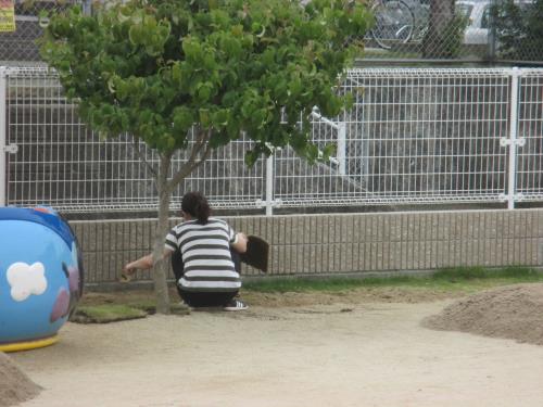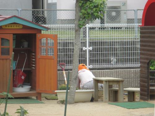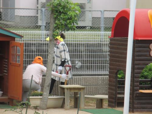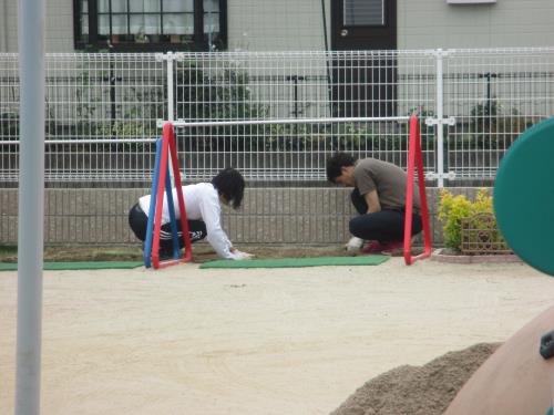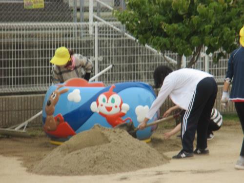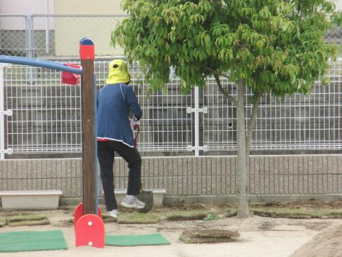 |  |  | | 先生たちが植えた、芝生の隅っこにはきっと沢山のダンゴムシが遊びに来てくれることでしょう | 学童の先生も力を貸してくれました。 園長先生も頑張っています。 | みんなが大好きな「アンパンマンゴーラウンド」周りの砂が減っているので、スコップやトンボ(砂均し)を使って地ならしをしました。 |