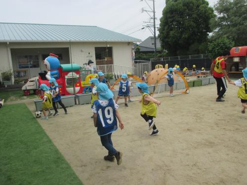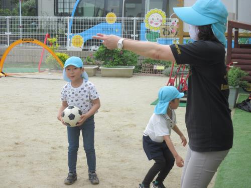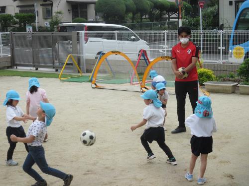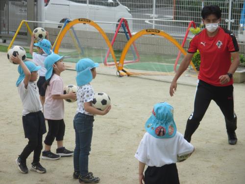 今年度も「SKT合同ロアッソサッカー教室」に取り組んでいきます。 月1回の教室ですが、例年園庭を所狭しと駆け回ってはサッカーに触れ「体を動かすことを楽しむ」「ルールある競技を知り、友だちと協力し合うことの楽しさを味わう」事をねらいに実施しています。例年は杉並台保育園のお友だちと共に、杉並台幼稚園の園庭で行っていますが、コロナ感染拡大防止対策とし、今月は別々に行いました。今後状況によっては、SKT合同実施も計画されています。 もっと広い園庭で、もっと沢山の仲間とサッカーが出来ることを願いながら、第1回目の教室に参加しました。 様々なことに挑戦しながら、自分の得意なことを見つけていくことができるきっかけとなって欲しいと願っています。 休日、親子でボールを追いかけるのも、きっと子ども達の心にいい思い出ととして残ると思います。  |  |  | 上から下に強く落として (バウンド)キャッチ! なかなか自分のところに落ちてこないから難しかったよ。 | 手をのばして、下にするのはどうかな?先生ともやり方を考えてみました。 | ボールと仲良しになるため、最初は手で転がしていくよ。ボールと散歩。 いろいろな様子が見られますね。 |