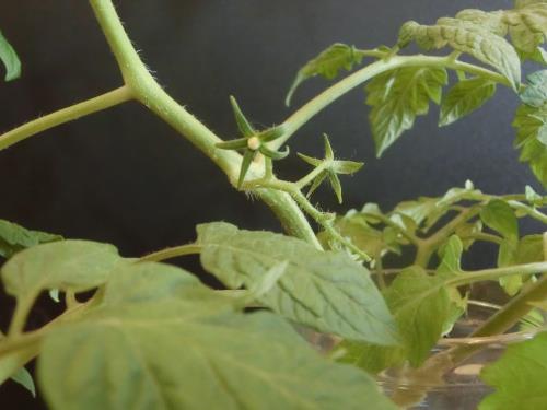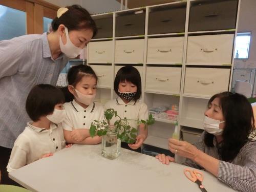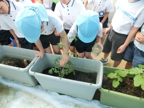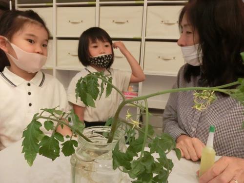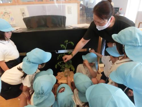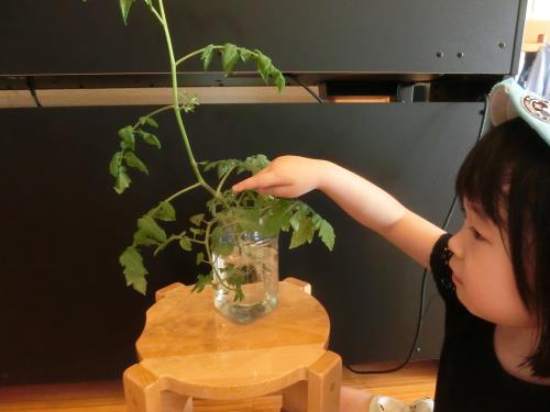 【折れたトマト!次は赤い実だね】 みんなで大切にお世話をしている、トマトは順調に根っこを伸ばし花も咲きました。さあ次は実がぐんぐん大きくなっていく番です。 しかし、写真に実が見えますか。花芯にちいさな実のあかちゃんは見られますが、一向に育っている様子が見られません。どうして大きくならないのか、クラスで話し合いました。プランター栽培との違いから想像したり、図鑑を開いてみたり。さあ!何が必要なのか子ども達は見つけたのでしょうか。  |  |  | 【太陽が必要】 プランターとの違いは、外と室内で育てている事。という意見がでて、その日から靴箱の上に置いて様子を見ることにしました。 | 【根っこが茶色に!】 外におくことで、苗の環境も不安定になります。風に茎がなびいて、根っこが水に浸からず、枯れる寸前でした。 根っこも茶色になってしまいました。 | 【プランターのトマトは直ぐ大きくなる】 「昨日よりも、また少し膨らんでた。」毎日観察しているので、ちいさな変化にも気付く子どもたちです。 |