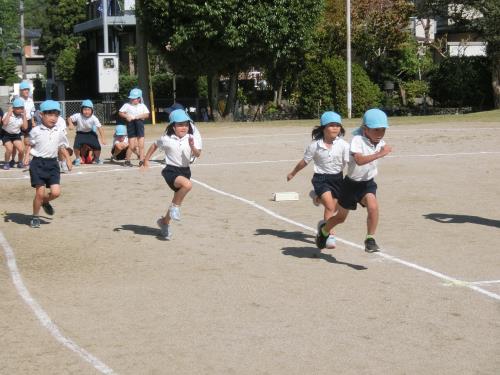 | チーム対抗リレー。 毎回ドキドキします。バトンをしっかり渡したり、もらったら素早くスタート!各チーム勝つためにはの作戦も立てていたようです。 | 走り終えたら、どこで応援する。自分たちで移動や順番等考えて取り組みます。 | さあ! アンカーにバトンが渡りました。みんなの気持ちをゴールまでつないで、つないで!! |
