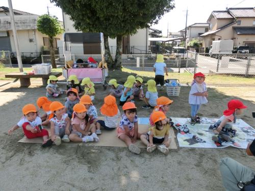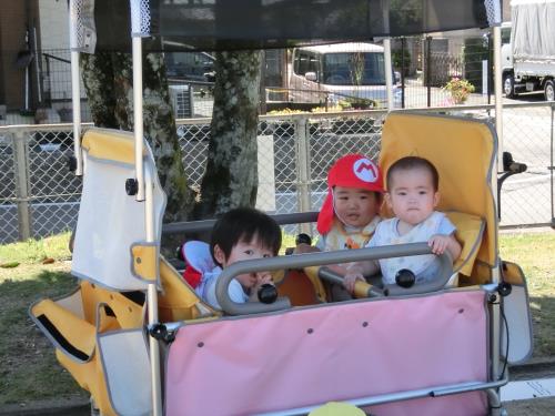| 三歳児は直線を走ります。 みんな一等賞を目指して よーいどん!! | 未満児さん。今日はお客さんです。木陰でドングリを手にしながらもしっかり応援してくれました。 | お散歩カーの上からも・・・ 「がんばれ~」 |