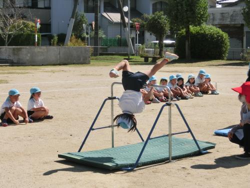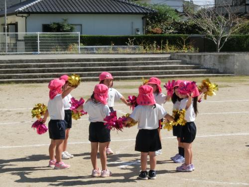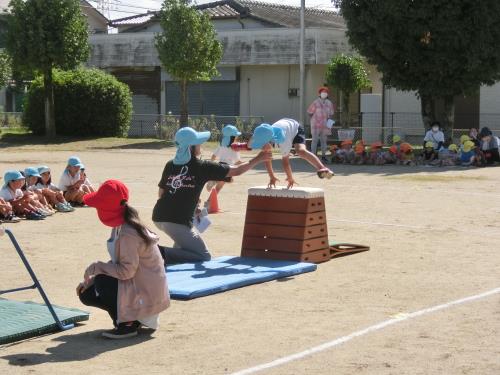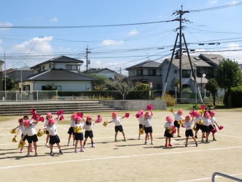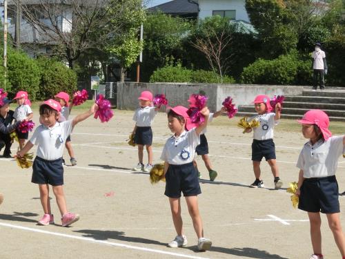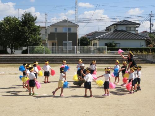 | | 自分たちで、中心のポイントを見ながら円を作ります。どうやったらきれいな丸になるか!自分たちで意見を出し合い取り組みました。 | 最後のポーズ! ばっちり決まって、得意げな笑顔があふれていました。 | キラキラポンポンと楽しく表現するお兄さん、お姉さんに大きな拍手をくれた未満児さん。すぐ大きくなって今度はみんなの番だね |