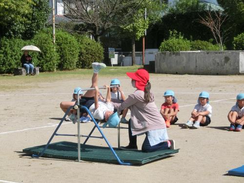 | チャレンジ!! 器具をみんなで使うので、入場前に手指消毒を行います。 | 落ちないように先生が跳び箱の横で腕をもってくれるので、安心してチャレンジすることが出来ます。 | 腕にしっかり力をいれて・・・あきらめずに挑戦します。あと少しの時は背中を少しだけ支えてもらいます。 |