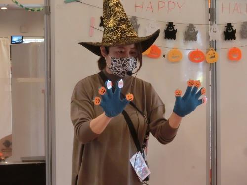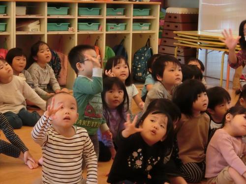 | | パンプキンがついた手袋。一緒に英語でかぞえましょう | 先生の手をまねて、体でも数を表現しています | 先生も子どもたちの発音を引き出したり確認するように、顔を覗き込んで一緒に言っています |