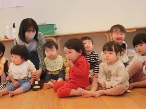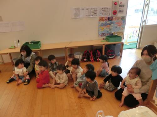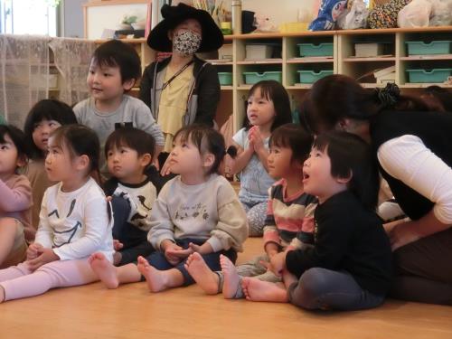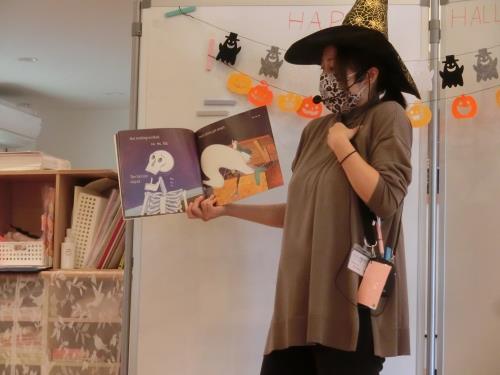 | | 0,1歳児さんも、楽しい英語を聞きつけて集まってきました。 | お化けのお話に思わず体を縮めて、、、英語できいて理解できるってすごいですね | 先生のなり切った読み聞かせ、、、ひきつけられます。 |