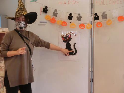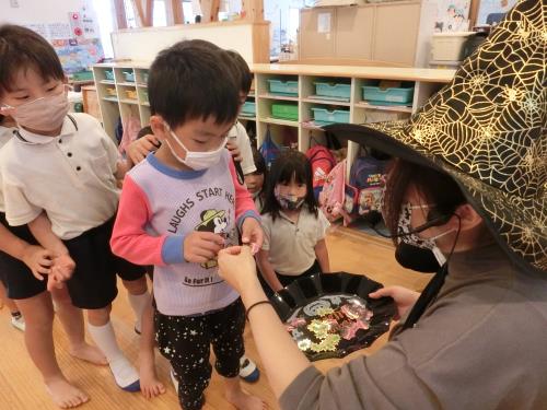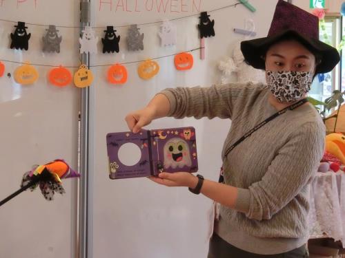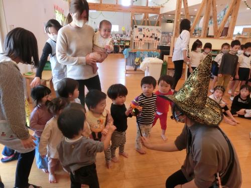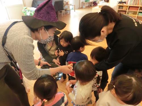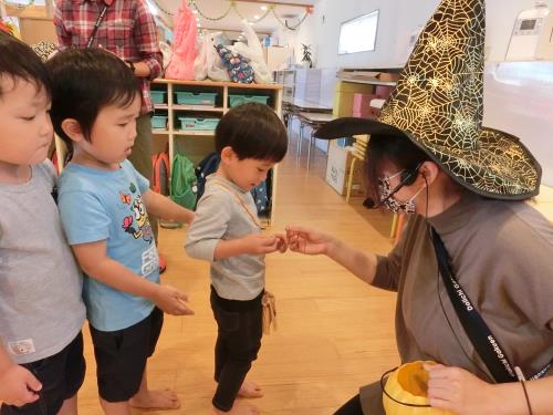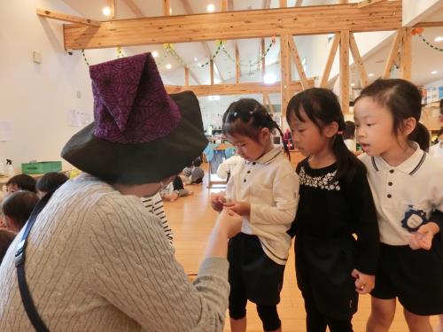 | トリックオアトリート! 年長さんはチャレンジして言ってみました。 | ドキドキしたけど、英語で伝わってうれしかったよ | 飛び入り参加の0,1歳児さん。魔女のステッキにタッチしてSeeYouと会話してみました。 |