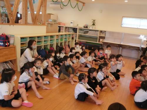 | | 年少さんは英語を聞いて反応したりすることが少しづつできるようになってきました。 | 英語の絵本は短いフレーズの繰り返しの物だったり、、、 ワクワクしながら聞きます。 | トリックオアトリート 伝えるのは難しいから今日は特別「ありがとう」を英語で伝えて可愛いプレゼントをいただきました。 |