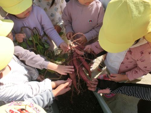 プランターでもこんなにたくさん大きく実ったり!! 「わ~出てきた。出てきた」とあちこちから歓声が沸き起こっていました。しばらく登園入り口に飾っておきましたが、ご覧になりましたでしょうか?少し熟成させて、みんなで食べたいと思います。お芋ほりのお芋と味がちがうかなあ・・・