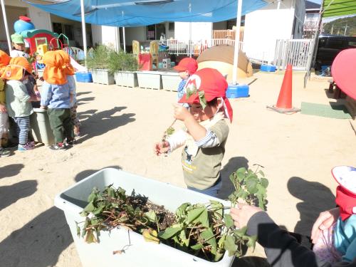園庭のプランターでお芋を育てました。畑の様子を見に行くことが出来ないため、芋ってどうやってそだつのかな?を身近に観察してきました。 茎をうえたのに、どんどん伸びていくね。おいも育っているかな?水やりや、つるの様子を見ながらお世話してきました。お芋ほりに行くことが出来ない未満児さんがお芋ほりです。