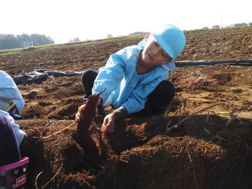 | | 村田さんも手伝ってくれたんだ!とっても上手なんだよ | 見て~すごいでしょう。私のお芋!! | 頑張って掘ったよ。手で掘るのはちょっとたいへんだった |