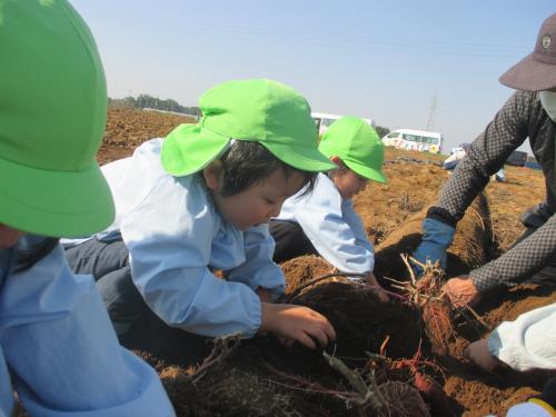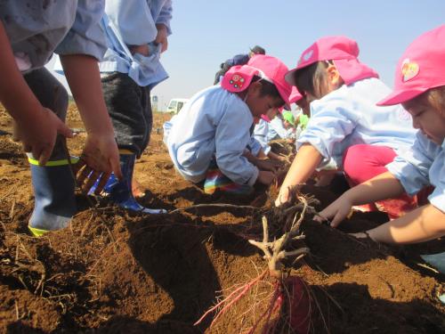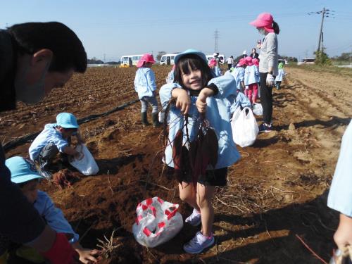 | 雨で延期になったいもほりですが、秋晴れの中、畑に行くことが出来ました。 これまで学園の食育教育にご協力いただいてきた村田様の畑でのいもほりが今回で終わりを迎えることになり、これまでお世話になってきたことへのお礼を伝えました。 「一生懸命お世話をしてきたお芋なので、おいしく食べてほしいです。このお芋はてんぷらがおいしいですよ」と声をかけていただき、持ち帰ったお芋をさっそくてんぷらにしてもらって食べたよと話してくれました。 いろいろな方のご協力があって、体験できることがあります。感謝の気持ちを忘れずに、お芋を見たら広い畑でほった芋ほりの様子を思い出してほしいと思います。
