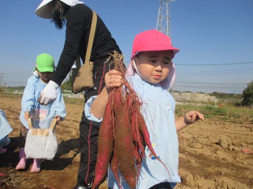 | 顔と同じくらいのお芋だよ! おもた~い。 | 頑張ったでしょう!! ちょっと疲れちゃった。 | かわいいお芋とにっこり! |