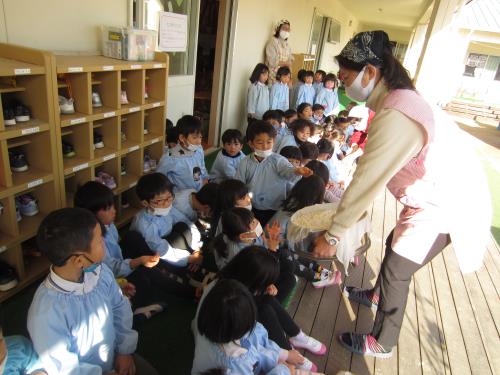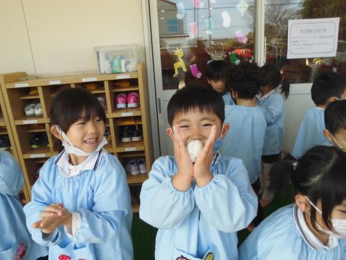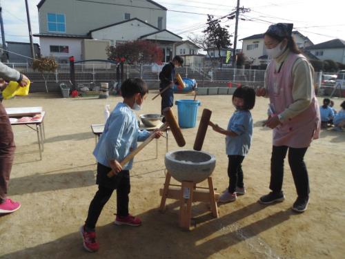 | 例年SKT合同で行っている「もちつき」ですが、今年度も新型コロナ感染拡大防止対策を考慮し、自園で開催しました。 園庭の一角でかまどで火をおこし、薪のにおいに「園長先生!おもちつきの準備してるんでしょう」「けむりのにおいがするよ」と登園して直ぐ、準備の様子に気付き声をかけてくれました。 伝統行事を体験するなかで、便利になったものに気付いたり、昔の暮らしを想像したり、一つの体験からいろいろ学ぶことが出来ました。 例年通り「年長もちつき体験」とともに「ミニもちつき」を他学年児は体験しました。柔らかいつきたてのお餅は一人一人に分けられ、感触を楽しみました。中には優しく包み込んでいるうちにくっついてしまい、大変なことになっている場面もありました。 もちつきを五感で楽しむことが出来ました。