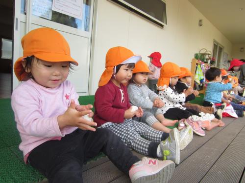 | | こんなにまーるくできたよ。 | 小っちゃくてもコロコロすれば丸くなるんだよ | 2歳児さんのもちつき! つくより、こねこねがたのしそうです。 |