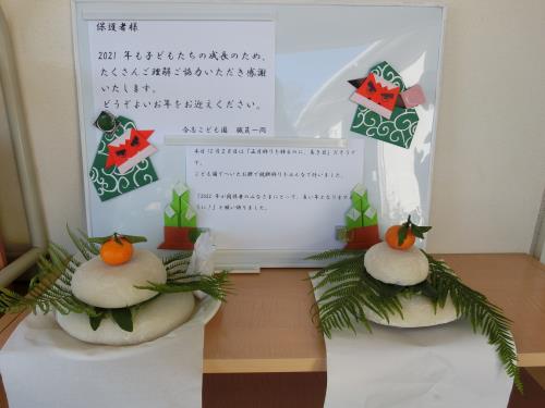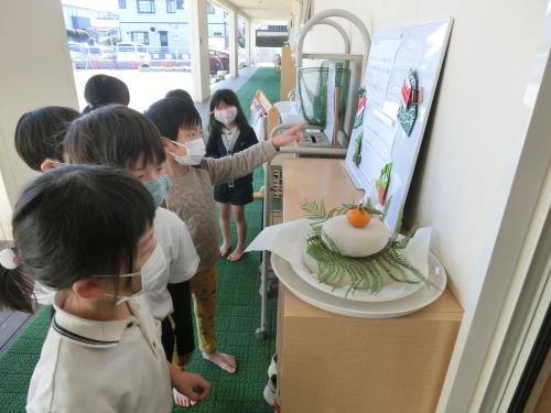 | 年長さんには、鏡餅の形作り方を伝えました。台の上で、包み込むように餅を動かす。 上手にできていました。 | 今年は以上児・未満児わかれて自分たちで鏡餅を飾り付けました。それぞれの意味を聞いたり、お当番が順番に飾りました。 | 二つ並んだ飾り餅。 年神様を迎える準備万端です。みんなにとっていい年になりますように!! |
