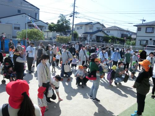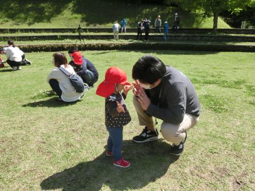 | 天候にも恵まれ、3年ぶりにお見知り遠足を実施しました。コロナ禍であることで、マスクを着用しての遠足となりました。戸外活動ですが、お友達との距離が近かったり、親子で触れ合う活動内容時には、気温上昇による熱中症も気掛けながら「マスクの着用」に取り組みました。 飯高山は日ごろから散歩や展望台のぼりや広場遊び等で利用している、地域の公共施設です。今回遠足の会場に選んだのは、「日ごろどのような場所を利用しているのか。どのようにして散歩に出かけているのか。安全に行くにはどのようなところに気を付けているのか。」等を保護者の皆様に体験していただくこともねらいとしていたからです。 親子で歩いていく道のりは、こども達のとっても特別だったようです。笑顔で会話したり、ここ気を付けていくところだよと教えたり、保護者様もしっかりとした足取りで歩く我が子に笑顔があふれていました。こども園は地域を生かした活動を大切にしています。これからも季節の移り変わりを飯高山で沢山体験していきます。休日にまた足を運んでいただけると、新しい発見ができると思います。