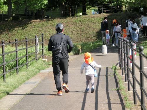 | おとうさん、おかあさんに手を引かれての遠足。 子どもたちの心はわくわくしているようです。 | 「みんな!まって~」途中の川やタンポポの綿毛に興味を示したけど、おくれちゃった~と、お父さんと追いかけました。 | 「道路の右側。なるべく端っこを歩く。」 おうちの方に伝えながら進んでいました。 |
