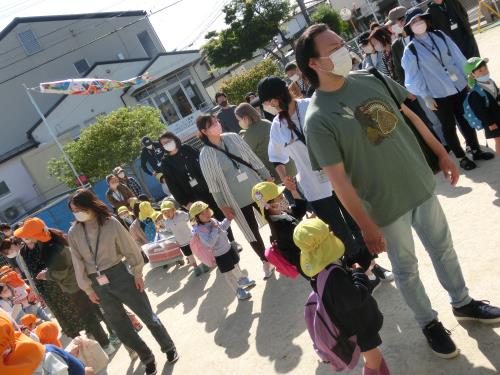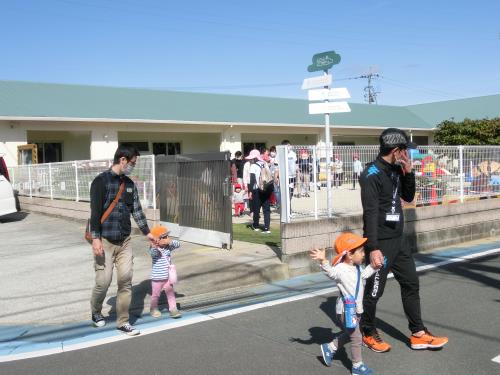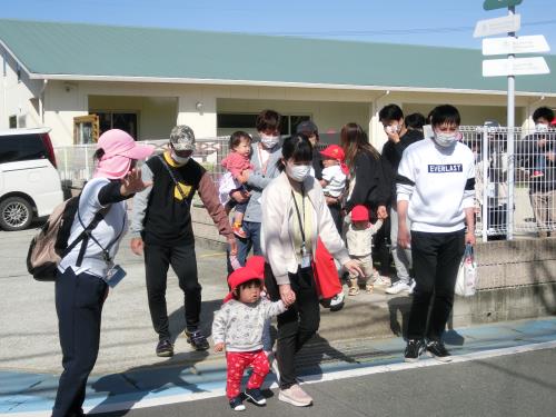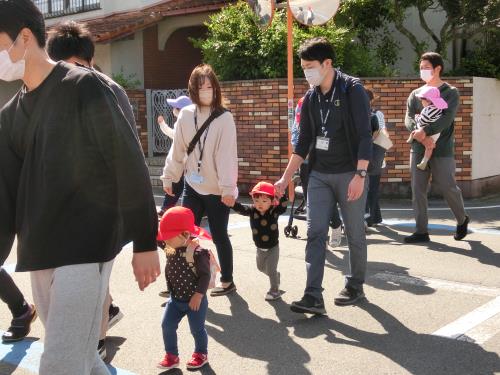 | | 出発前の集まりで、「日ごろどのように散歩や園外活動に取り組んでいるのか」今日は体験してください。と伝えました。 | 保護者と手をつないで出発です。 大人が車道側につきます。 いつもは守ってあげる役目の年長さんも今日は守っていただき嬉しそうです。 | 土曜のお休みを調整して、お父様方も沢山参加されました。園行事への参加に感謝いたします。 楽しんでください。 |