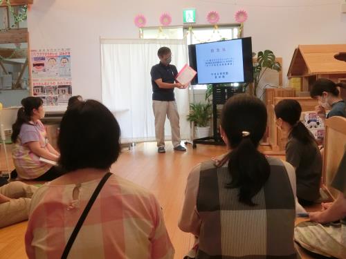 | 安全管理に努め、こども達を見守ってくださっている先生が講師となり、夏場の安全研修を実施しました。先生は「プール指導員」の資格をもっておられ、救急法も学び新しい知識を得るように自ら学ばれています。今回は「熱中症」「水場の救急対応」を研修内容にまとめ講義や実技を交え全職員で学ぶことができました。 【子どもは汗をかくことも、大人に比べ未発達なため体に熱をためやすく熱中症になりやすい。】 子どもの高さで、Wetb(暑さ指数計測器)を確認することが必要であること、戸外遊び前に確認することで、こども達の命を守ることにつながる。