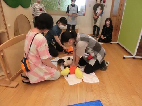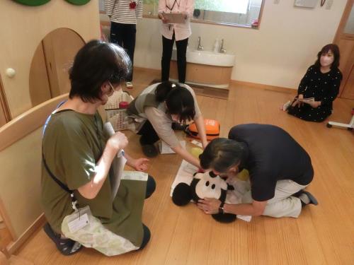 | | 水の活動が始まります。事故が起こらないことが一番ですが、もしもに備えて、全職員で研修に取り組みます。 | 新任の先生も心肺蘇生法を学び、大切な命を守る練習を行いました。 | チームで対応することで、命を救うことにつながります。 「代わります。123はい!」 連携もばっちりです。 |