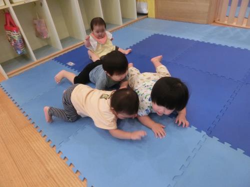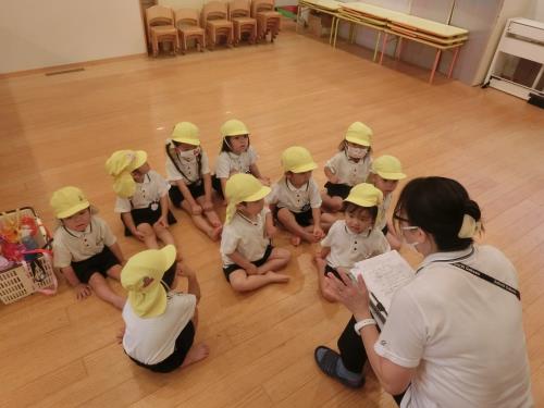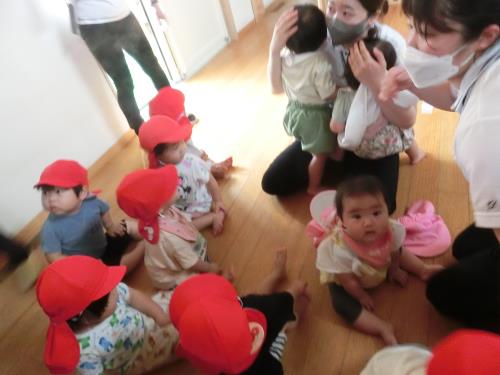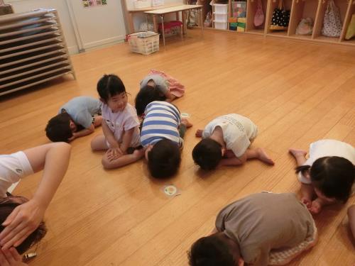| 大切な頭を守ることが大切であることを伝えました。 ダンゴムシ!子どもたちにとって共通言語です | らっこ組さんのダンゴムシは・・・ごろりとねる。となっていました。例えでもわかりにくい年齢があるようです | うさぎさんのダンゴムシ。小さく頭を守るポーズができています。 |