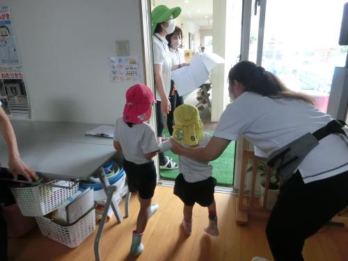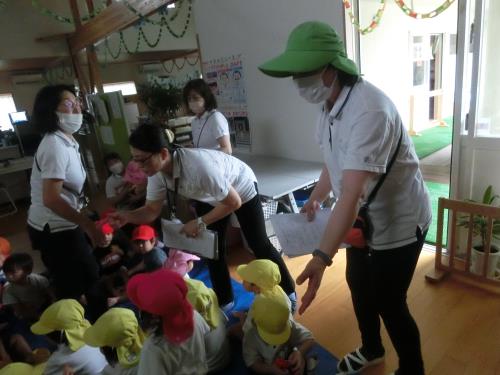 | 6月25日、朝から雨脚がひどく「お迎え訓練」実施もあやぶまれたなか、こども達が園へ登園し終えたころには雨もやみ訓練内容を変更して実施しました。 平成28年の熊本地震から丸6年。その後当時レベルの地震は起こっていませんが、規模が小さくなった地震は今でも時々起こっています。これまで幸いにも、こども達がこども園を利用している時間に大規模な地震発生はありませんが、園では地震を想定した訓練にも取り組んでいます。地震だけでなく、地震後火災が起こった場合・避難場所を移動する場合等です。今回のお迎え訓練も非常事態を想定し計画しました。 仕事に行っているとき「緊急迎え」対応をしなければならなくなった場合、保護者の誰がどのようにしてこどもを安全に引き取ることができるか?これまで想像されたことはありますか。 緊急事態ではだれでも冷静な判断力が低下します。行動を想定して訓練しておくことは、命を守る行動としてとても大切なことです。こども達は毎月の訓練を通して、「自分の命は自分で守る」ことを考えて行動するようにしています。今回の訓練を機にご家族で連絡方法・引き取り方法等検討されてみてはいかがでしょう。 訓練の翌日21時過ぎに、美里町を震源とする地震が起きました。あまりにもタイムリーな地震に驚くとともに、訓練の重要性を実感しました。「命を守る行動」を再確認していきましょう。