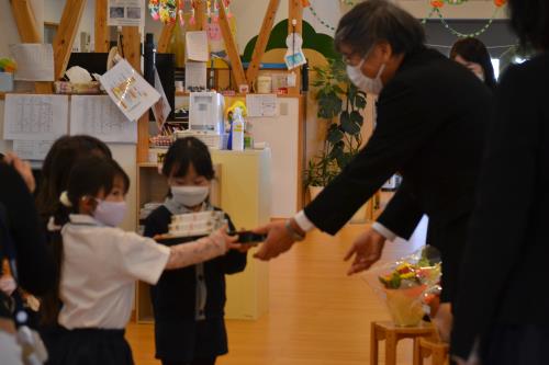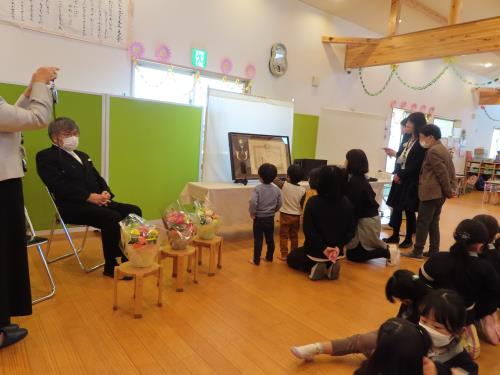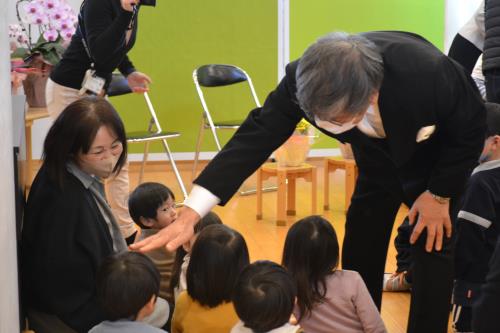 | | 理事長先生の温かい大きな手で頭を撫でて頂き、嬉しそうでしたね | やはり勲章が気になるこども達。形や色も心に刻んでいるかのようです | 各クラス、見せていただく間も理事長先生は温かく見守ってくださいました。