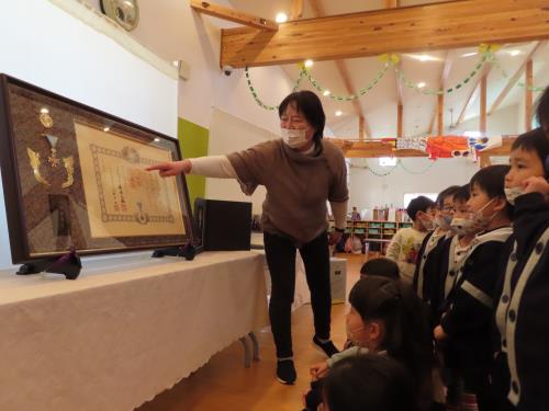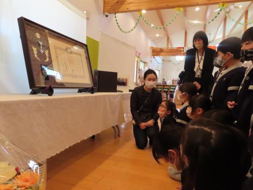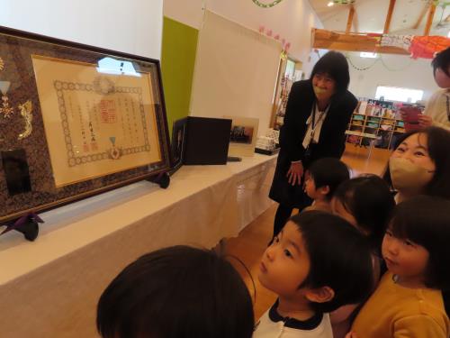 | | きらきら輝く勲章にみんなの心も釘付けになっていました。 | 菊の御紋について、話を聞き実際に目にすることで理解も深まりました。 | いつもはこれは?これは?と興味を持ったことを尋ねるこども達ですが、この時ばかりは真剣に見入っていました。 |