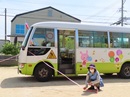 | | バスが事故になった時、非常口から避難することを体験しました | 幼稚園バスの先生も協力いただきました