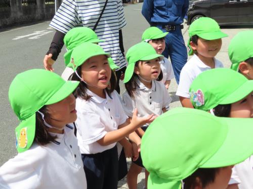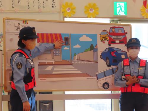 | | 年長児には、少しレベルをアップした安全確認を習いました | まず、渡り始めは「右側からくる車」半分を過ぎたら「左からくる車」を確認することで、大きな道路を横断する時により安全に渡ることができると学びました | 3歳児については、左右の認識を持つことを指導していただきました。日ごろから、左右を意識した行動も大切ですね |
