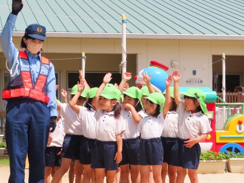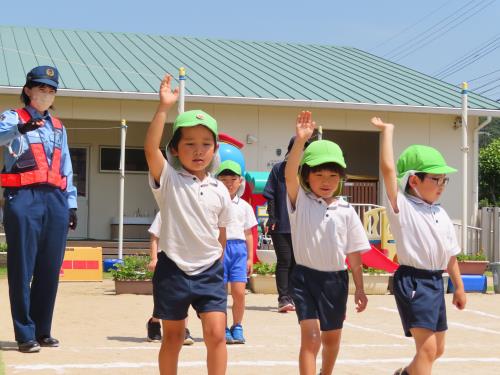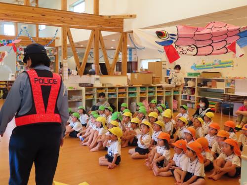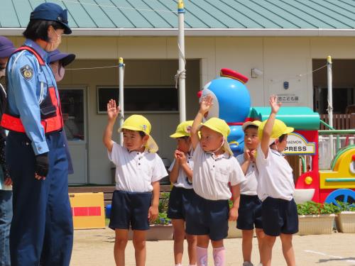 | 新学期を迎え、園では安全に過ごすための方法を再確認するため、避難訓練、バス避難訓練、交通安全指導活動に取り組んでいます。 どのような状況が起きた時にも落ち着いて行動できるためには、「命を守るためにどうやったらいいか」を自分で考え判断することが重要です。毎月の避難訓練も様々な状況を想定し、実施しています。そのなかで一番大切なのが、「指示を聞く力」です。状況を判断して行動できることは大切ですが、集団で過ごしているため個人行動は一番の命取りにつながります。非常事態の時に話を聞くためにも、日ごろから意識をもって注意深く聞くことができるように、こどもたちとも取り組んでいます。話を聞くことは、家庭でもできます。普段から読み聞かせに取り組んだり、会話を通して声色の違いを体験しておくことで、状況を読み取る力にもなり、こどもを取り巻く経験すべてが関係していると言えます。経験を関連付けて生かしていく力を育ててまいりましょう。